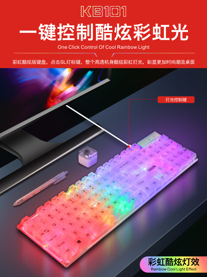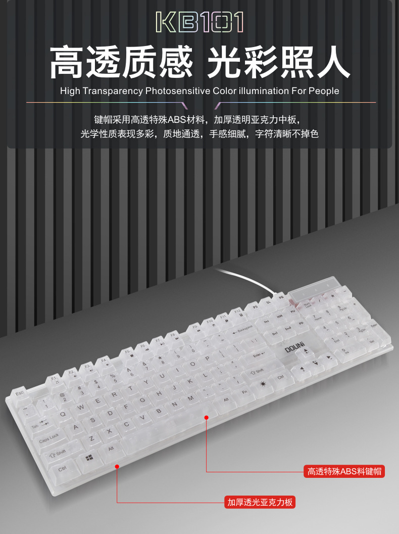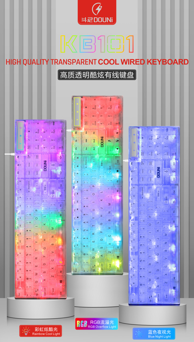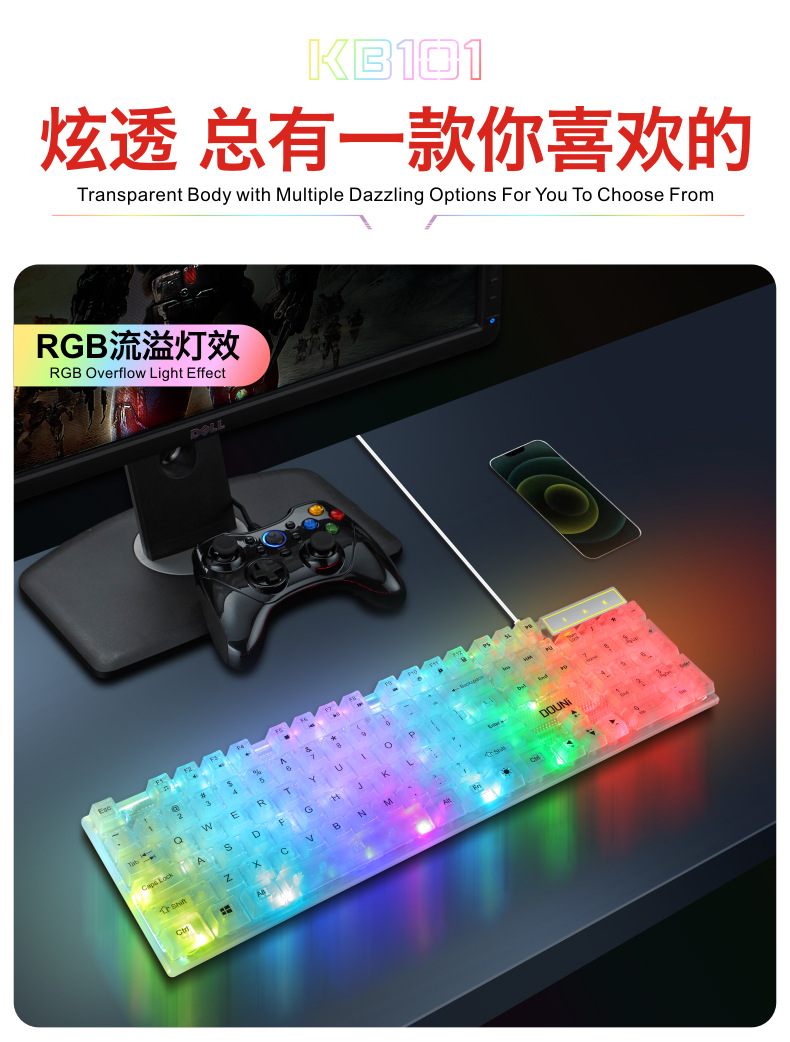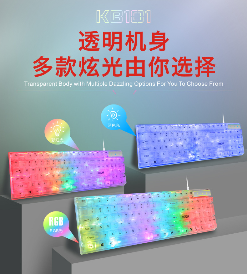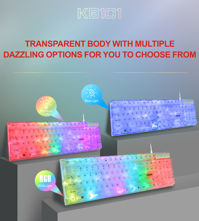 두니 KB101 7색 발광 RGB 유선 투명 키보드, 기계식 느낌의 컴퓨터 게임용, 해외 도매