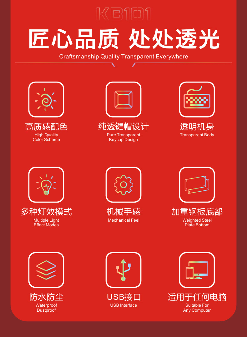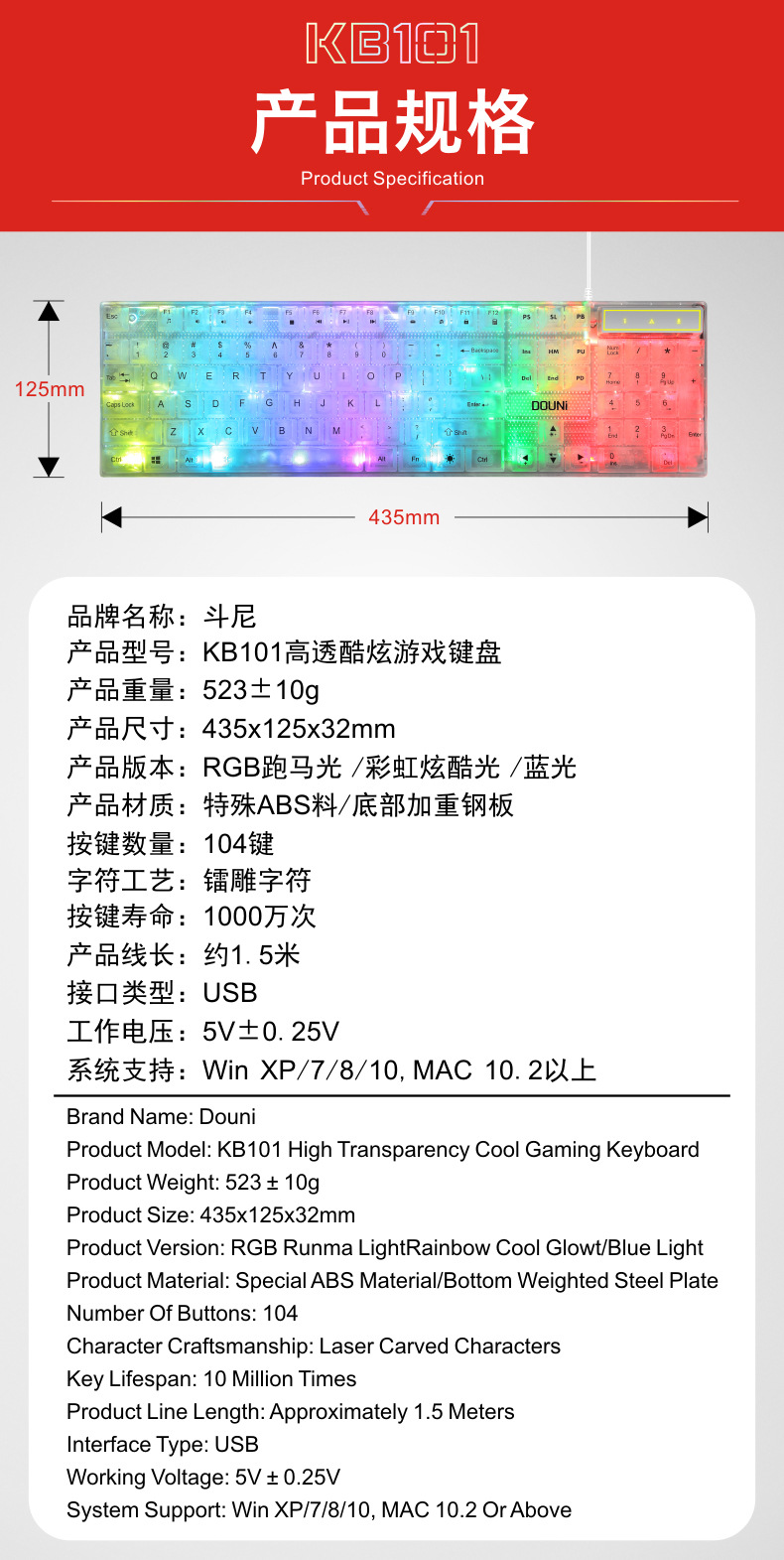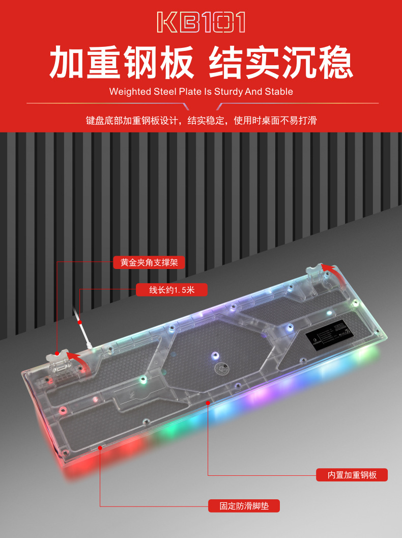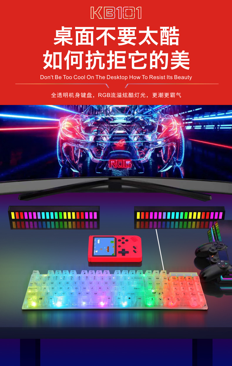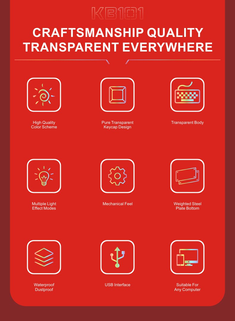 두니 KB101 7색 발광 RGB 유선 투명 키보드, 기계식 느낌의 컴퓨터 게임용, 해외 도매