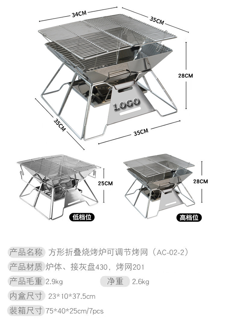 产品名称:方形折叠烧烤炉可调节烤网(AC-O2-2)