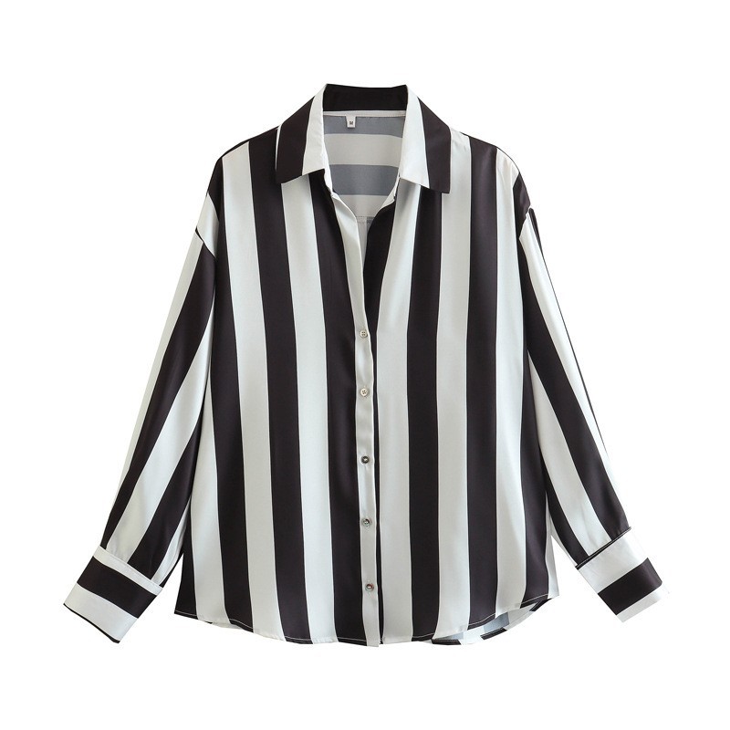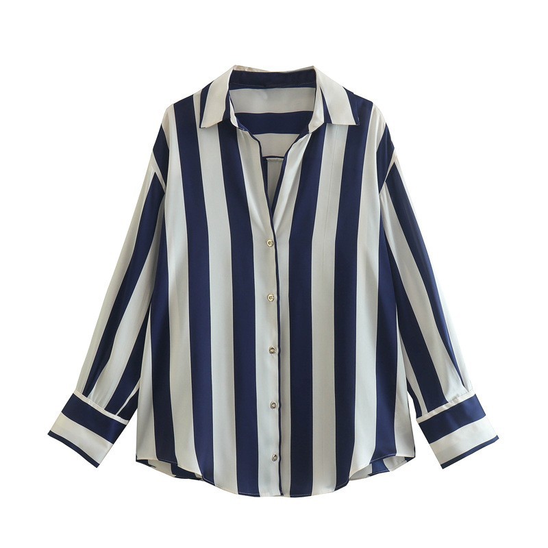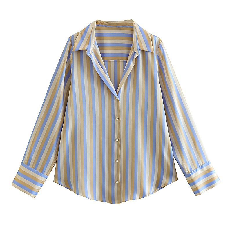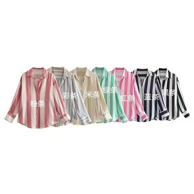 국경 간 대외 무역 도매 줄무늬 유럽과 미국 스타일의 디지털 인쇄 줄무늬 실크 새틴 질감 드레이프 셔츠 느슨한 캐주얼 스타일스토어 가기