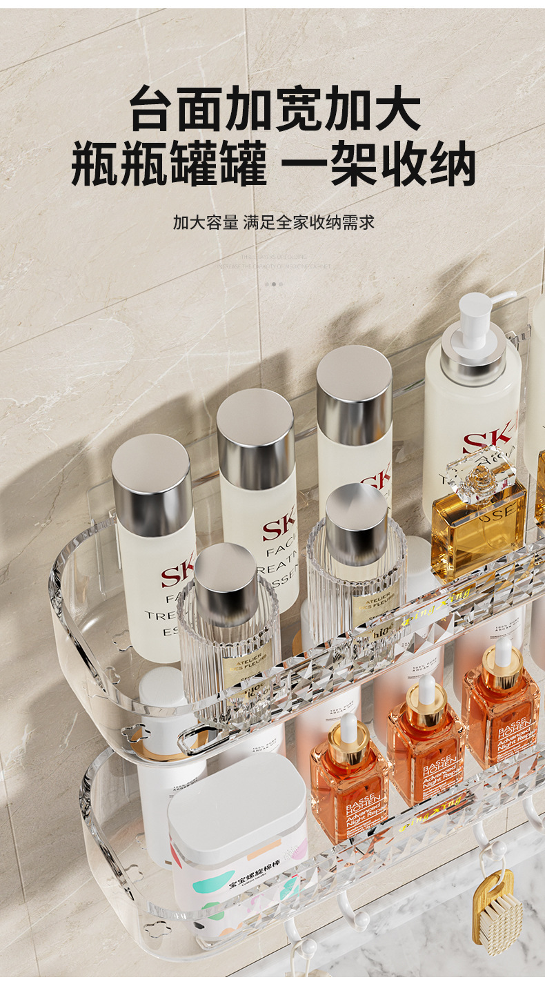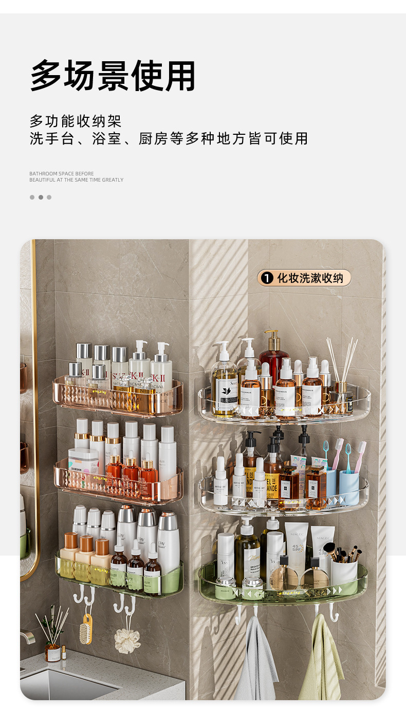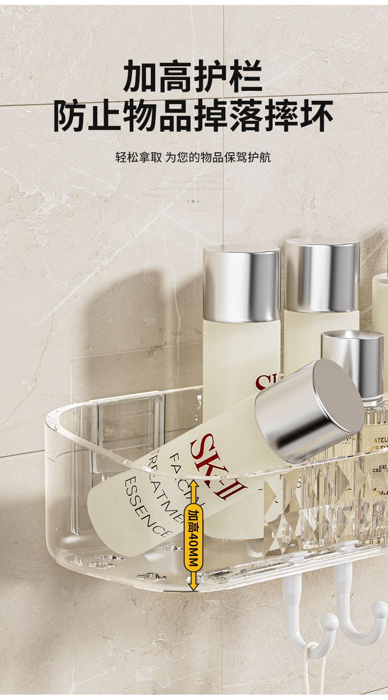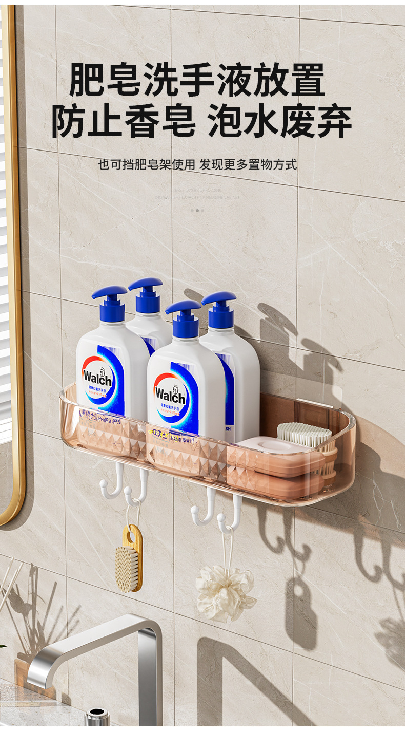 새로운 PET 가벼운 고급 투명 스토리지 랙 욕실 세척 화장품 주방 욕실 펀치 프리 벽 교수형 보관