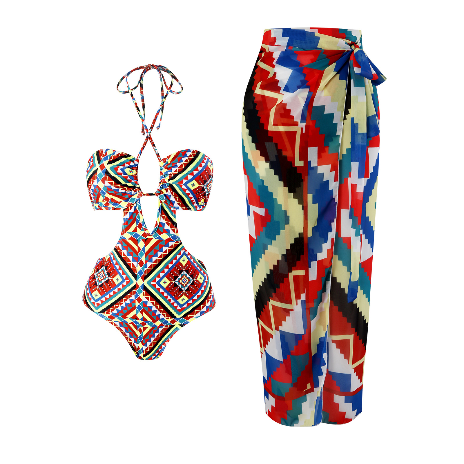 2025现货欧美性感连体泳衣拼色印花两件套涤纶裙热卖爆款泳装套装