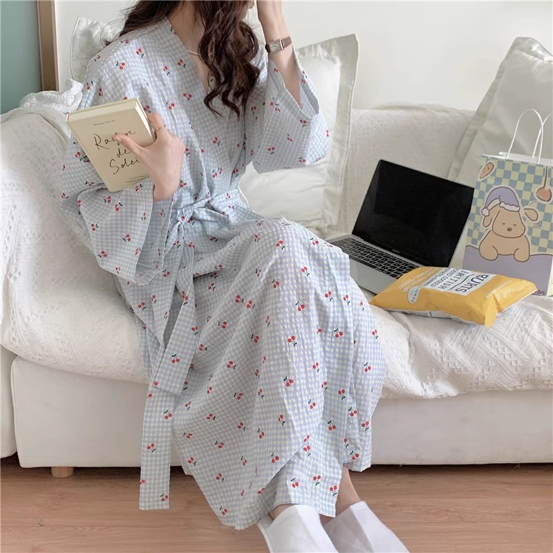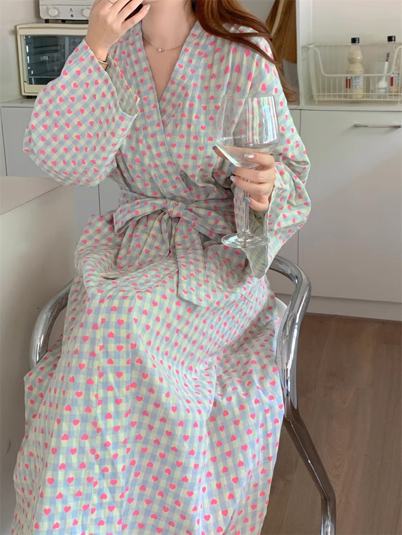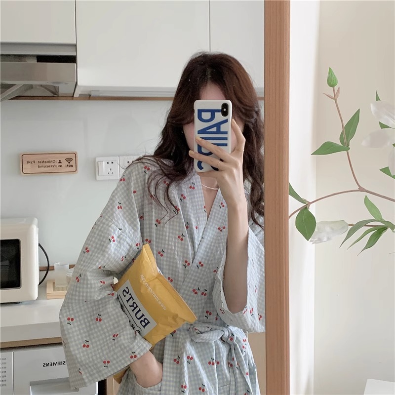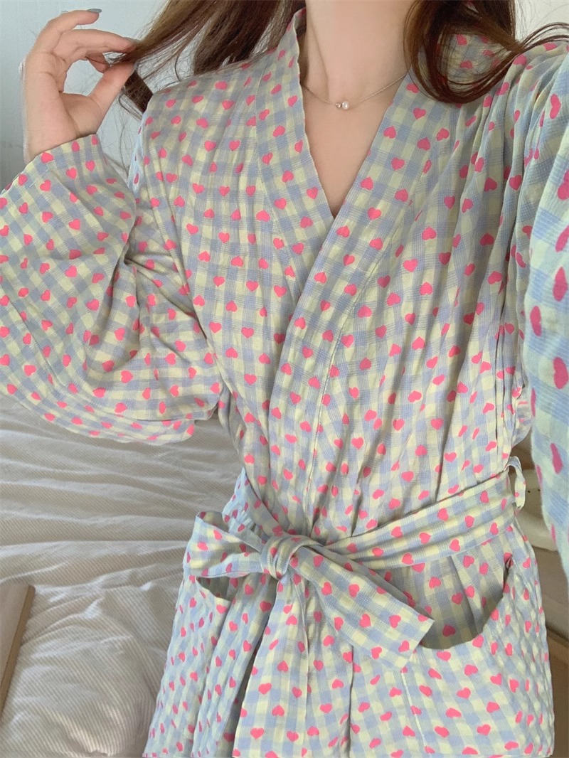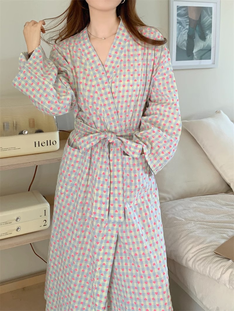 일본식 잠옷 목욕 가운 여성 잠옷 가을 새로운 달콤한 사랑 격자 무늬 느슨한 긴 소매 긴 Instagram 스타일 기모노스토어 가기