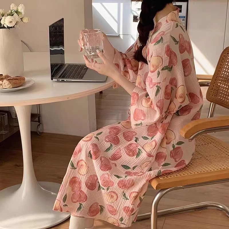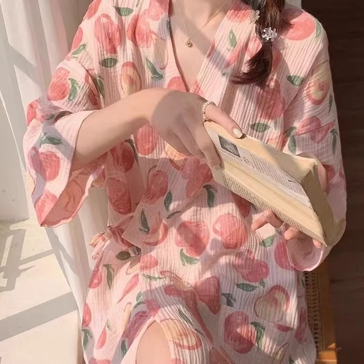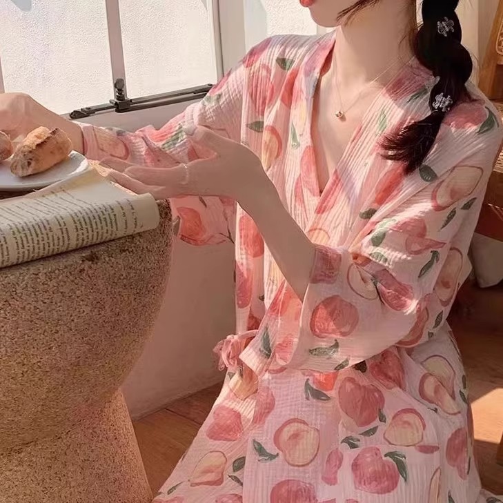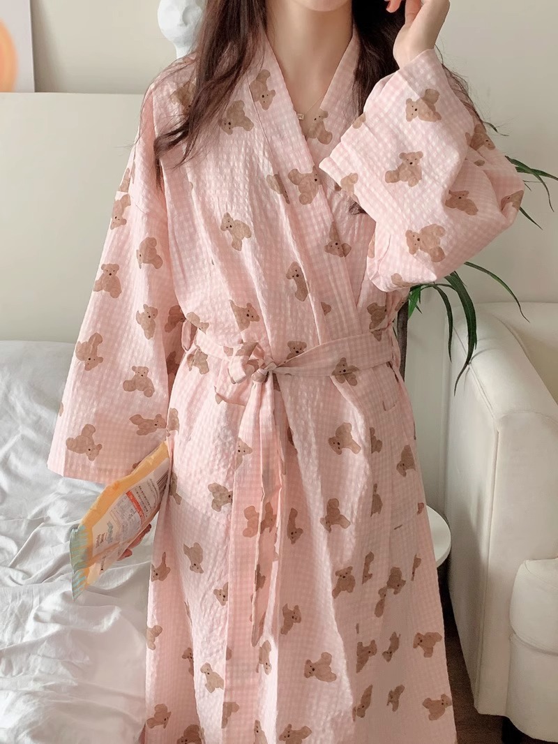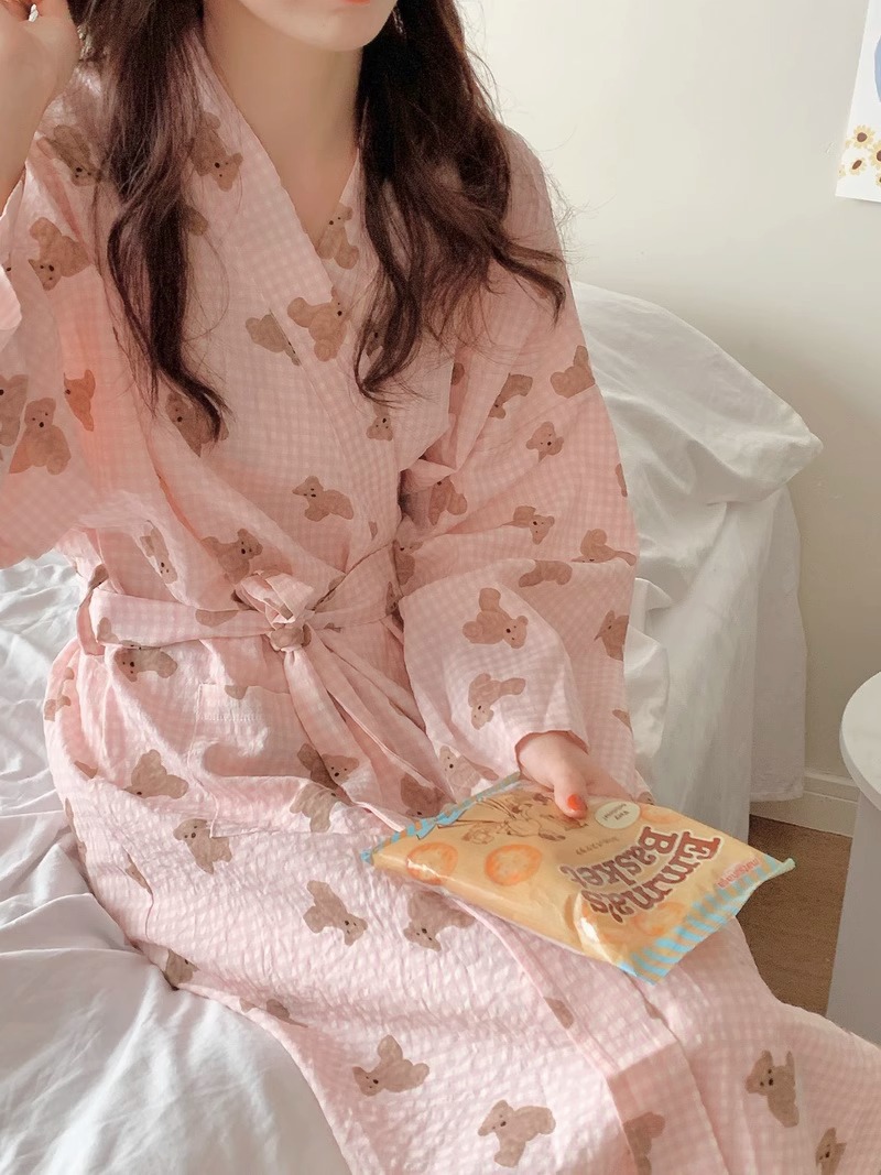 일본식 잠옷 목욕 가운 여성 잠옷 가을 새로운 달콤한 사랑 격자 무늬 느슨한 긴 소매 긴 Instagram 스타일 기모노스토어 가기