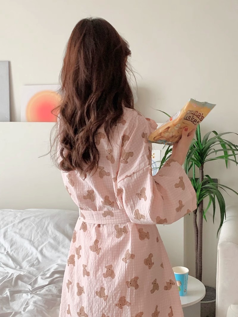 일본식 잠옷 목욕 가운 여성 잠옷 가을 새로운 달콤한 사랑 격자 무늬 느슨한 긴 소매 긴 Instagram 스타일 기모노