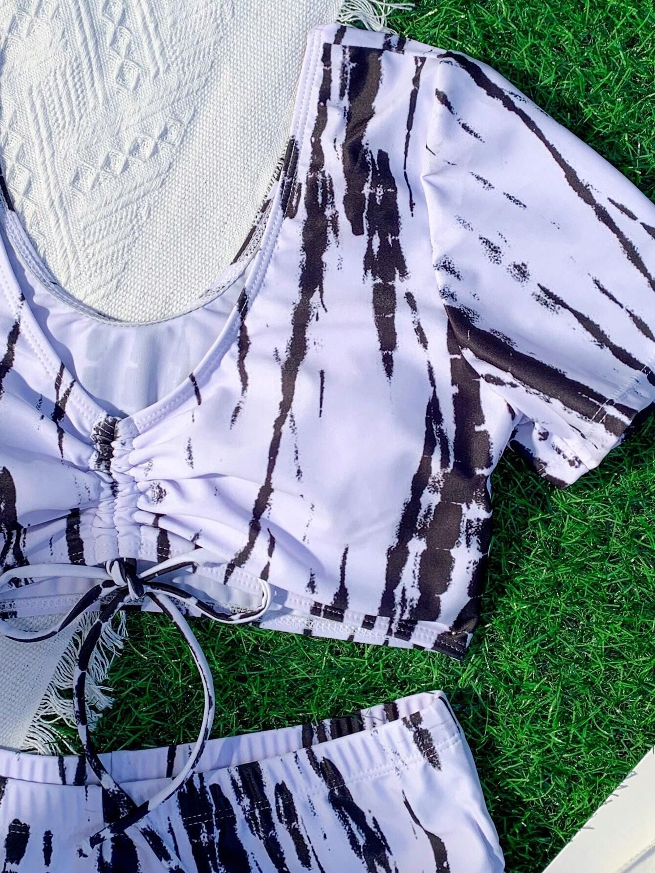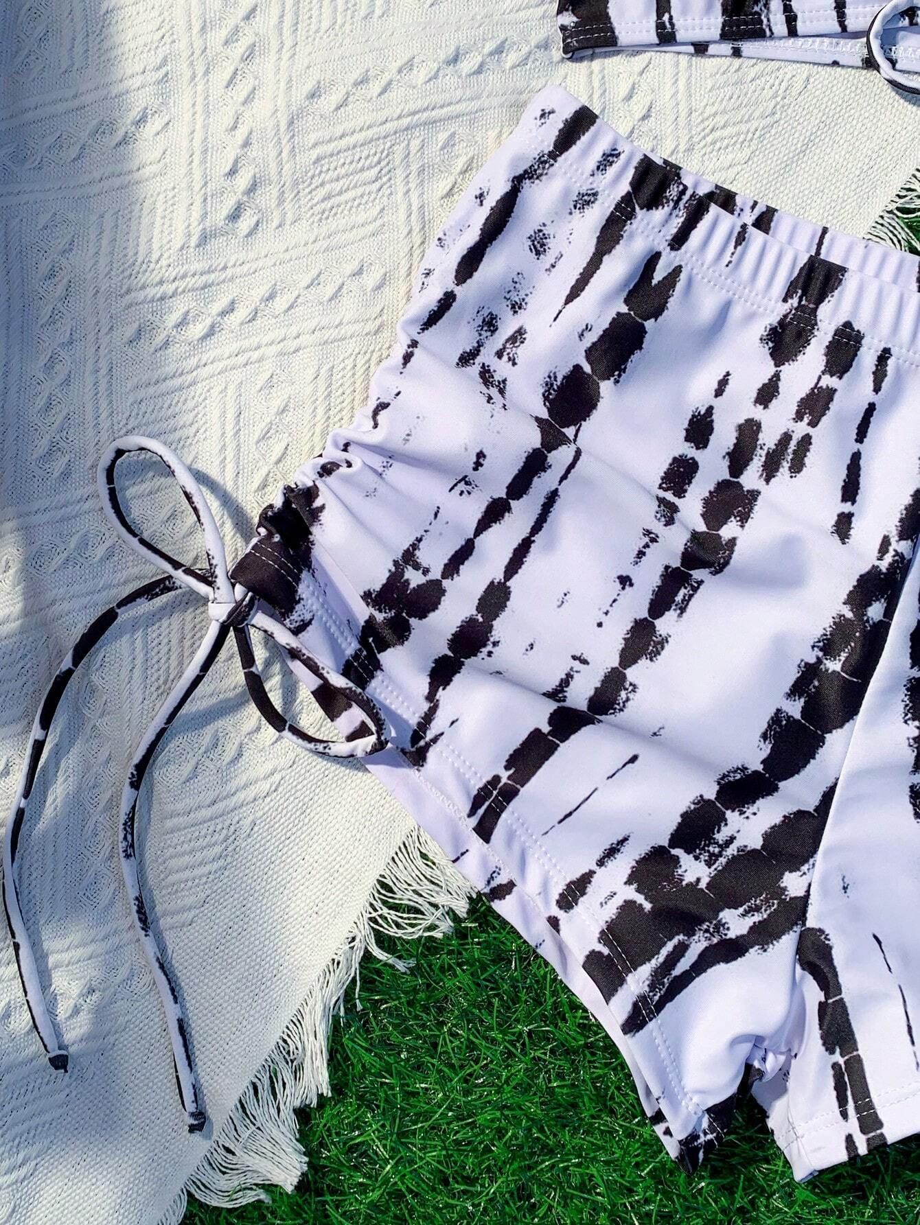 2024 새로운 유럽과 미국의 국경 간 여성 대외 무역 스플릿 수영복 흑백 레이스 업 라운드 넥 복서 수영복 세트