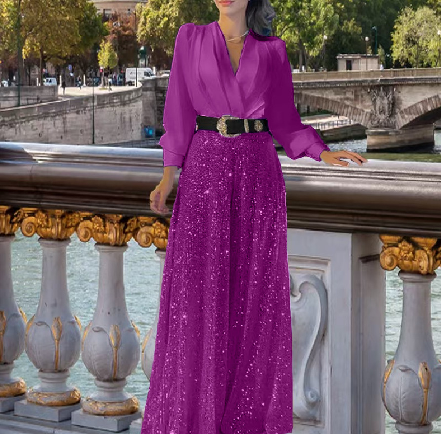 2025 드레스 여성 봄 가을 고급 브이넥 긴팔 셔츠 기질 우아한 허리 스팽글 프렌치 와이드 팬츠