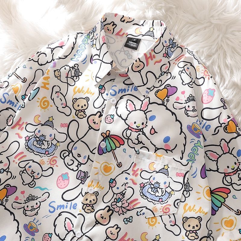 일본 부드러운 소녀 귀여운 재미있는 복고풍 만화 짧은 소매 셔츠 하와이안 스타일 대형 캐주얼 셔츠 남성과 여성
