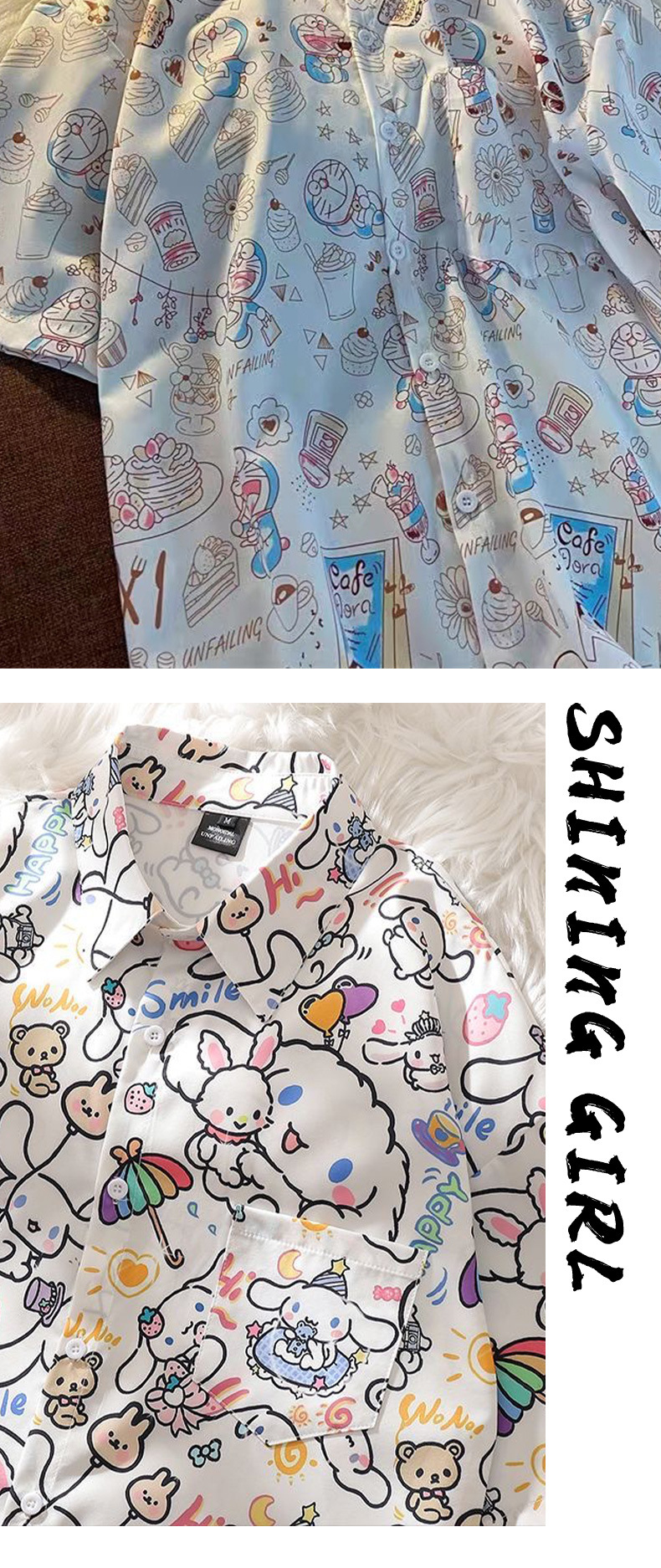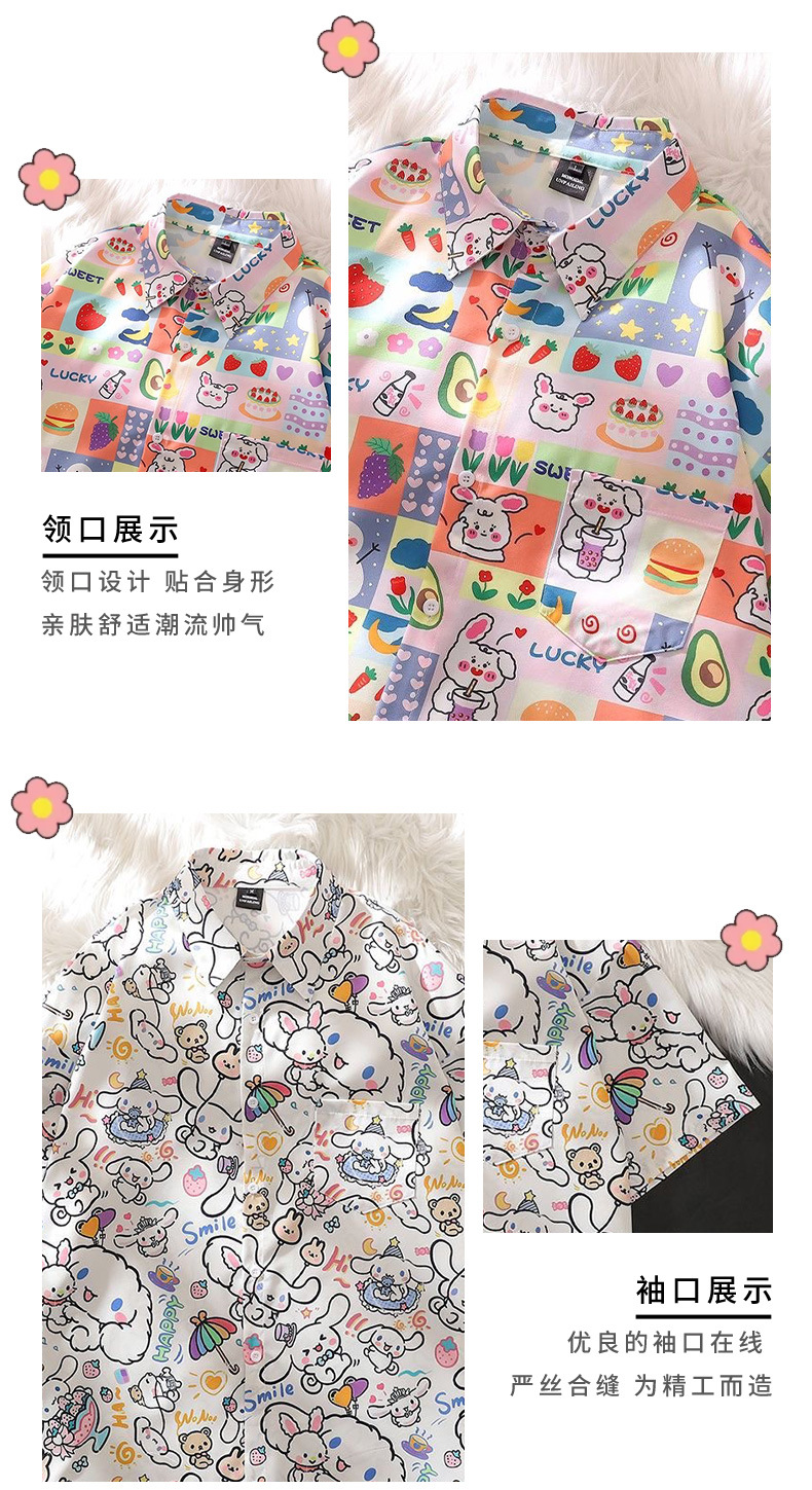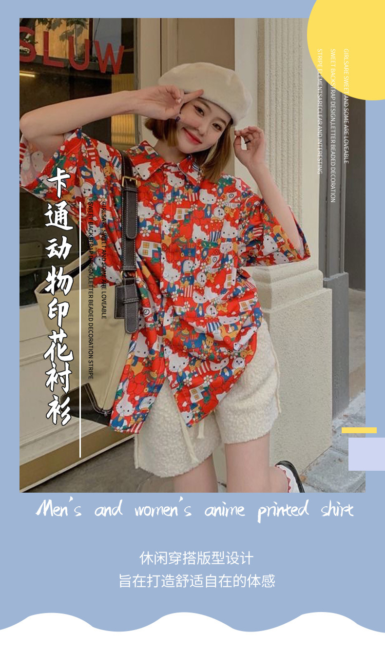 일본 부드러운 소녀 귀여운 재미있는 복고풍 만화 짧은 소매 셔츠 하와이안 스타일 대형 캐주얼 셔츠 남성과 여성스토어 가기