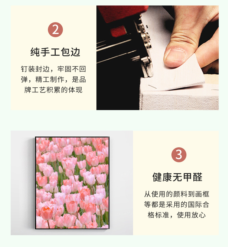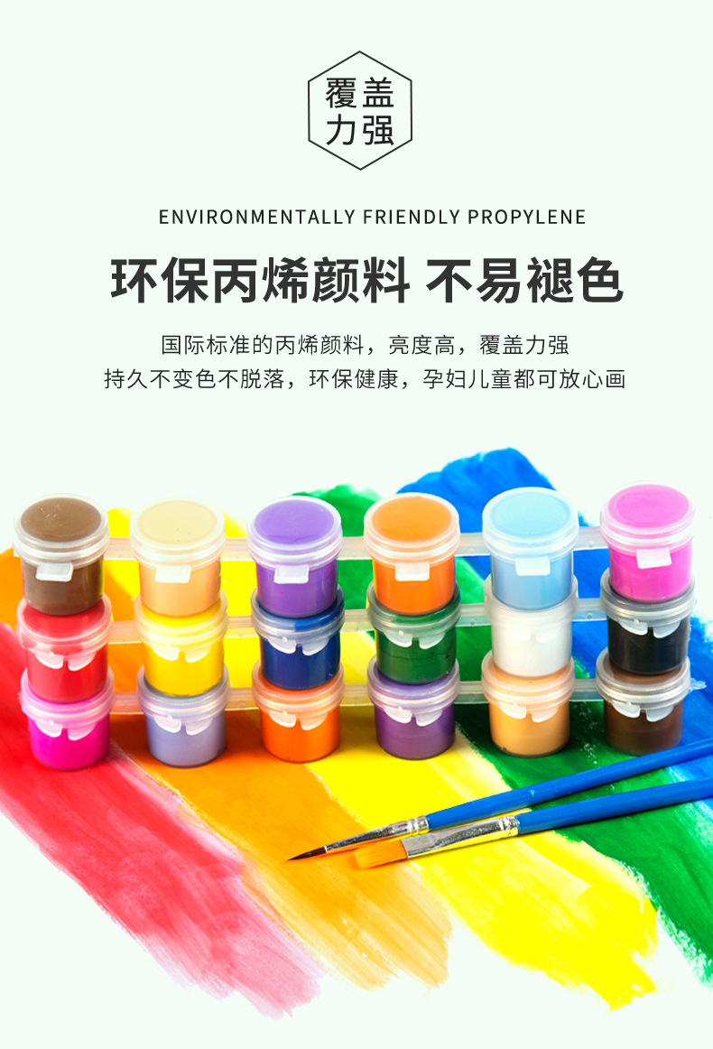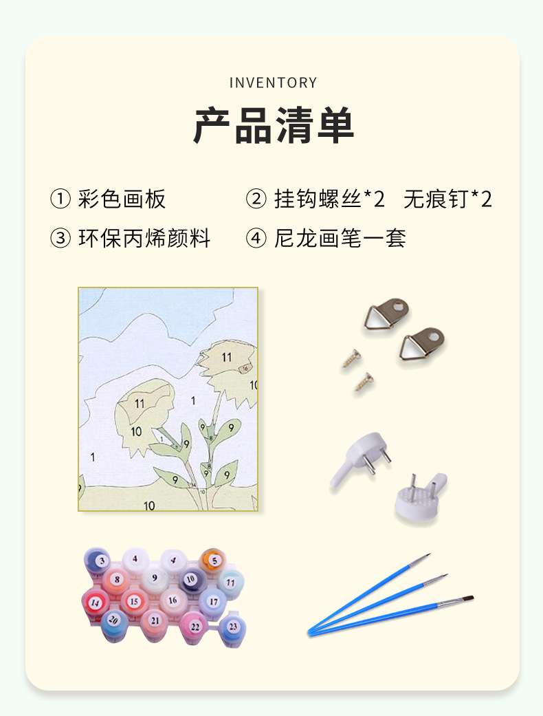 实木内框+颜料画笔(opp袋装):画布绷好内框的彩色画板+颜料+3支画笔+挂钩 ,opp袋包装;