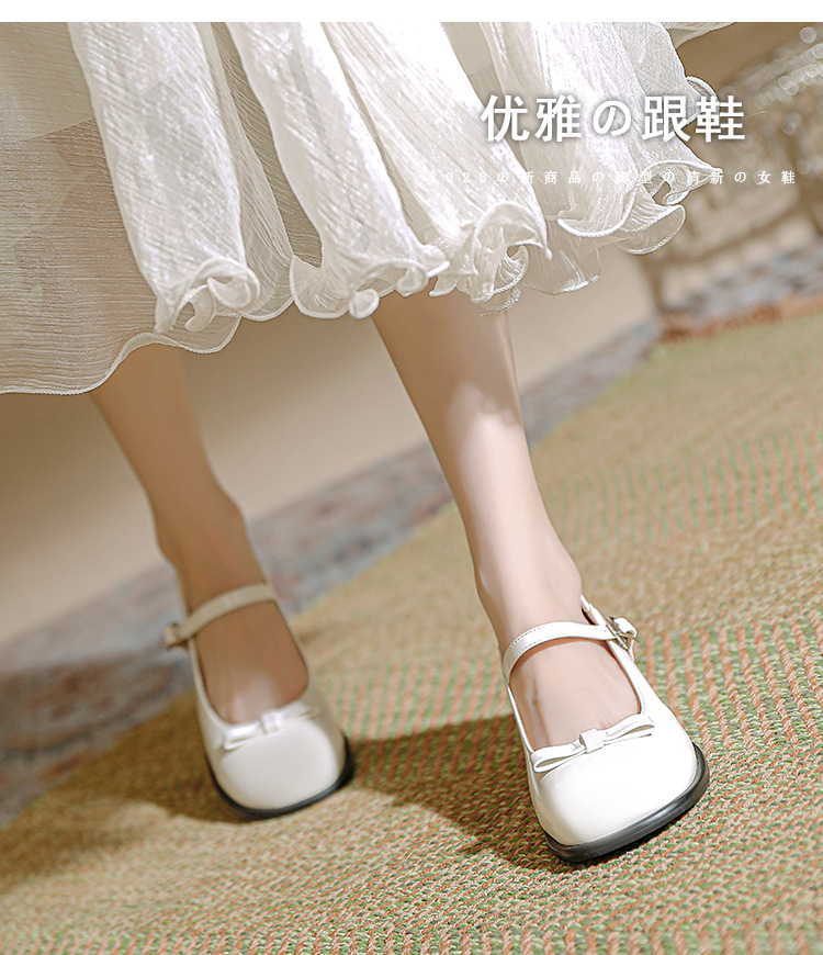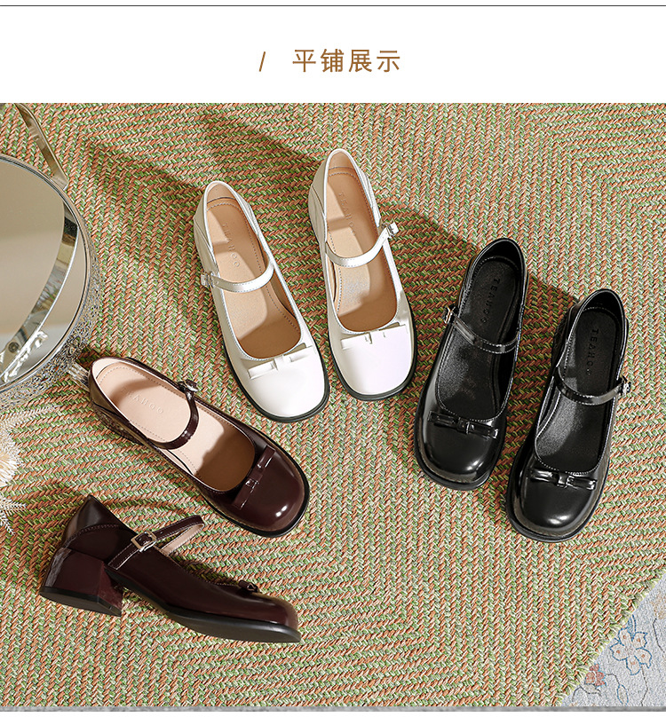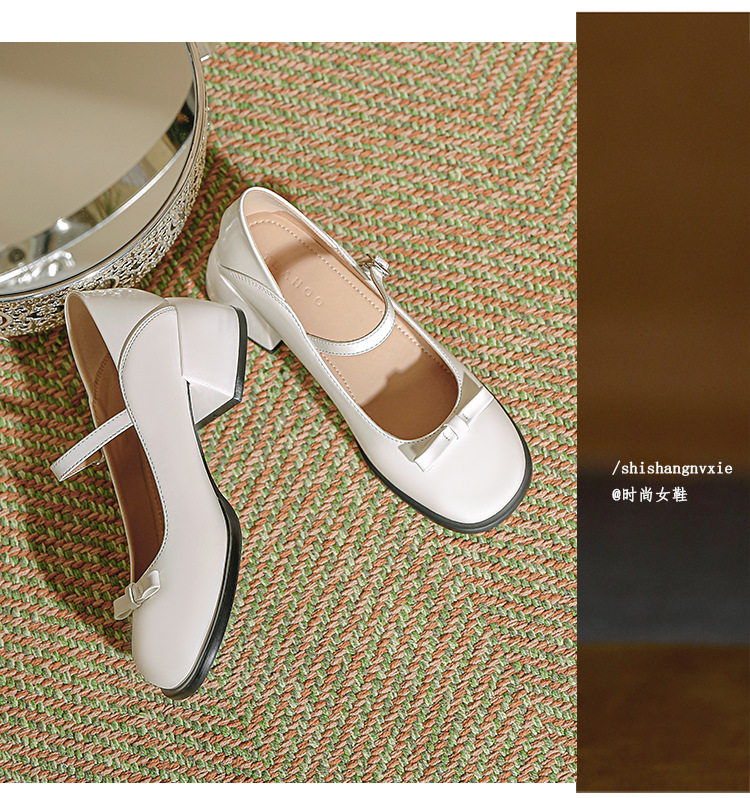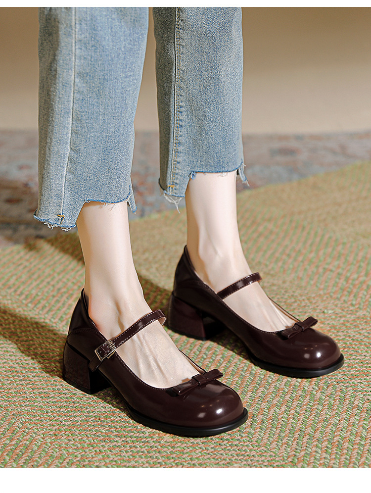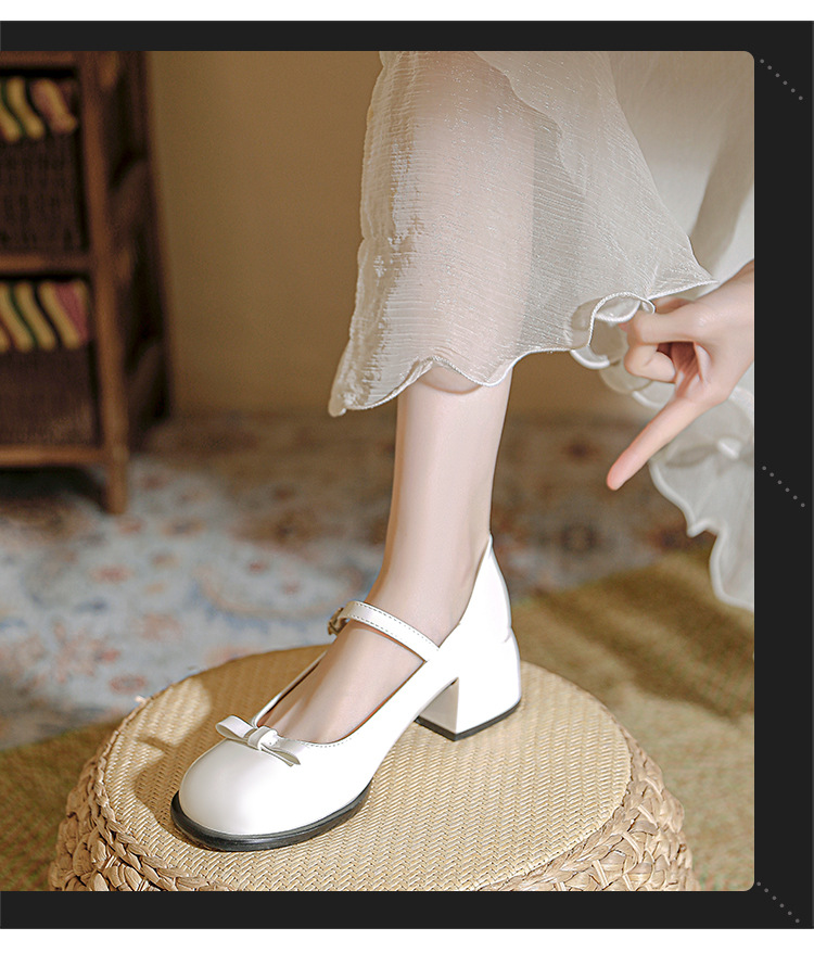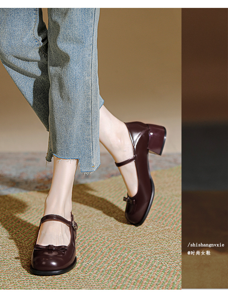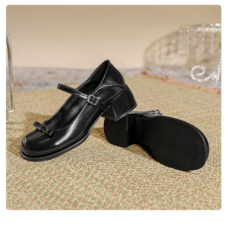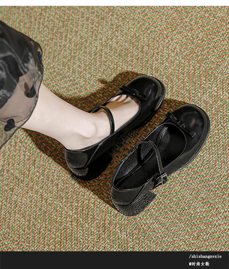 봄 2024 새로운 활 작은 단일 레이어 신발 여성용 청키 발 뒤꿈치 둥근 발가락 프랑스 얕은 입 Mary Jane 작은 가죽 신발 여성 신발