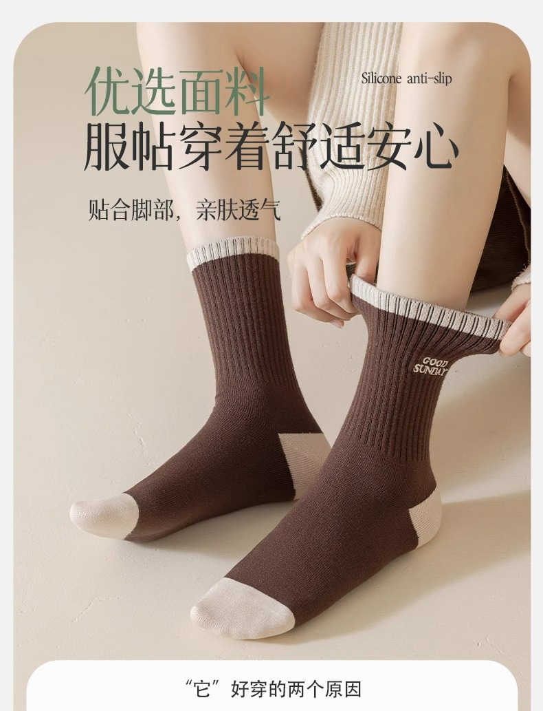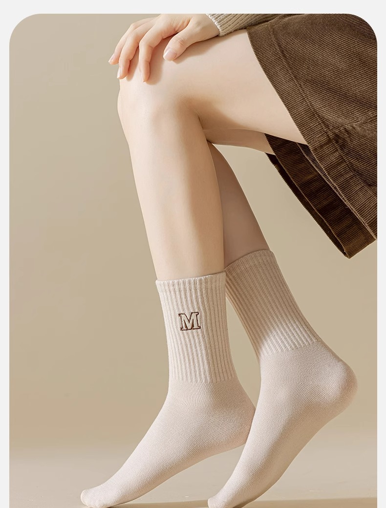 Zhuji 양말 여성의 가을과 겨울 중반 종아리 길이 양말 단색 두꺼운 Maillard 줄무늬 더미 양말 뼈없는 겨울 스타킹