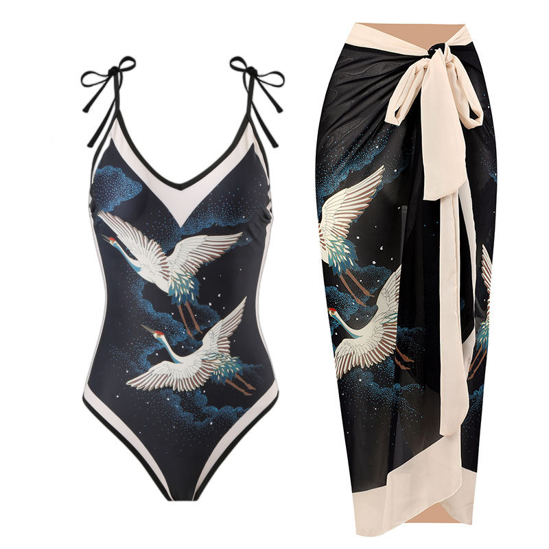 2024 유럽과 미국의 새로운 원피스 수영복 여성의 타이트한 슬리밍 레트로 대외 무역 레이스 업 수영복 세트 쉬폰 원피스