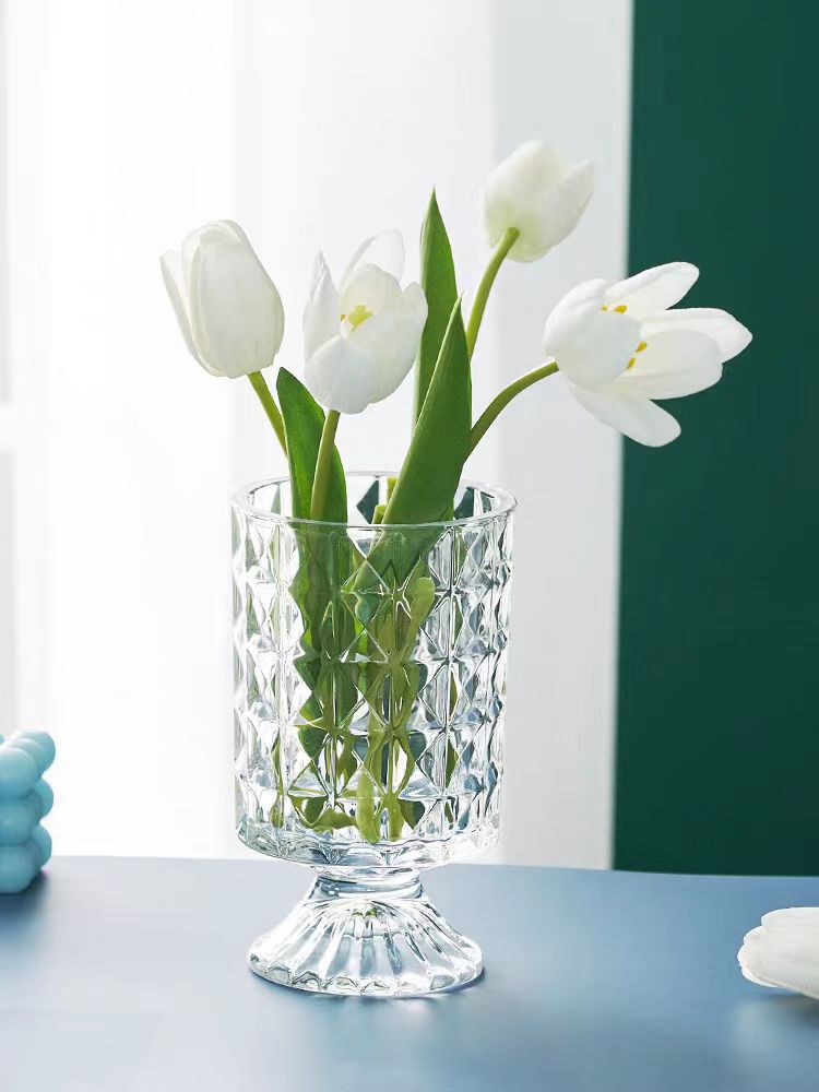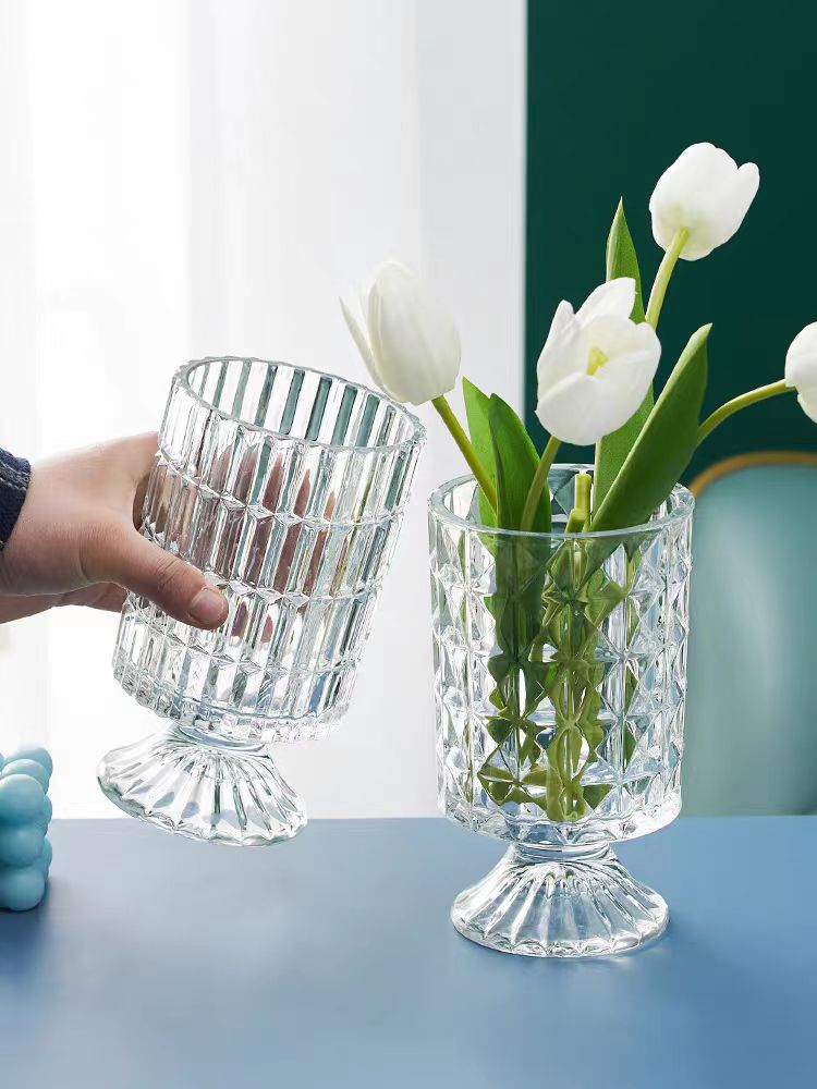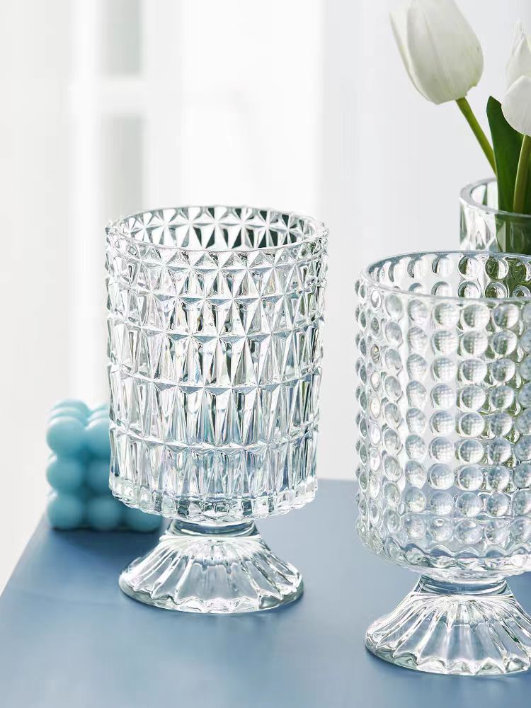 투명 양각 유리 꽃병 유럽 스타일의 키 큰 발 꽃 장치 현대 패션 수경 용기 홈 장식 장식품
