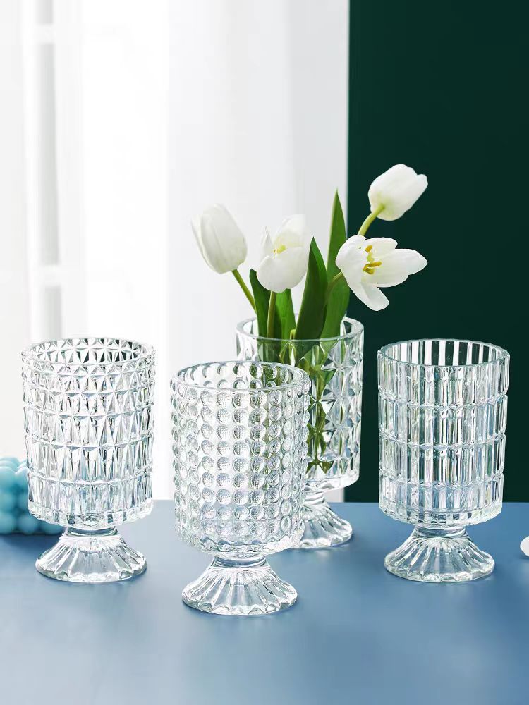 투명 양각 유리 꽃병 유럽 스타일의 키 큰 발 꽃 장치 현대 패션 수경 용기 홈 장식 장식품스토어 가기