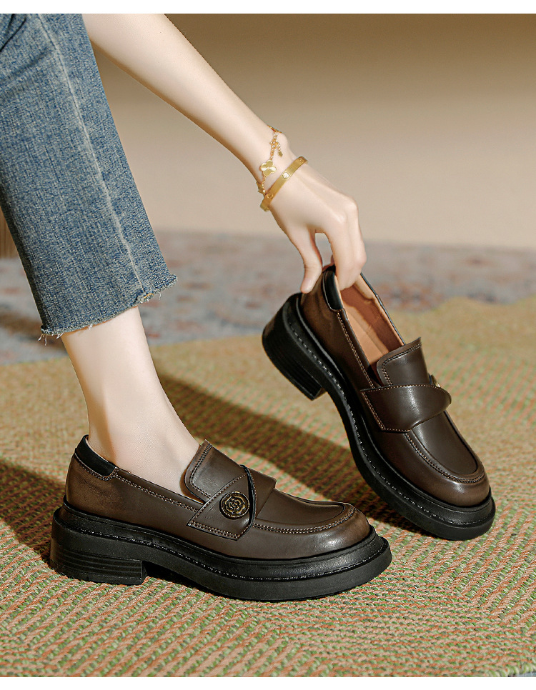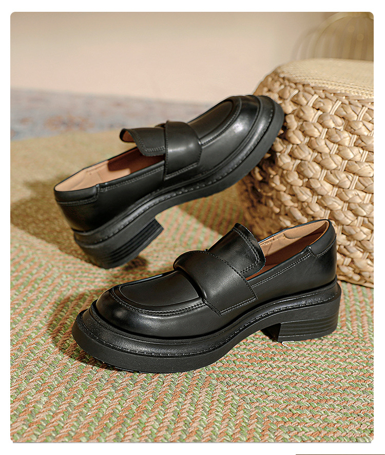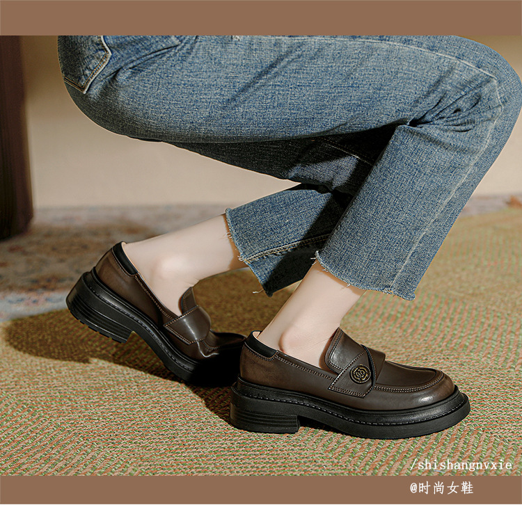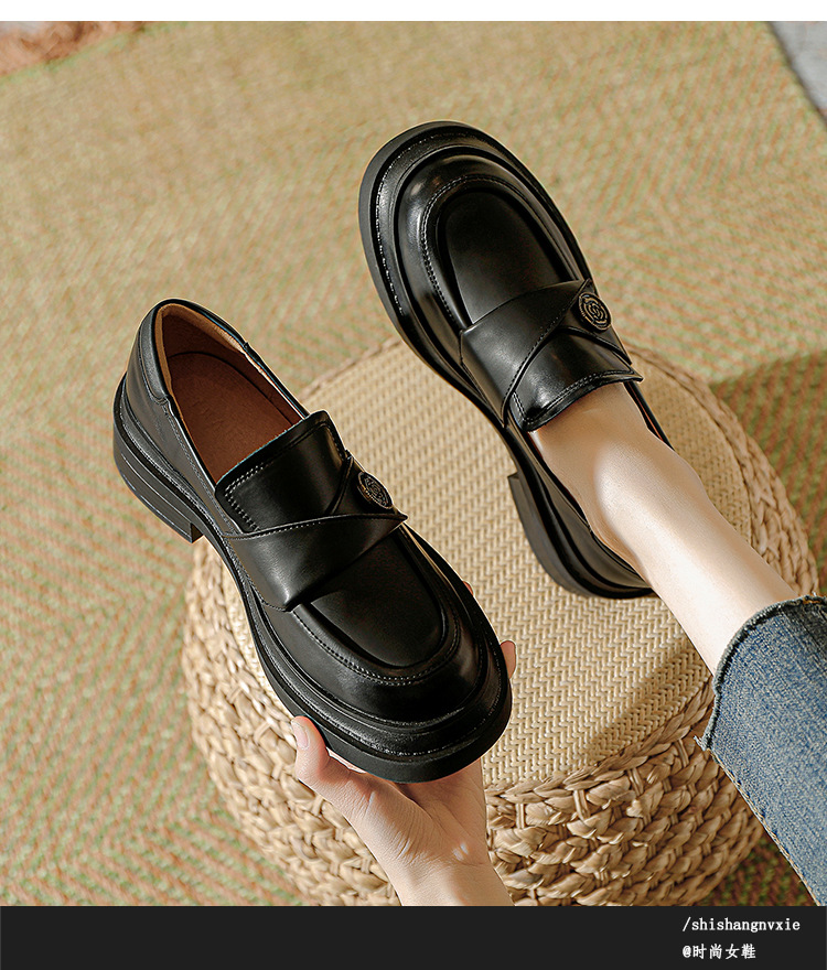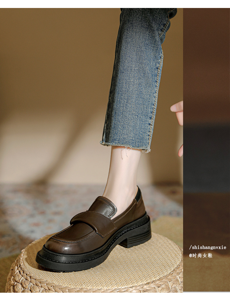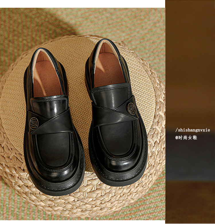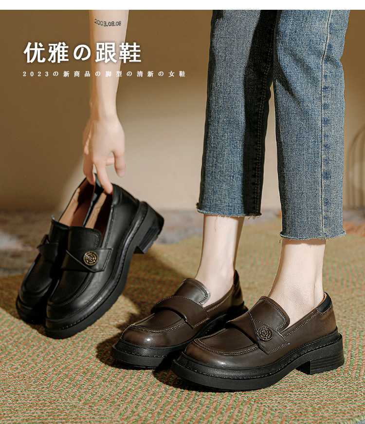Su Yinyin 같은 스타일의 가죽 신발 2023 새로운 프랑스 로우 컷 싱글 레이어 신발 여성용 두꺼운 밑창 청키 힐 가죽 로퍼스토어 가기