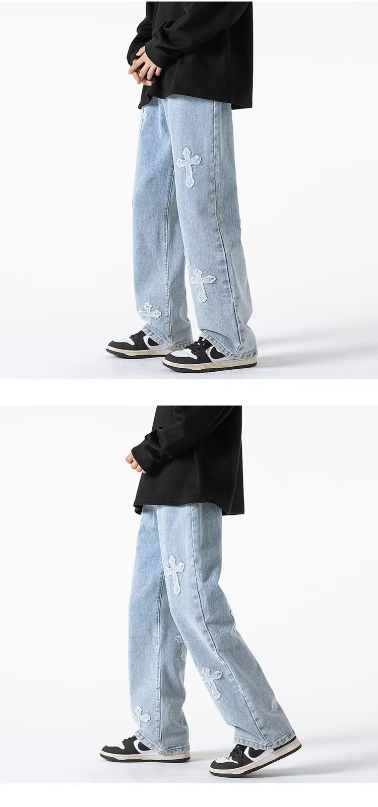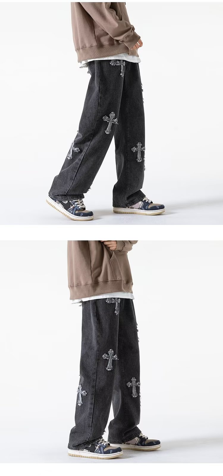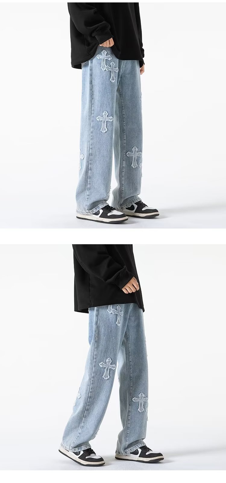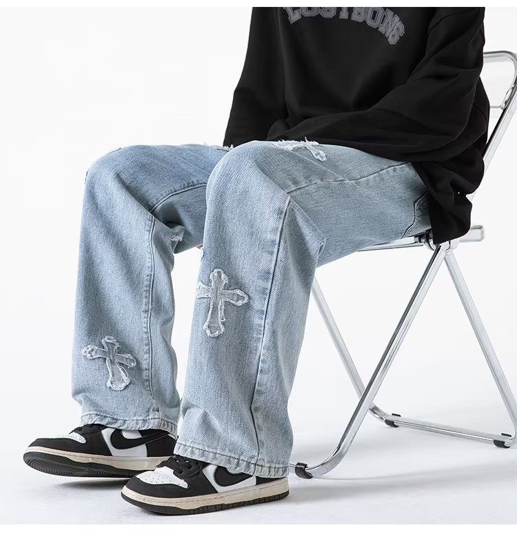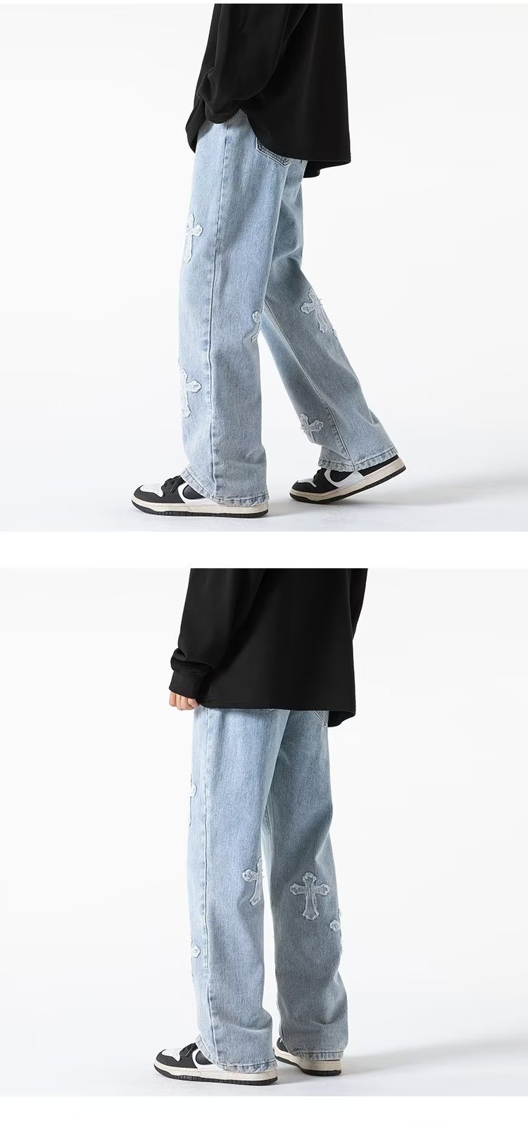 크로스 청바지 남성 봄과 가을 미국 복고풍 패션 브랜드 느슨한 스트레이트 팬츠 패션 캐주얼 와이드 레그 팬츠