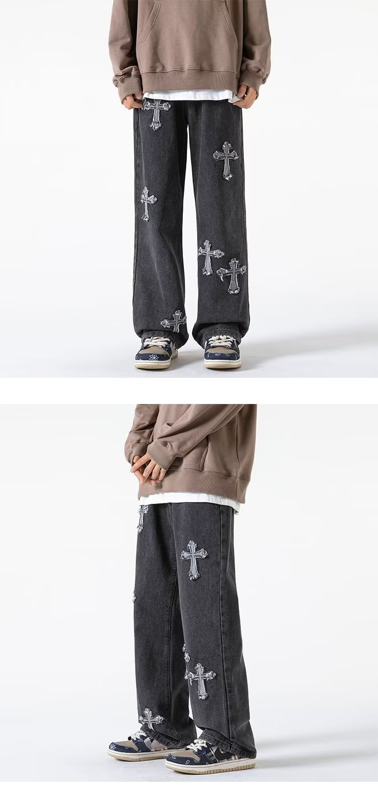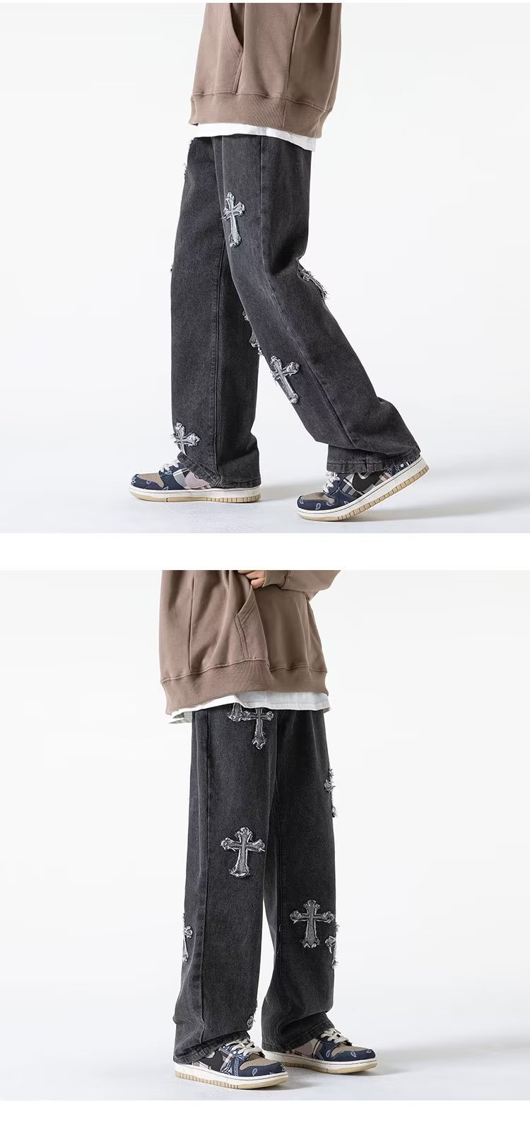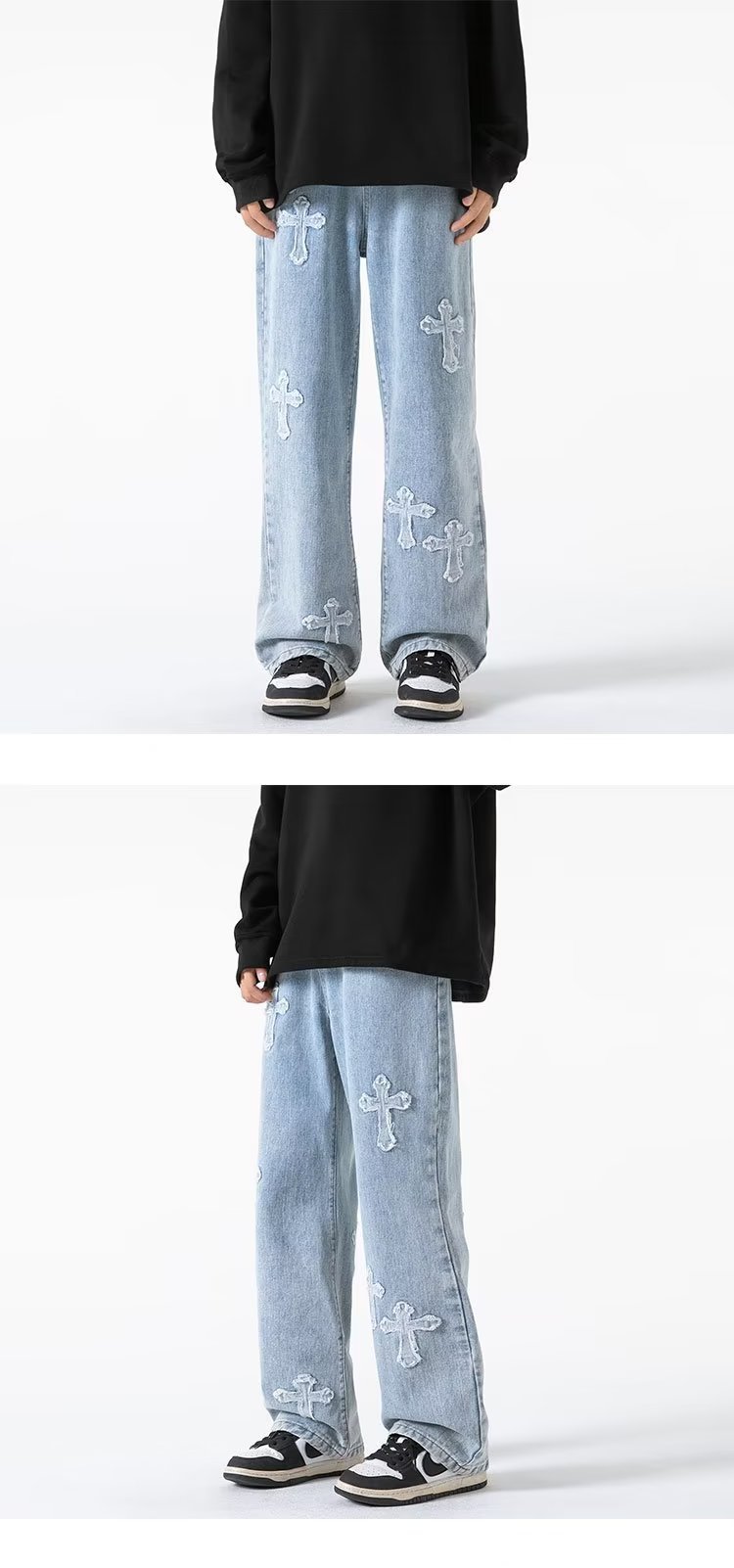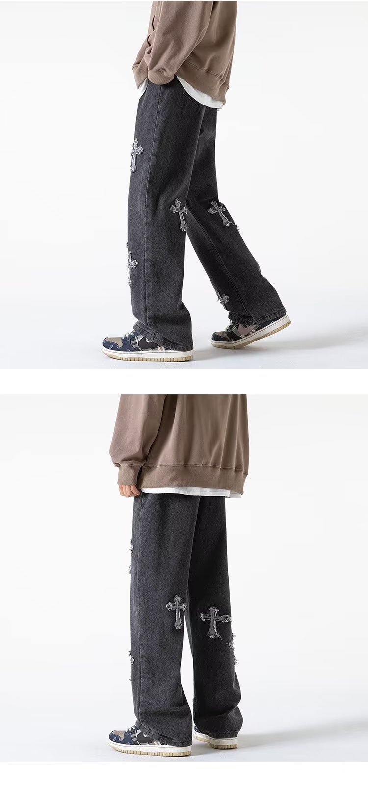 크로스 청바지 남성 봄과 가을 미국 복고풍 패션 브랜드 느슨한 스트레이트 팬츠 패션 캐주얼 와이드 레그 팬츠