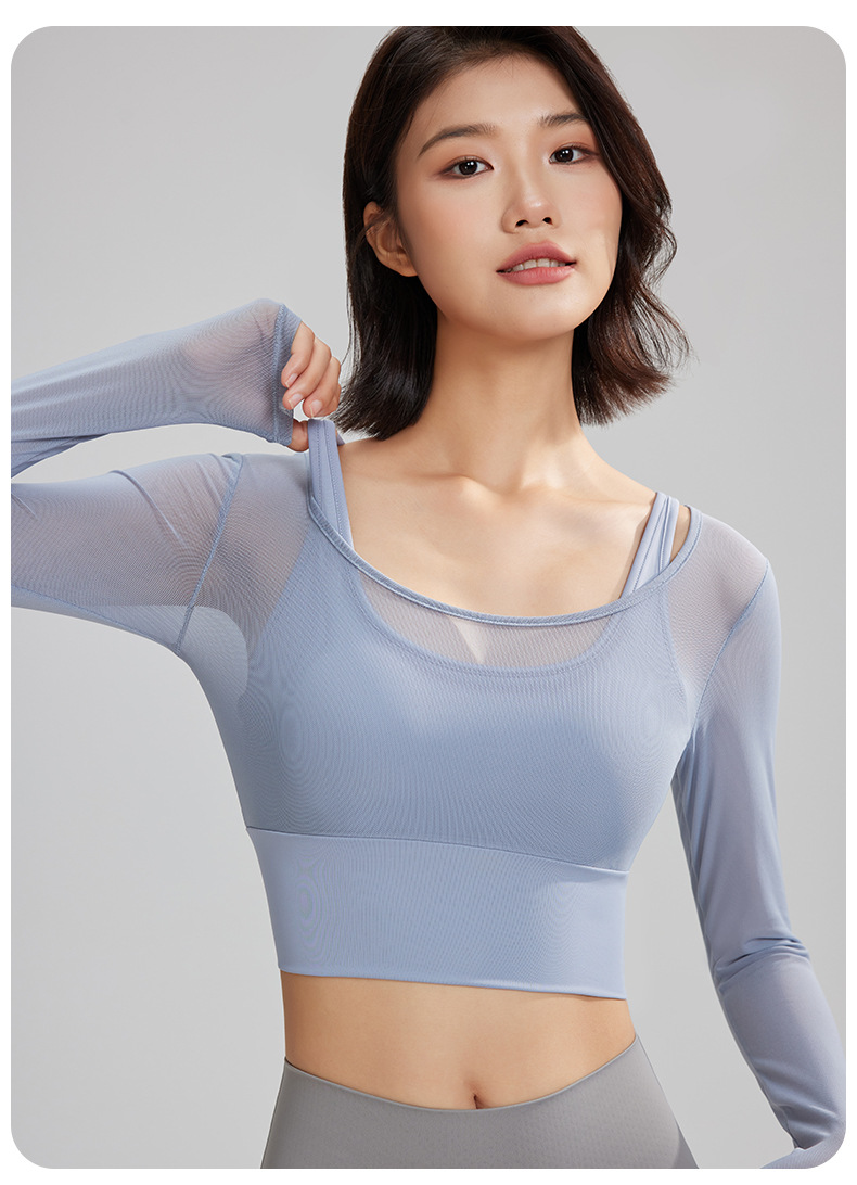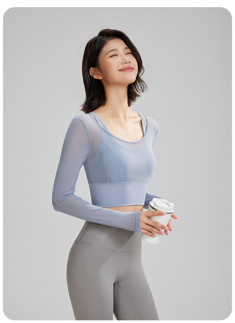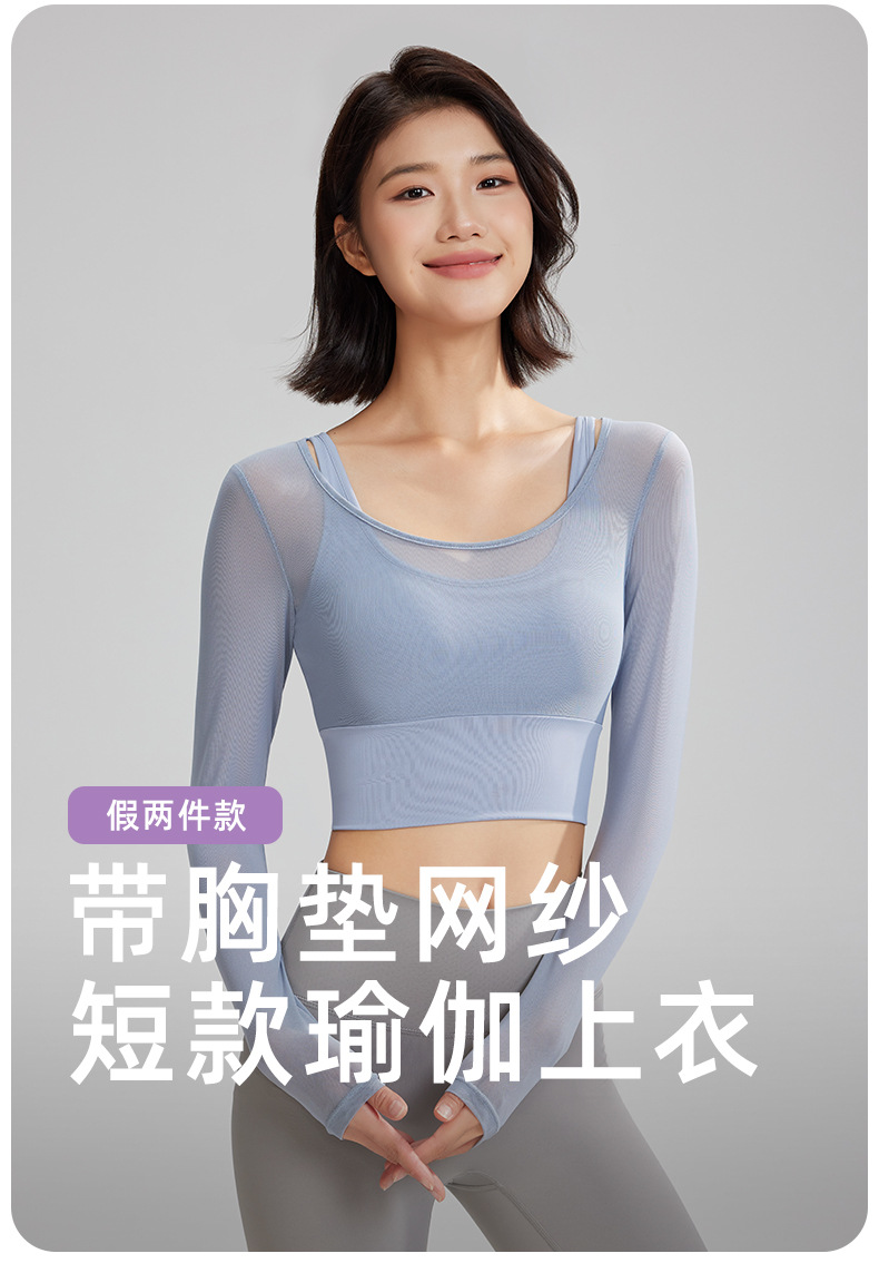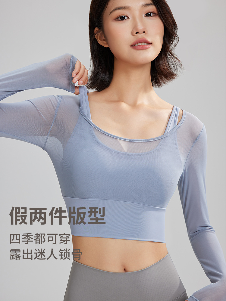 새로운 통기성 가짜 2 피스 교수형 목 스포츠 요가 세트 가슴 패드 타이트 배벨이 가을과 겨울을위한 긴팔 피트니스 세트 종료합니다.스토어 가기