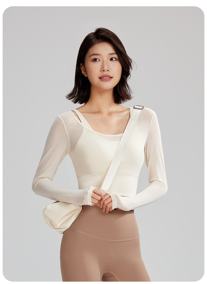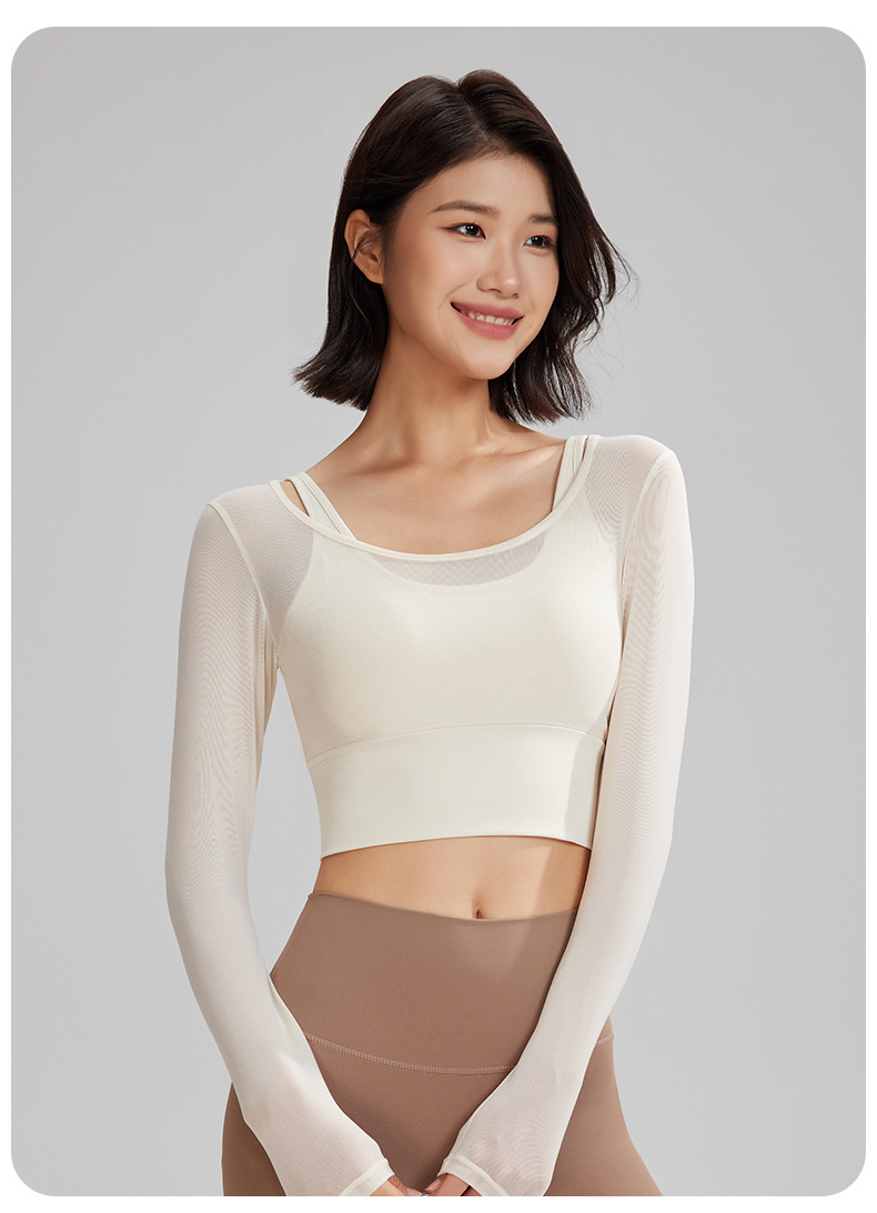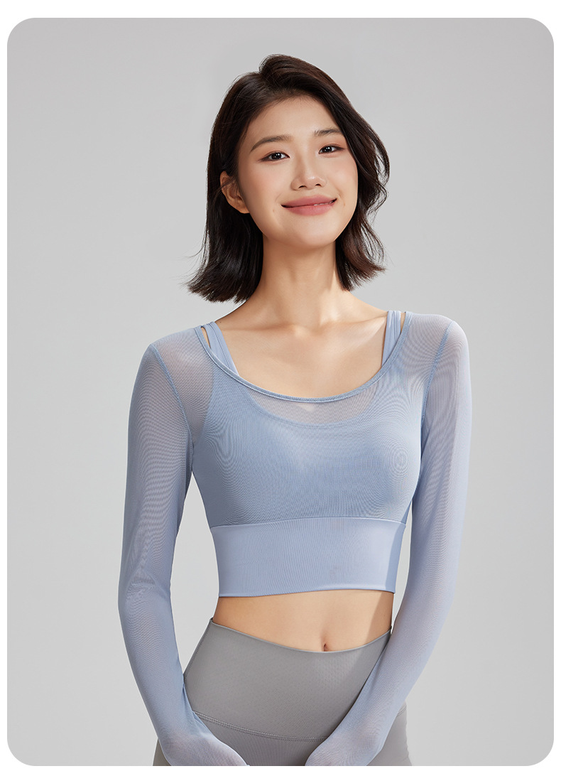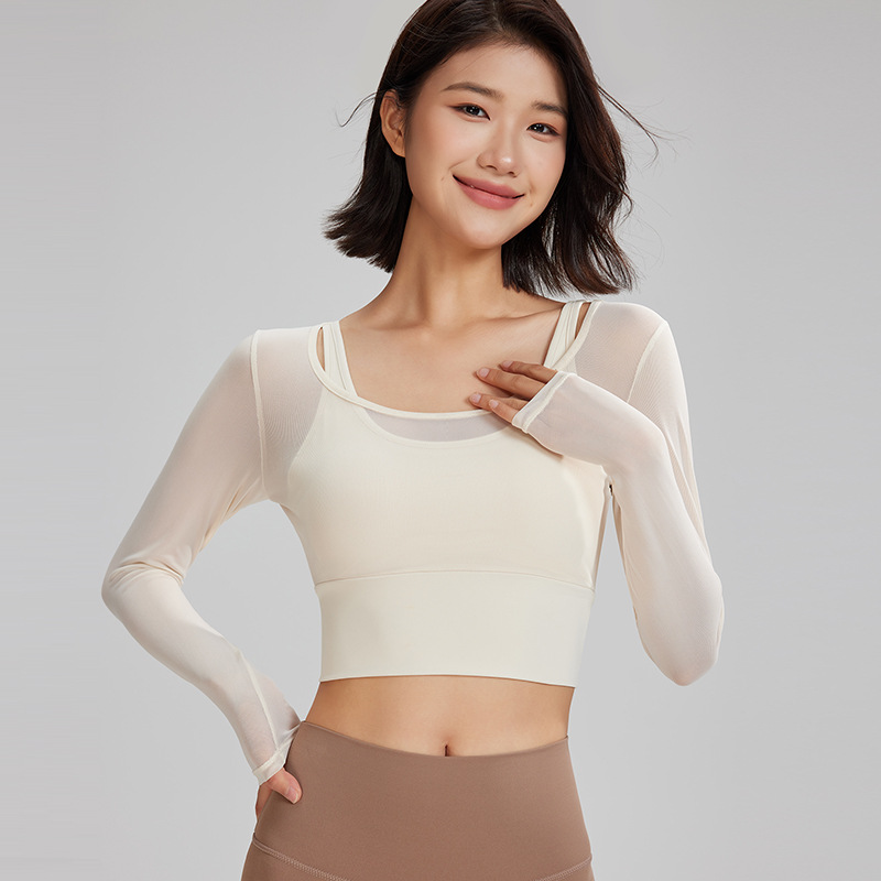 새로운 통기성 가짜 2 피스 교수형 목 스포츠 요가 세트 가슴 패드 타이트 배벨이 가을과 겨울을위한 긴팔 피트니스 세트 종료합니다.스토어 가기