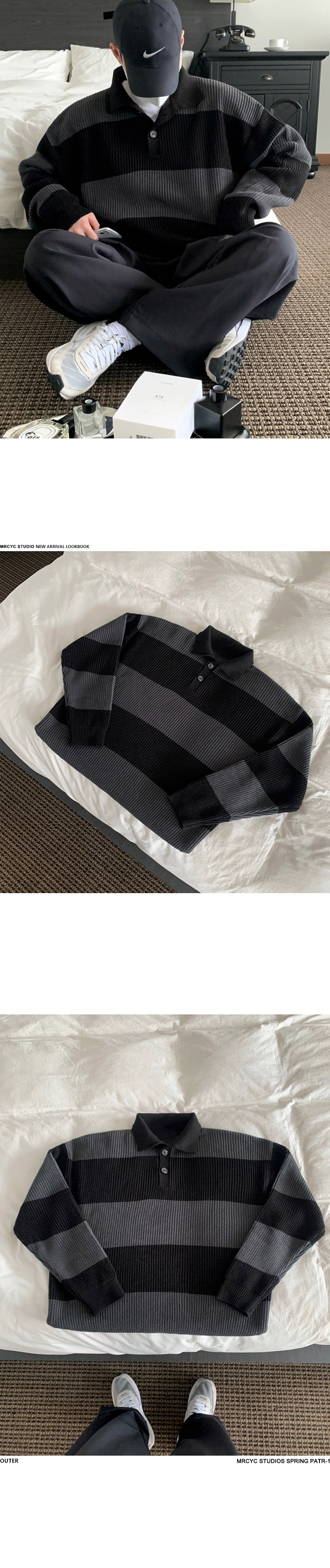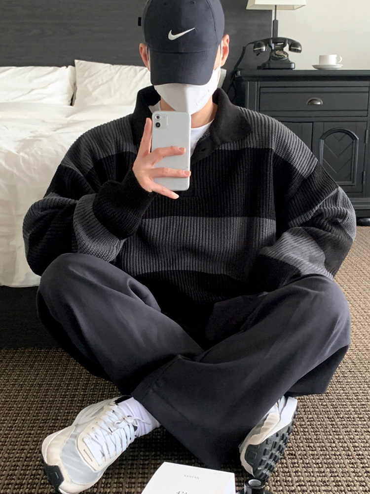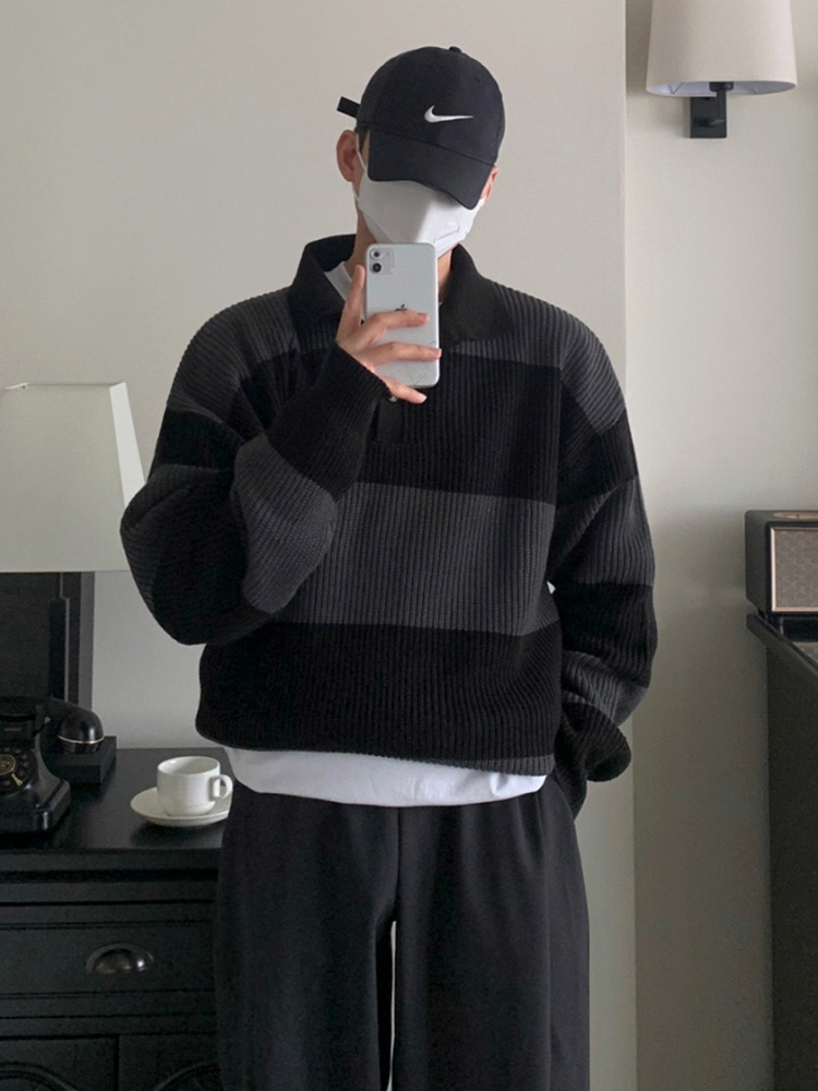 일본식 콘트라스트 컬러 스트라이프 폴로 스웨터 남성 가을 한국 스타일 트렌디 한 옷깃 스웨터 느슨한 캐주얼 탑 패션스토어 가기