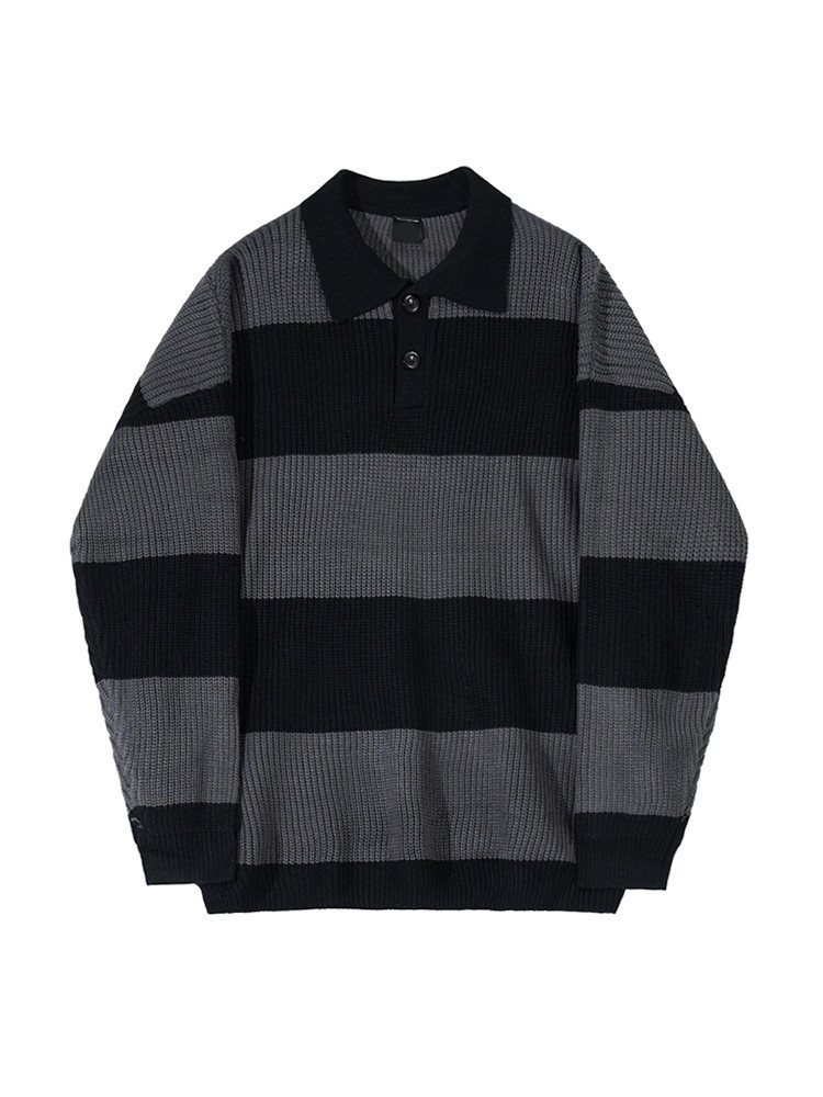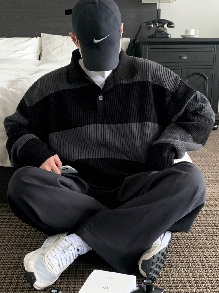 일본식 콘트라스트 컬러 스트라이프 폴로 스웨터 남성 가을 한국 스타일 트렌디 한 옷깃 스웨터 느슨한 캐주얼 탑 패션