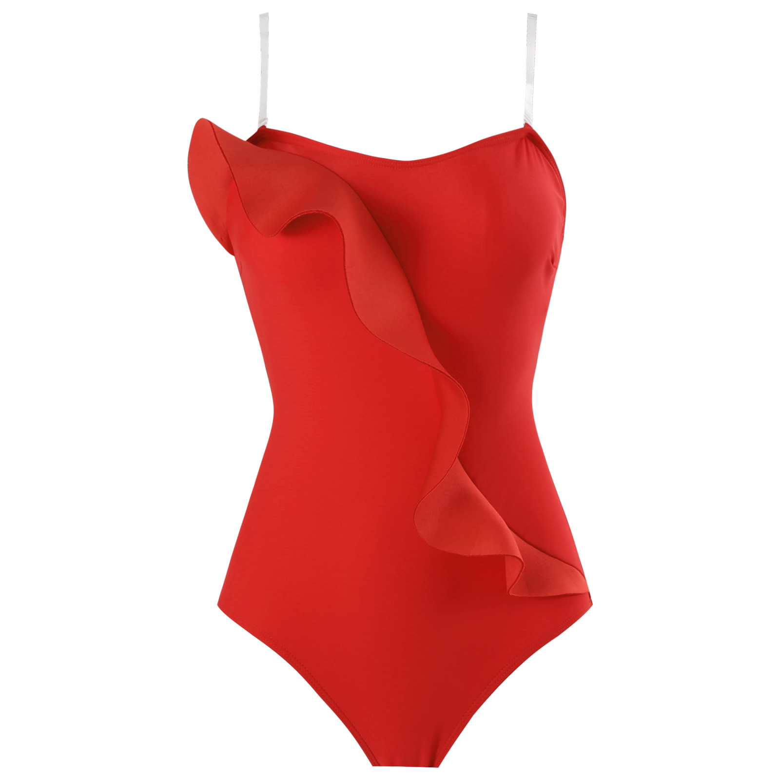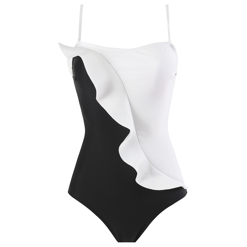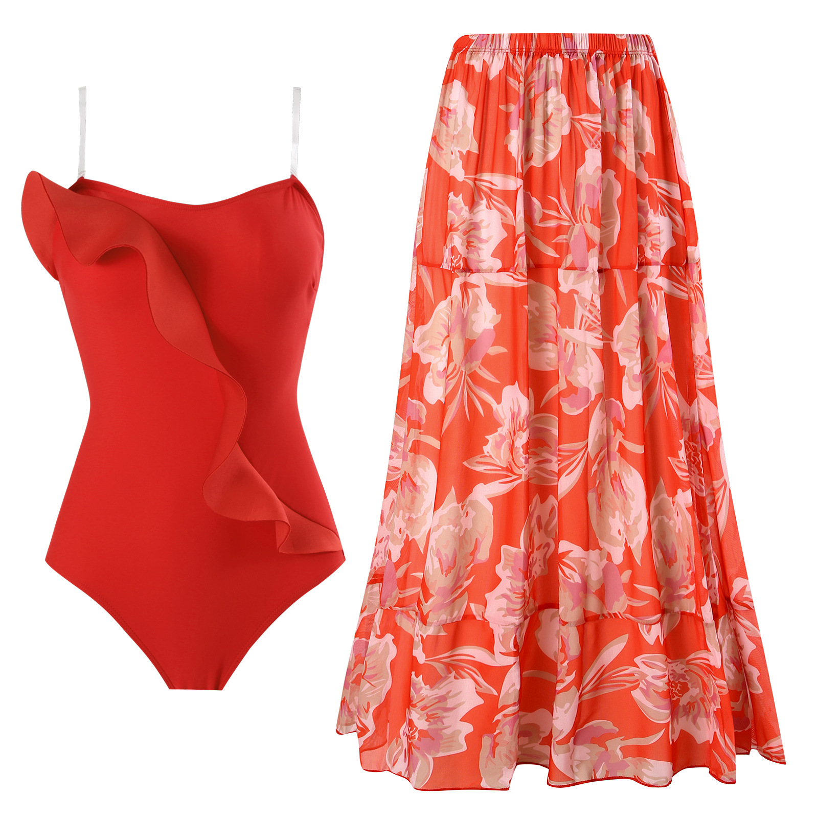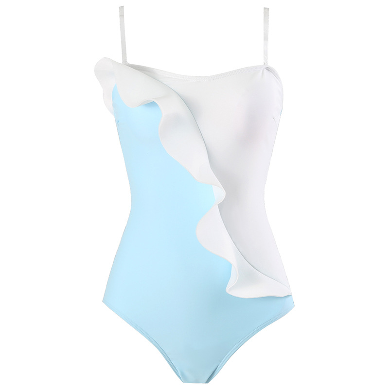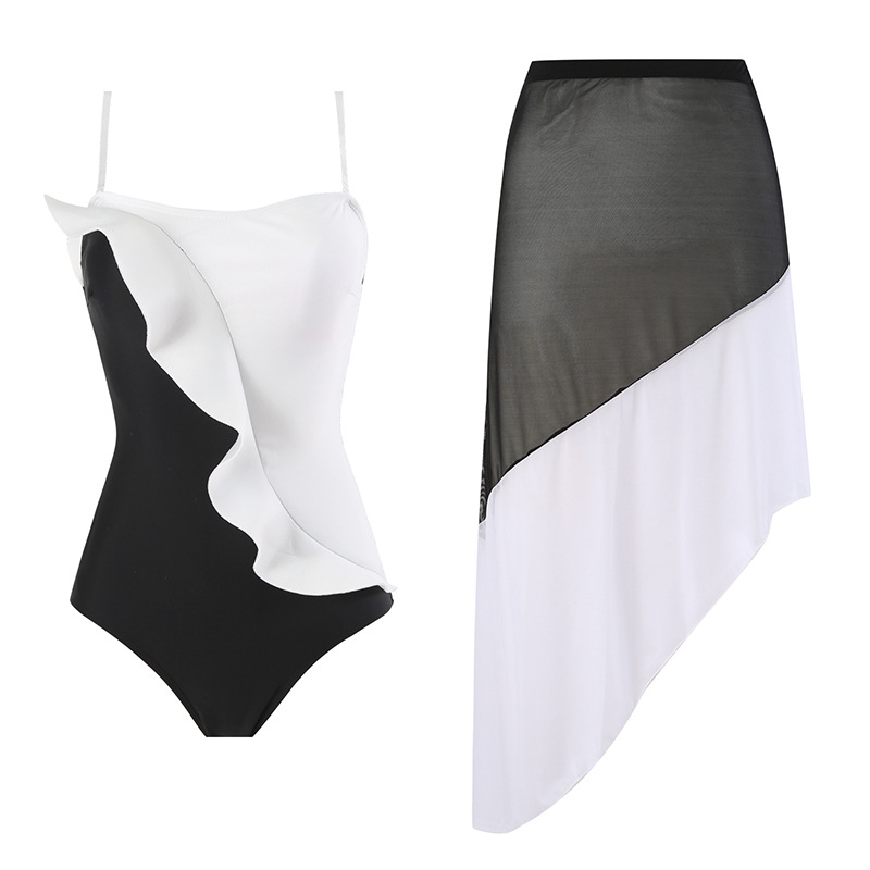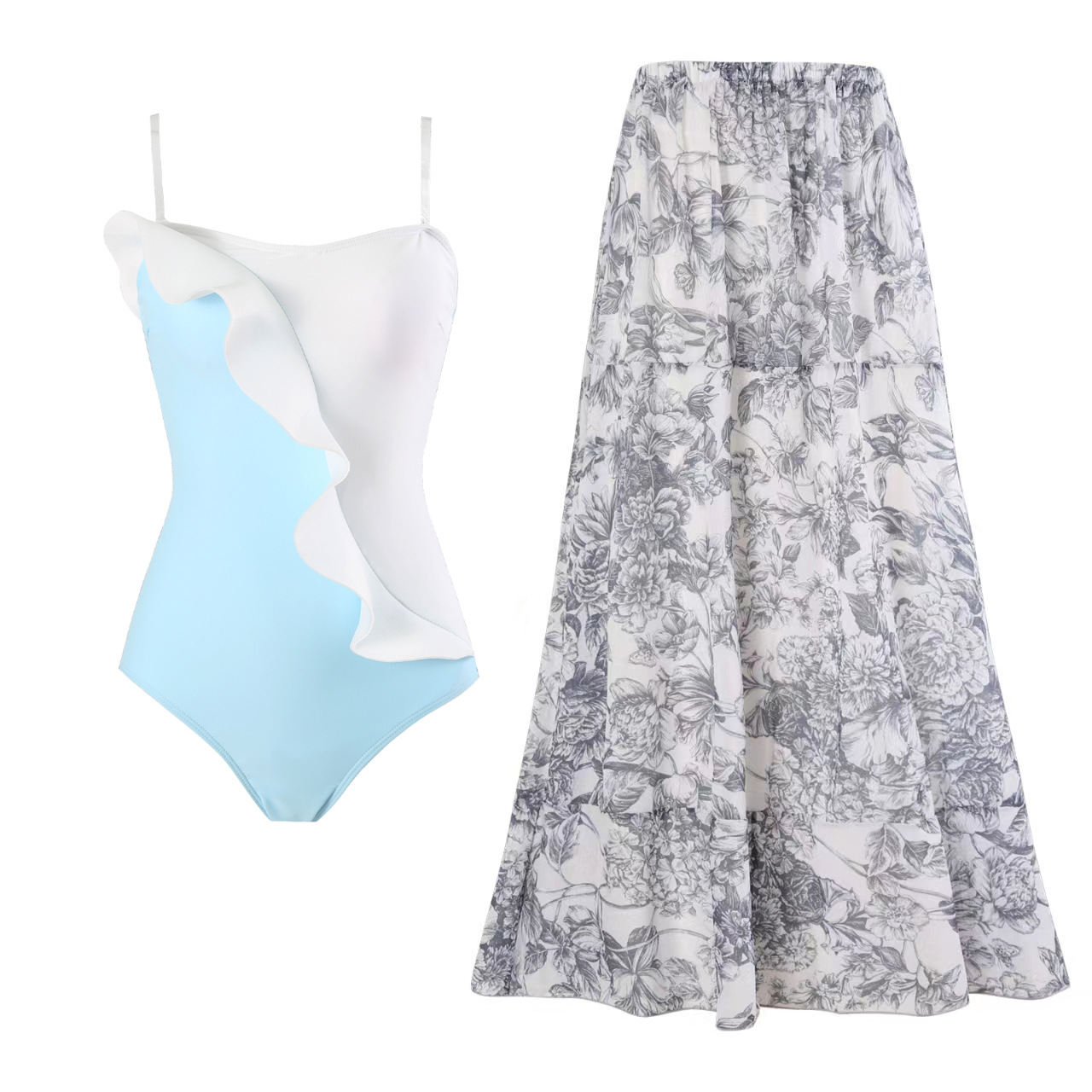 [여성용 보헤미안 스타일 휴가 수영복] 오블리크 러플 컬러 블록 점프 슈트 자외선 차단 비치 스커트 유럽 및 미국스토어 가기