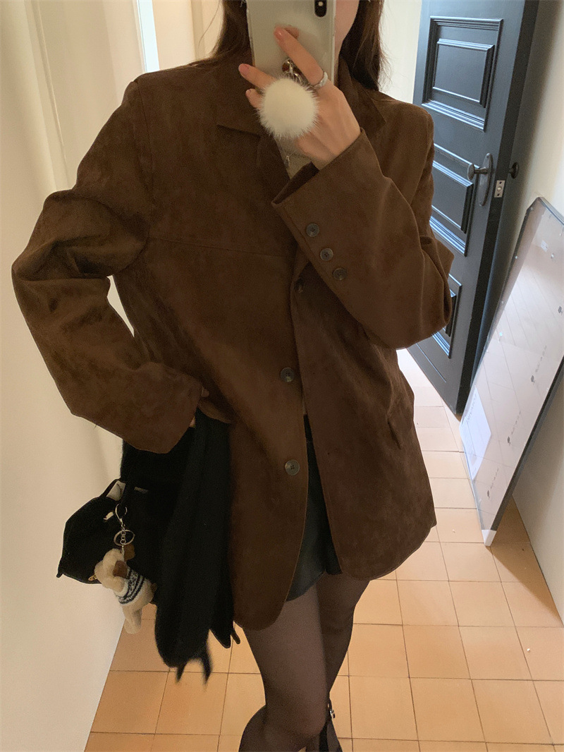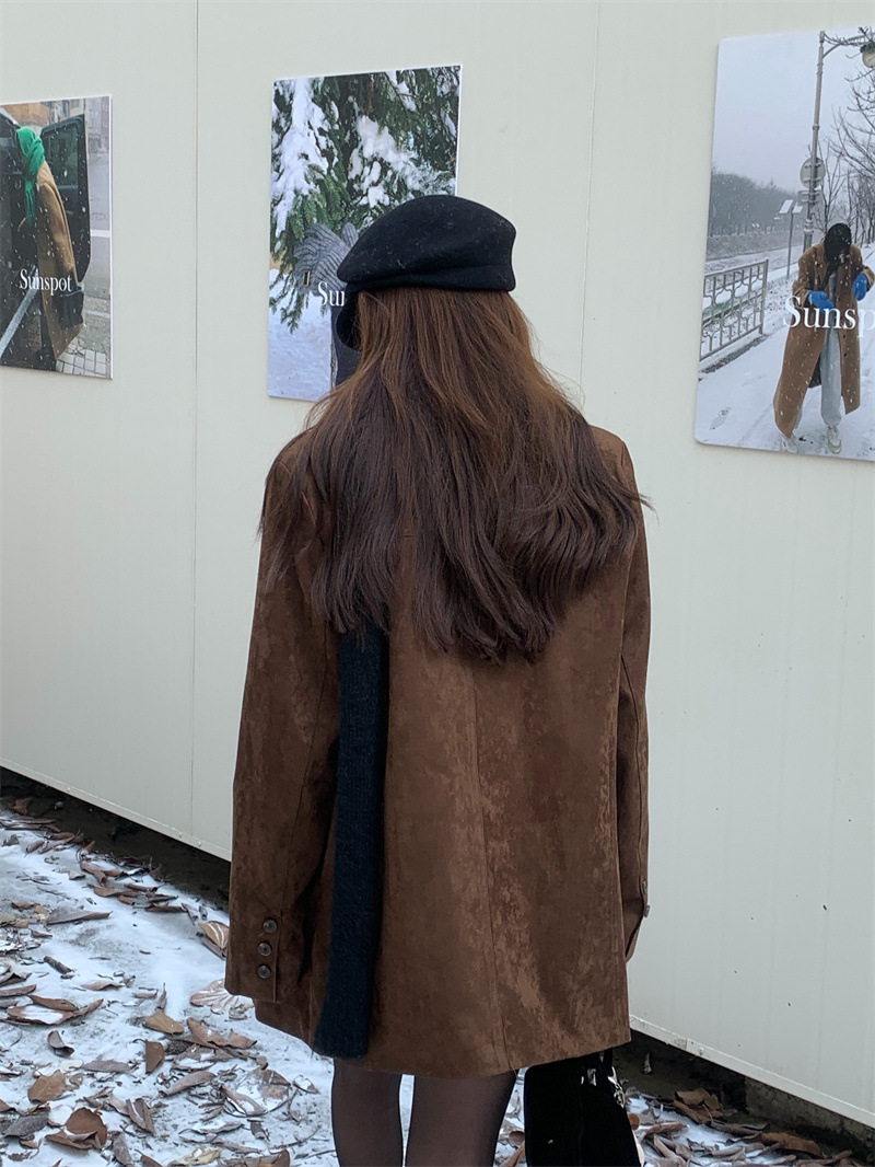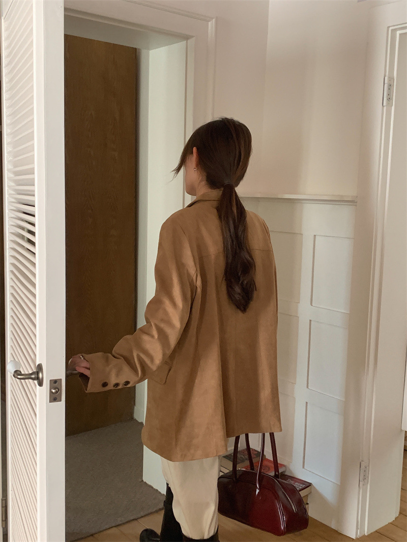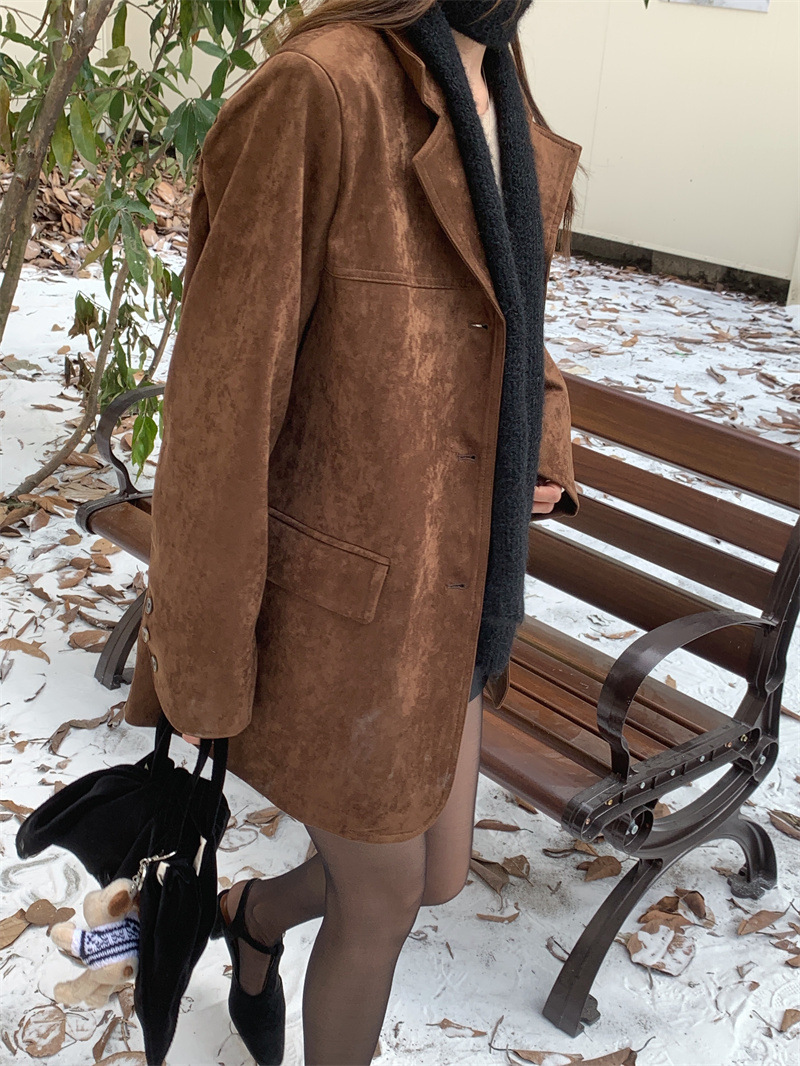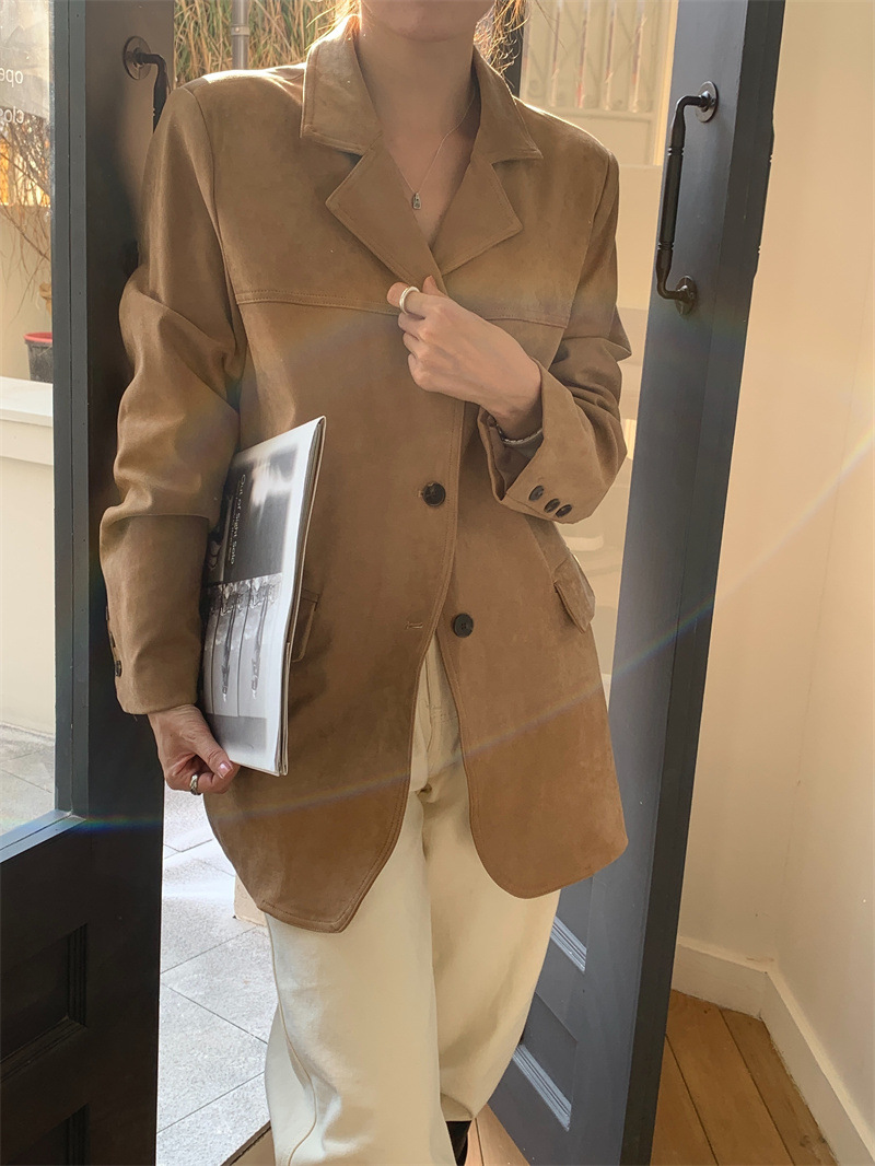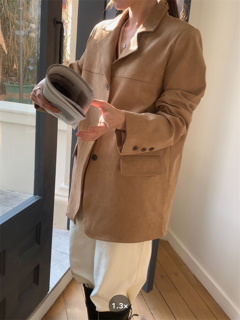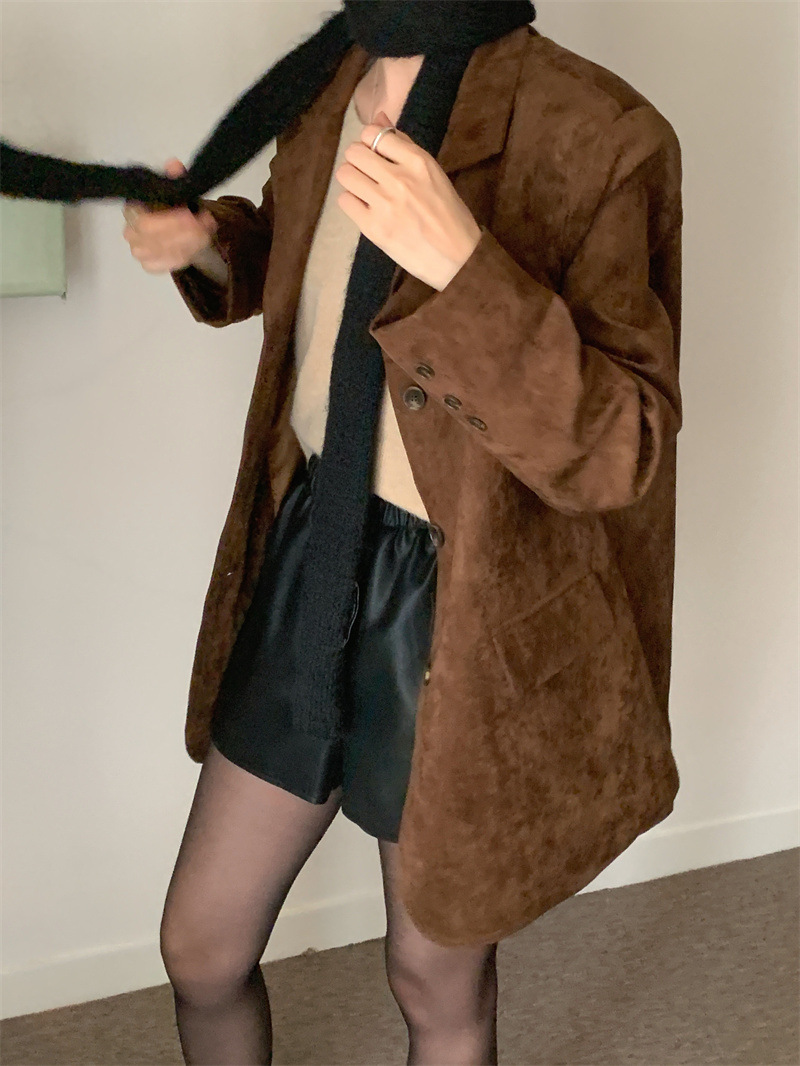 가을 겨울 한국 스타일 패셔너블한 프렌치 레트로 메일라드 컬러 가죽벨벳 루즈핏 캐주얼 수트 재킷 2가지 색상스토어 가기