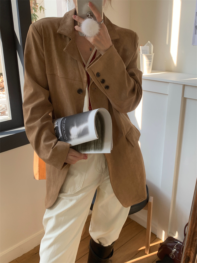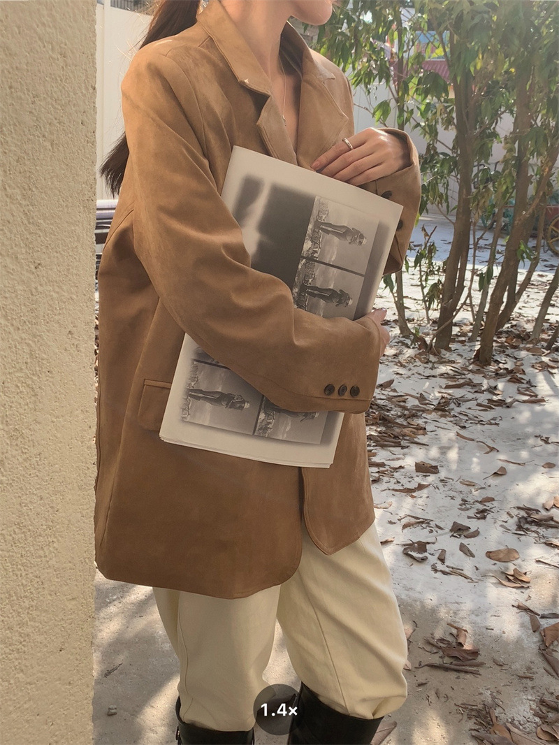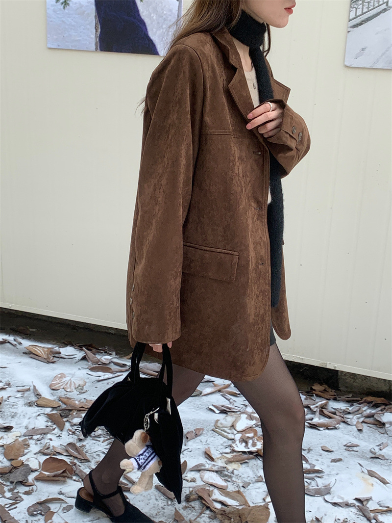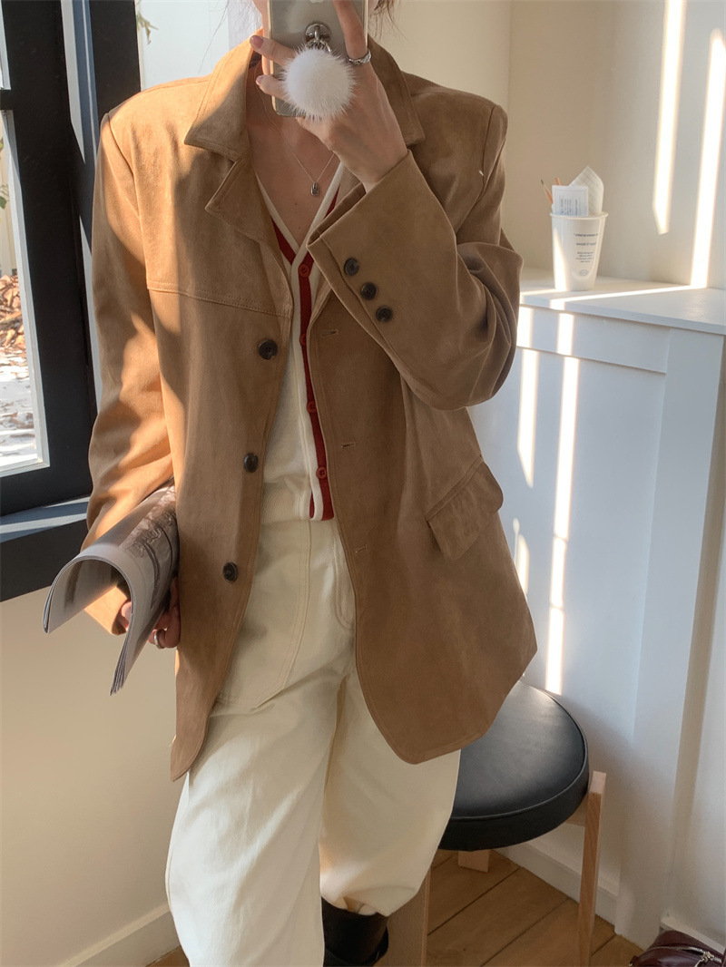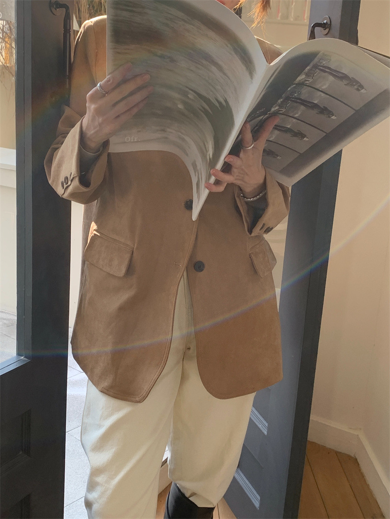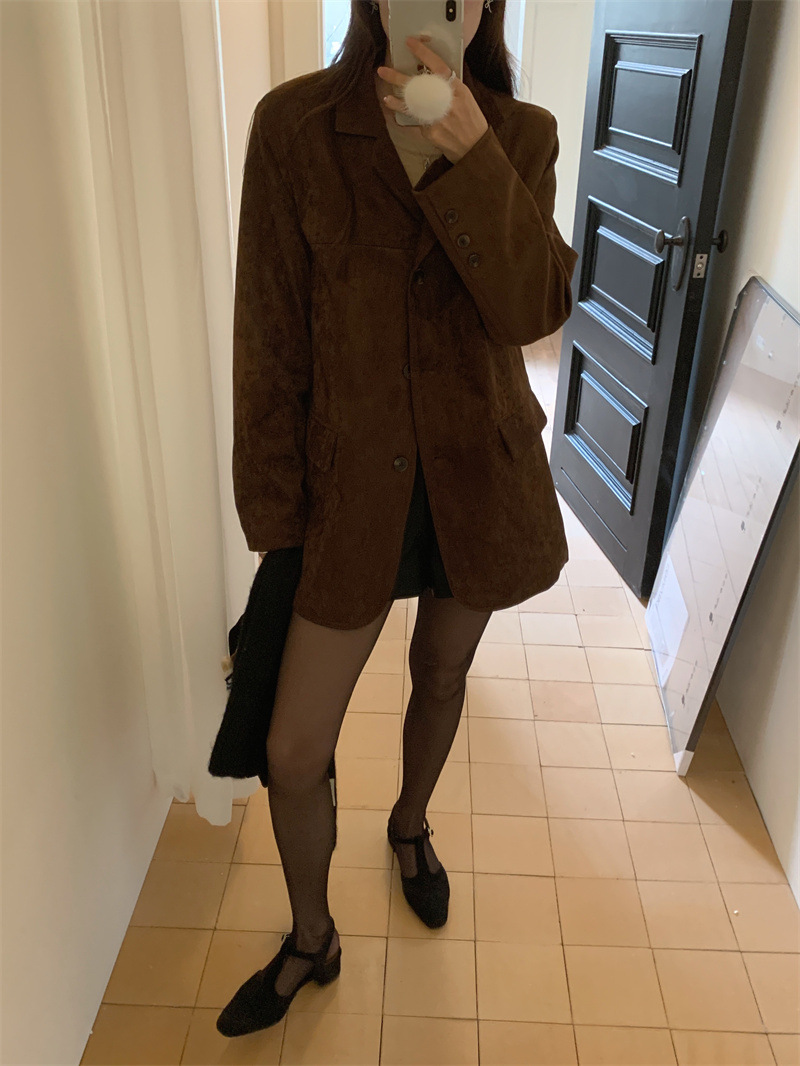가을 겨울 한국 스타일 패셔너블한 프렌치 레트로 메일라드 컬러 가죽벨벳 루즈핏 캐주얼 수트 재킷 2가지 색상스토어 가기