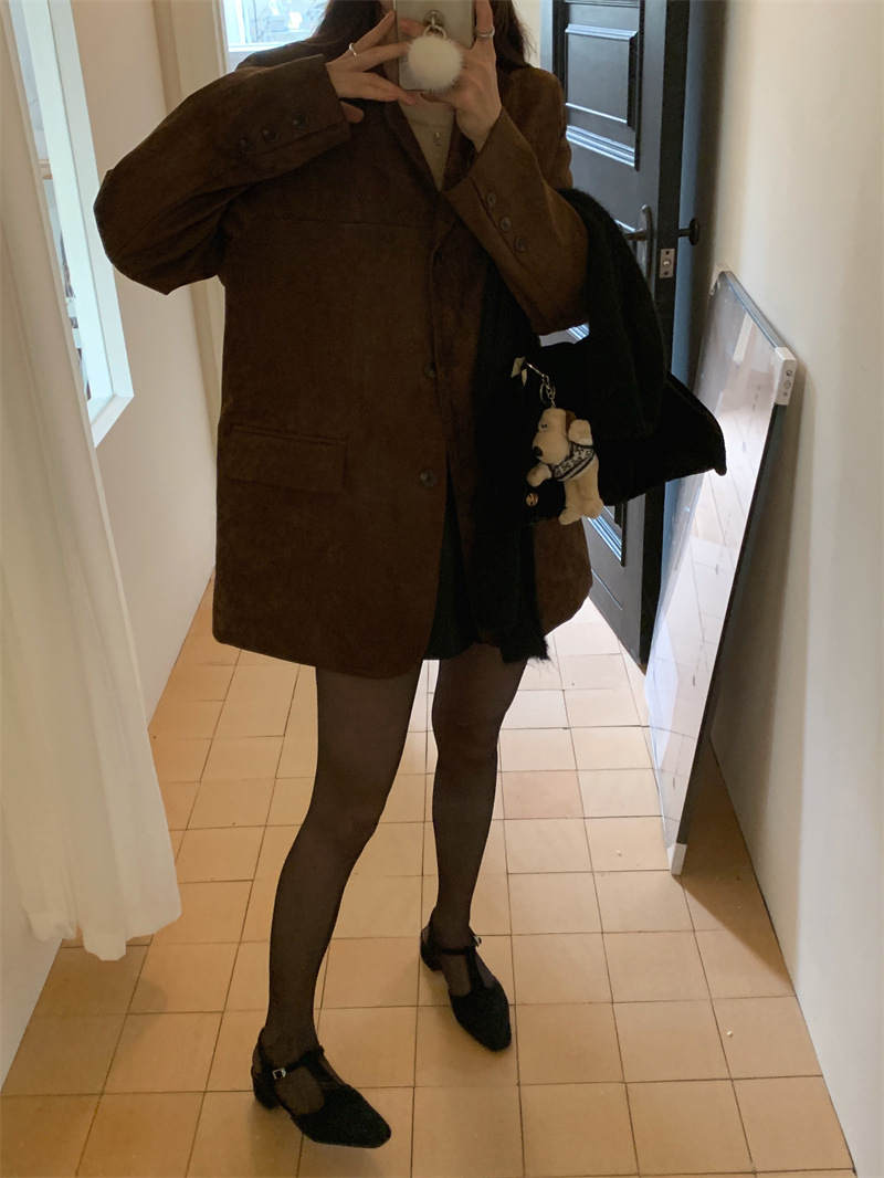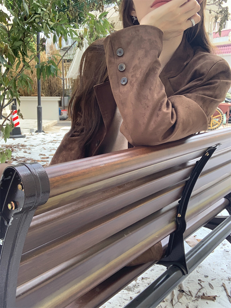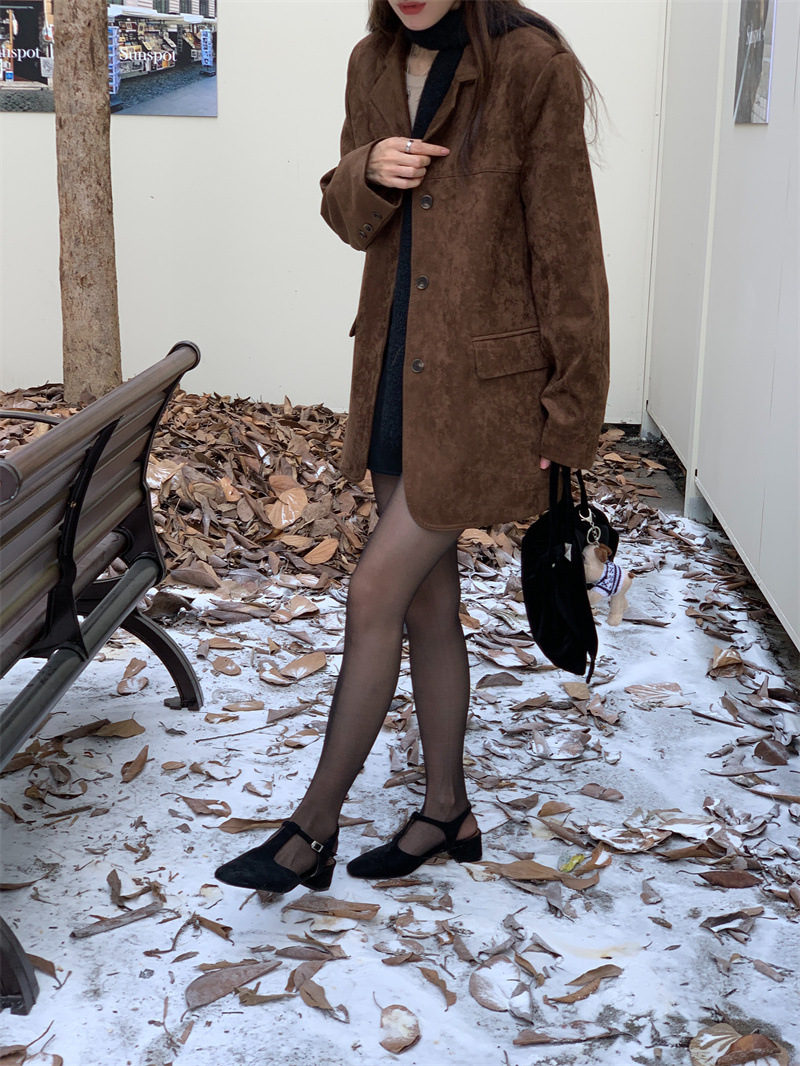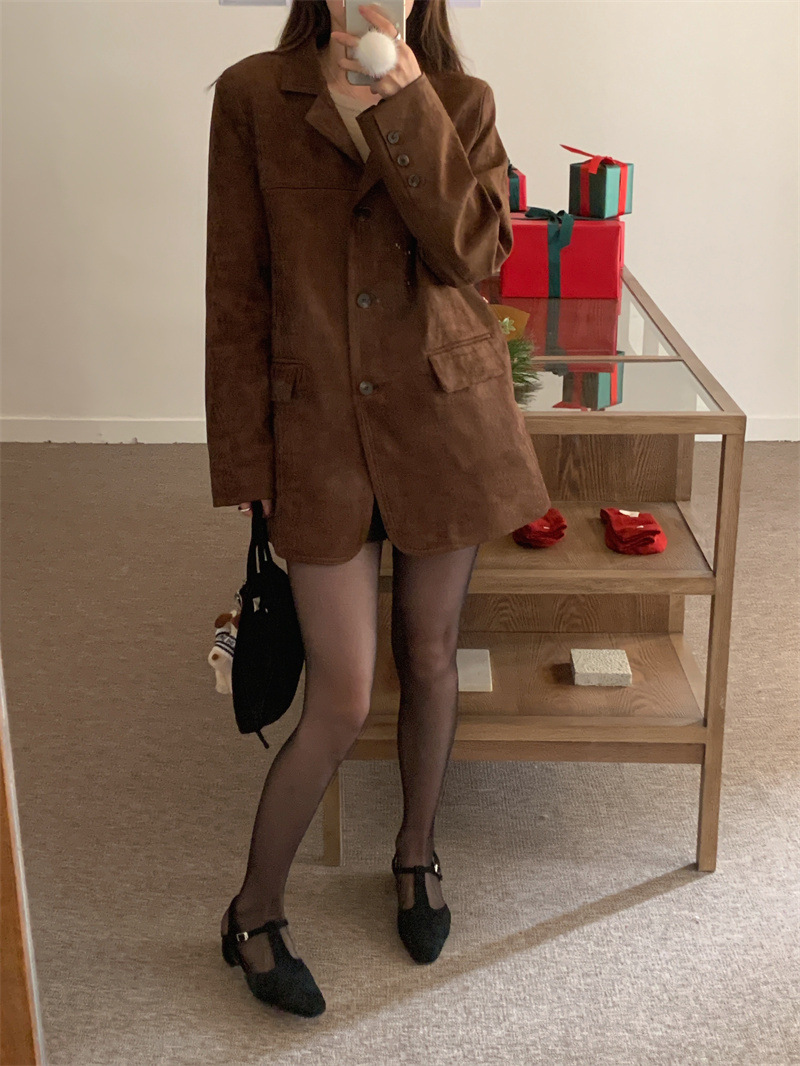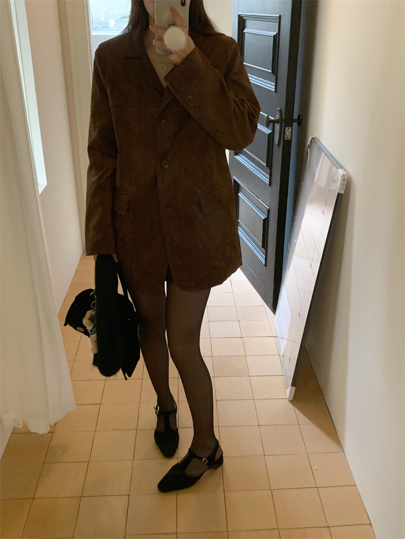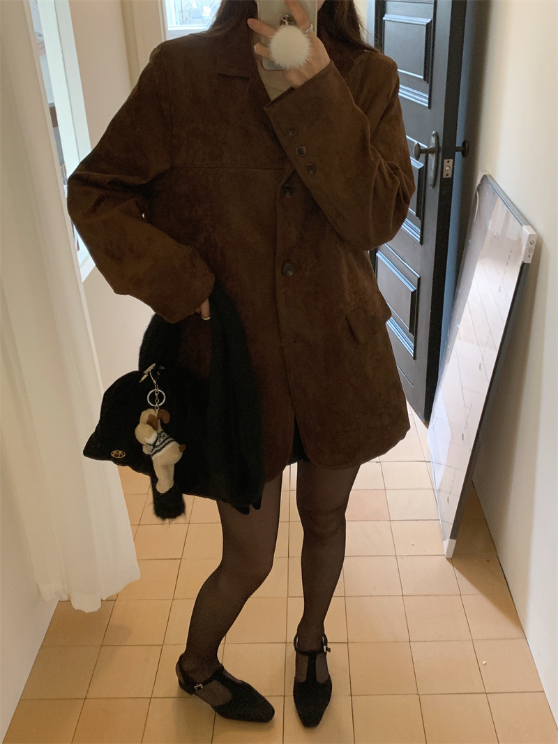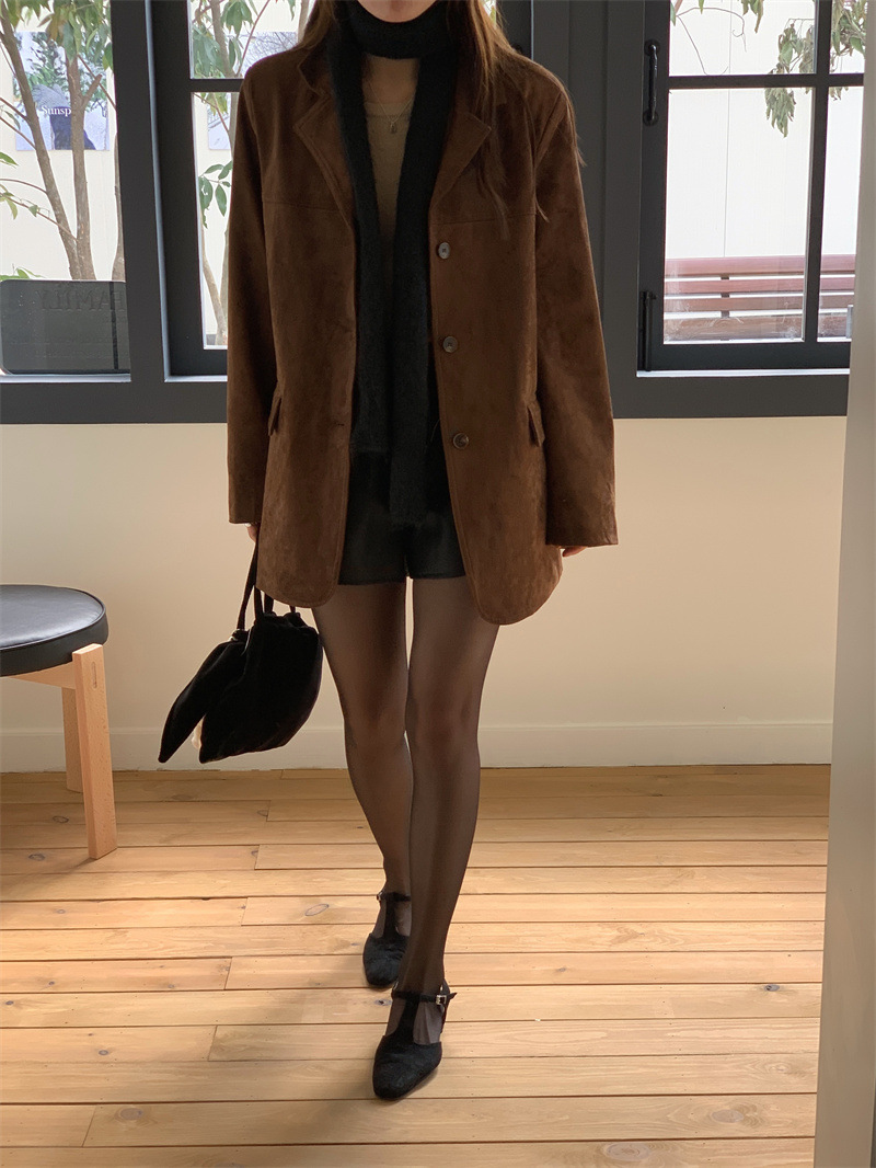 가을 겨울 한국 스타일 패셔너블한 프렌치 레트로 메일라드 컬러 가죽벨벳 루즈핏 캐주얼 수트 재킷 2가지 색상스토어 가기