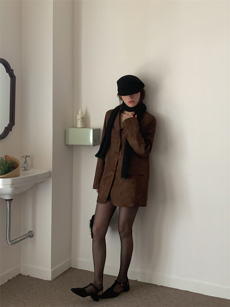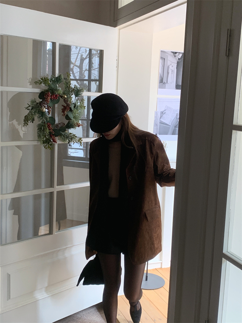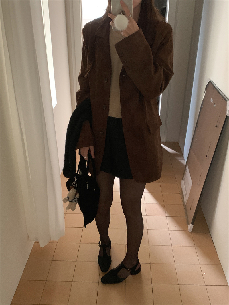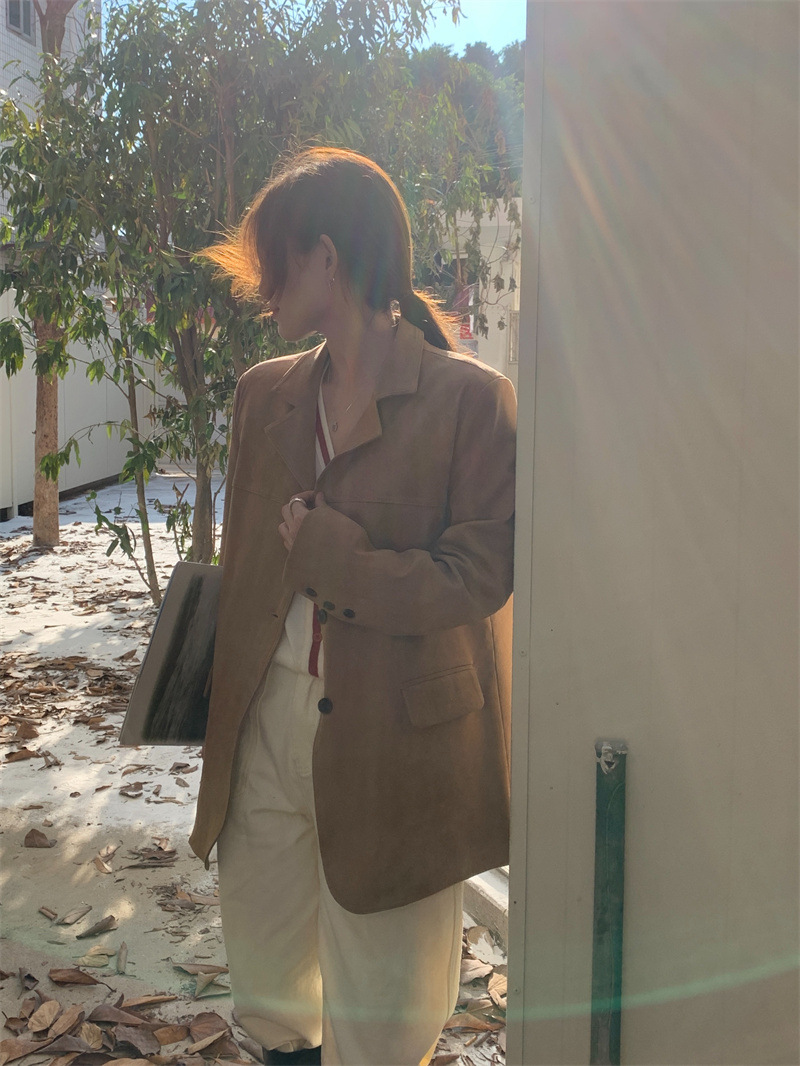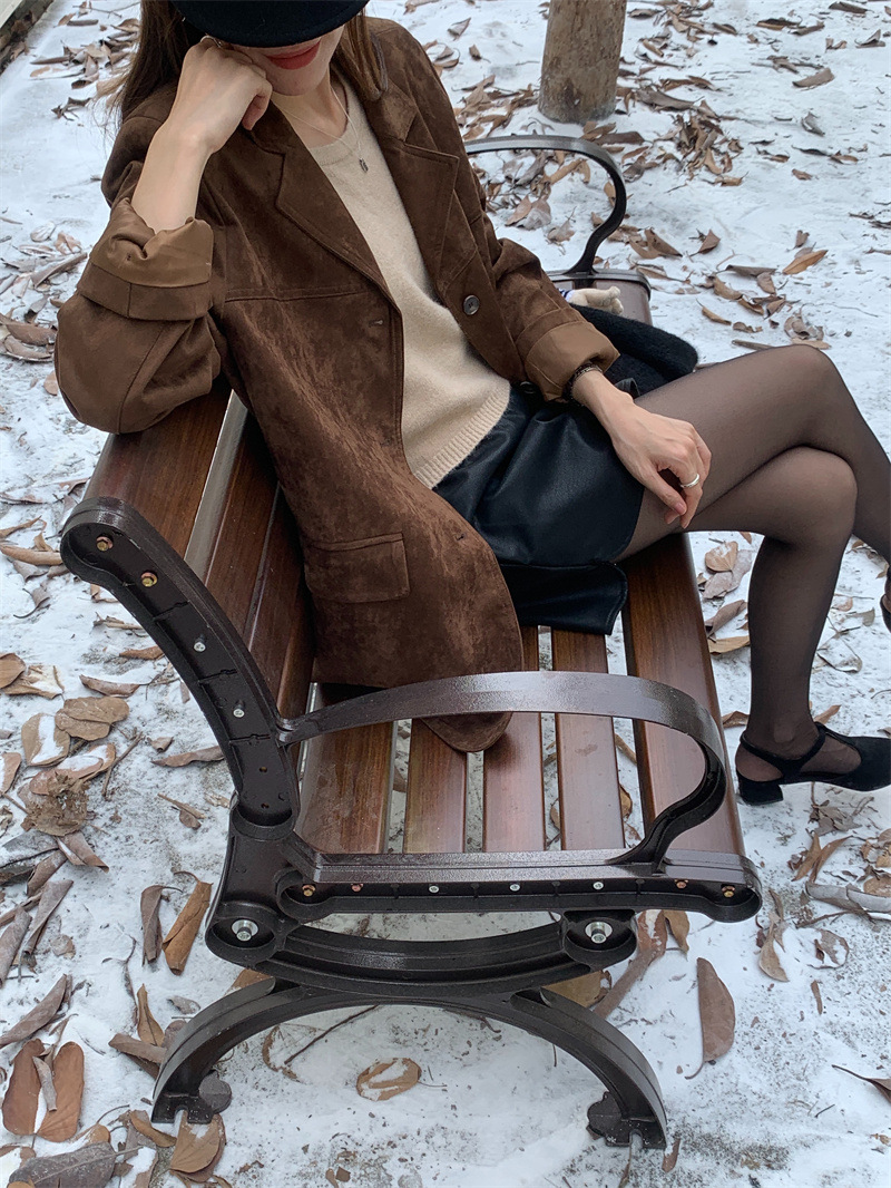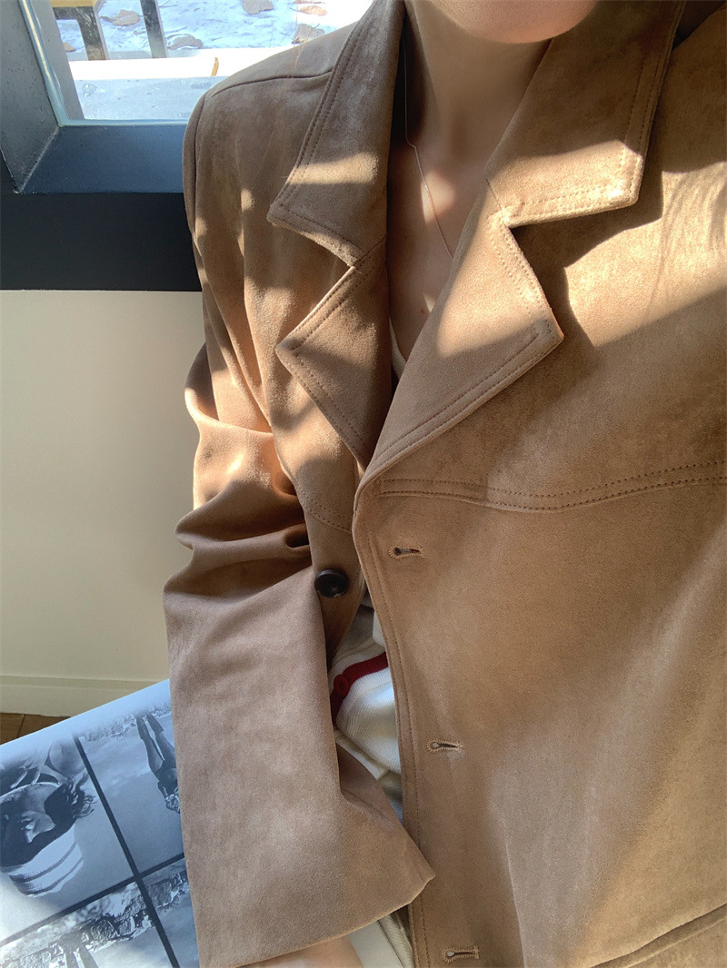 가을 겨울 한국 스타일 패셔너블한 프렌치 레트로 메일라드 컬러 가죽벨벳 루즈핏 캐주얼 수트 재킷 2가지 색상스토어 가기