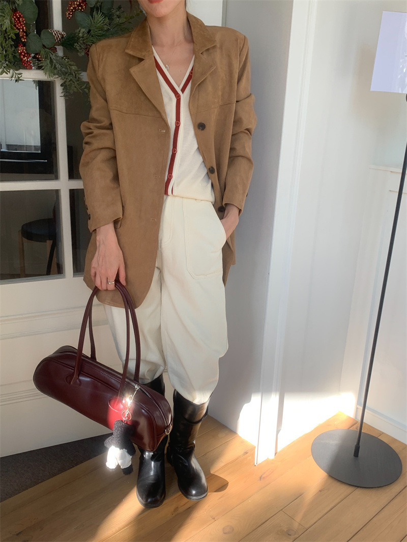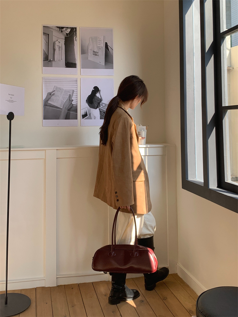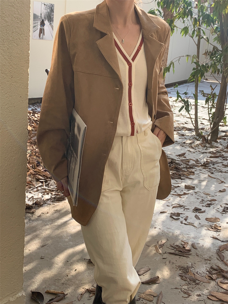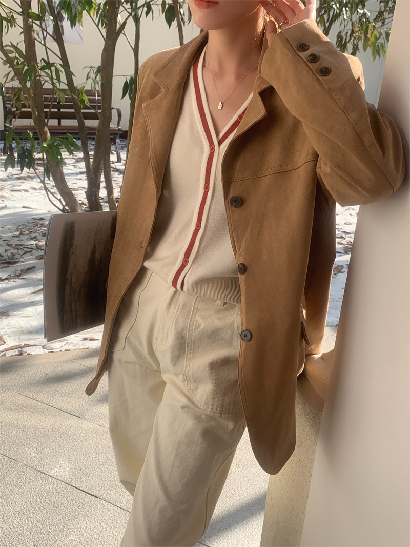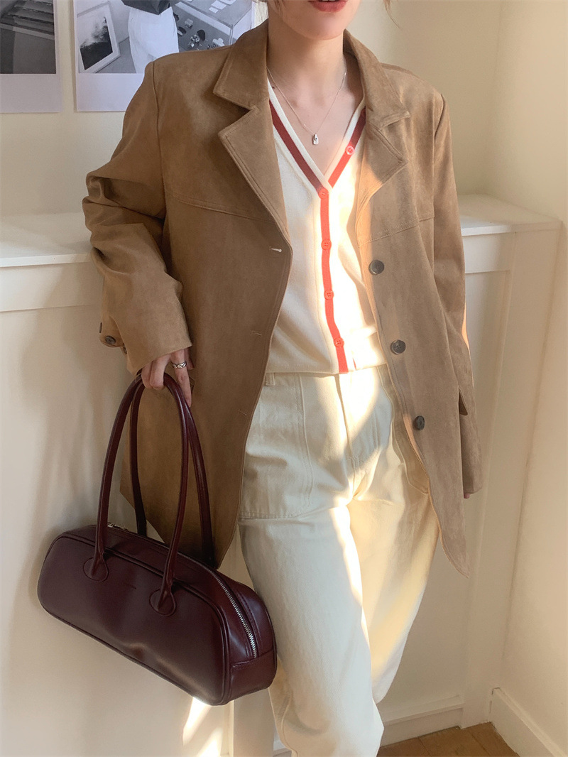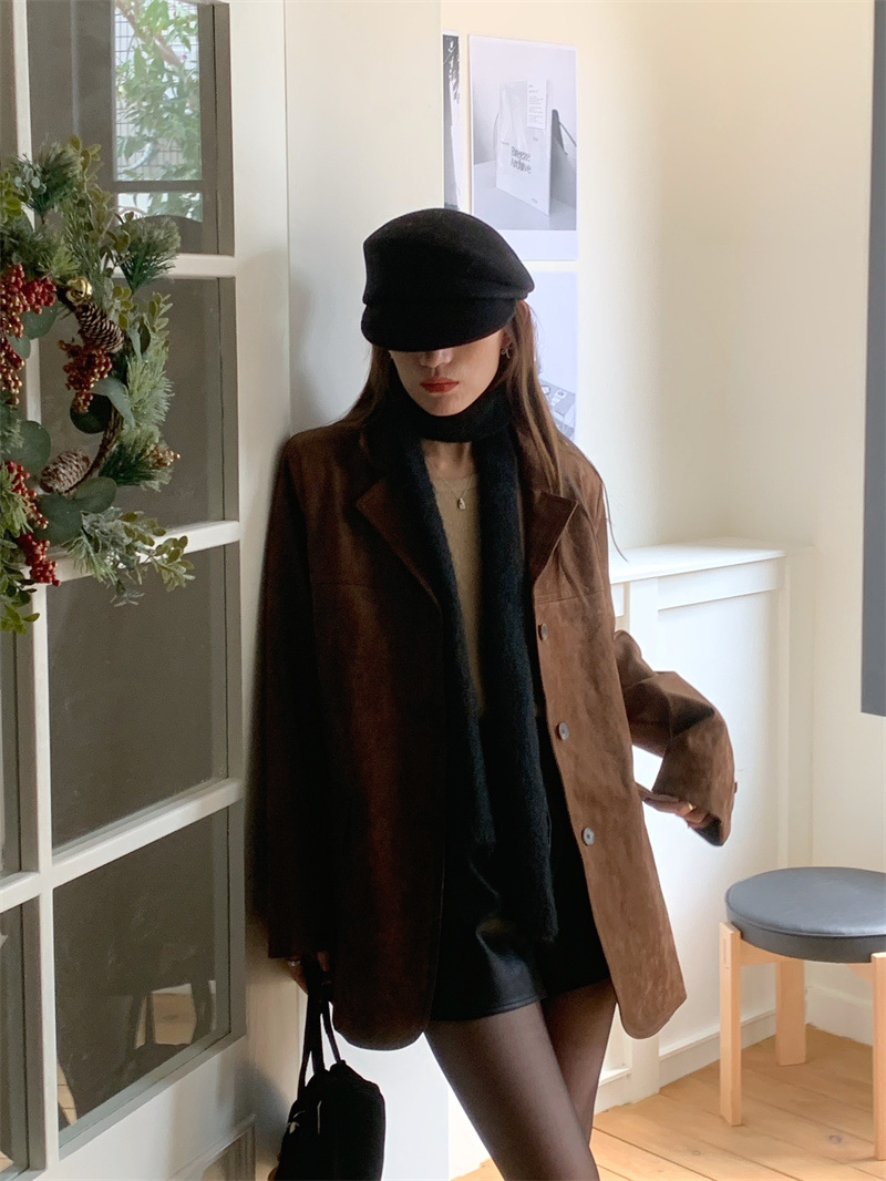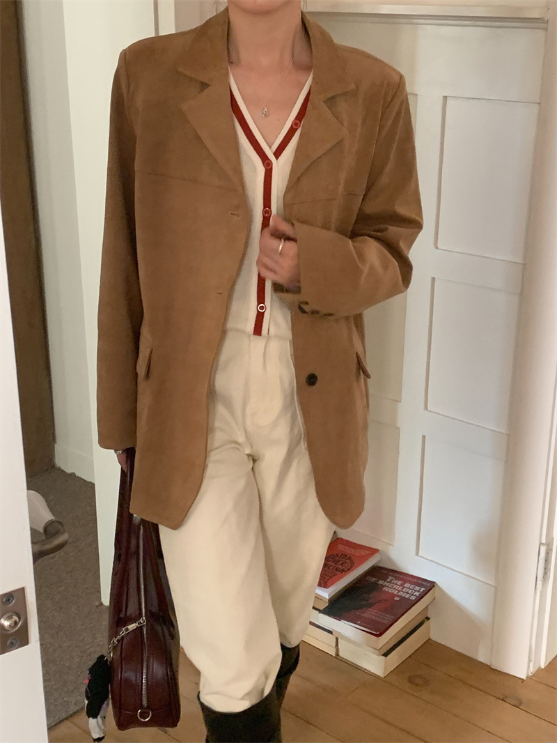 가을 겨울 한국 스타일 패셔너블한 프렌치 레트로 메일라드 컬러 가죽벨벳 루즈핏 캐주얼 수트 재킷 2가지 색상
