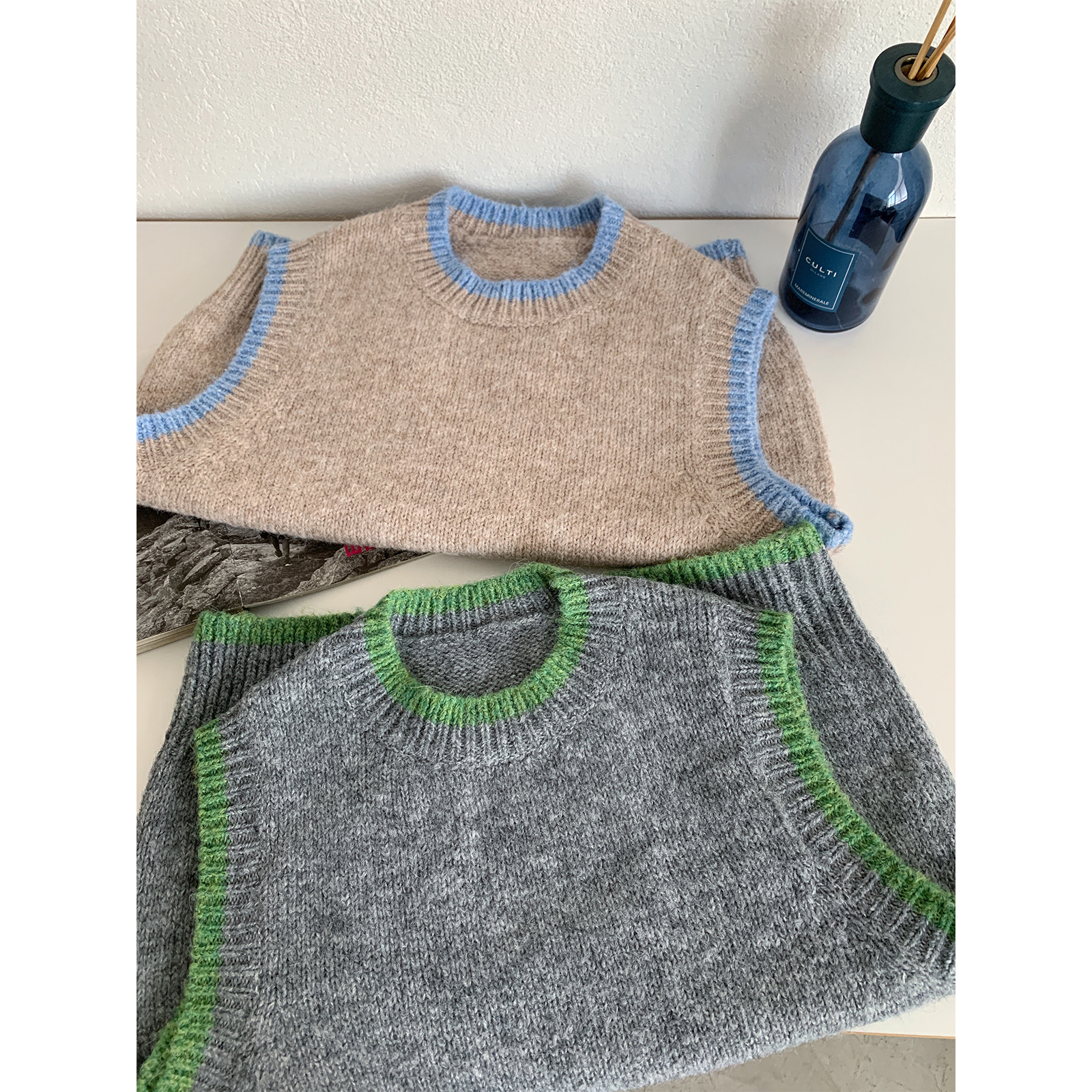 한국 스타일 색상 일치 겨울 대비 색상 둥근 목 풀오버 조끼 여성의 느슨한 슬리밍 스택 스웨터 민소매 코트스토어 가기