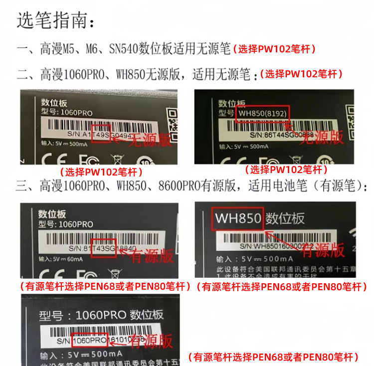 注:有源意思是笔需要充电或者是装电池,有源和无源不能跨界使用,笔杆的频率不匹配。例:如果您1060pro的笔需要充电,即选PEN80或者装电池笔杆PEN68, 如您1060pro的笔不用充电,即选PW102。 如您的笔是无源笔却选择有源笔的链接,最终无法使用本店概不负责。