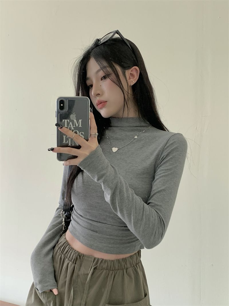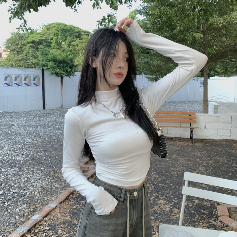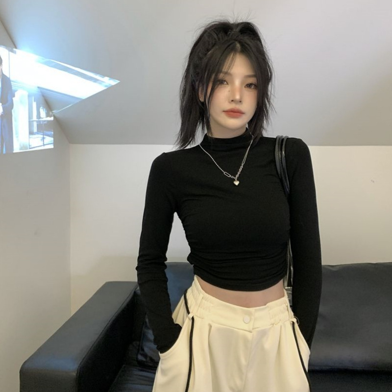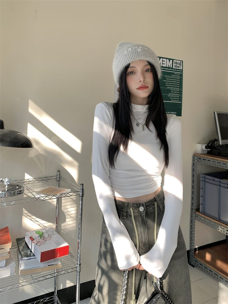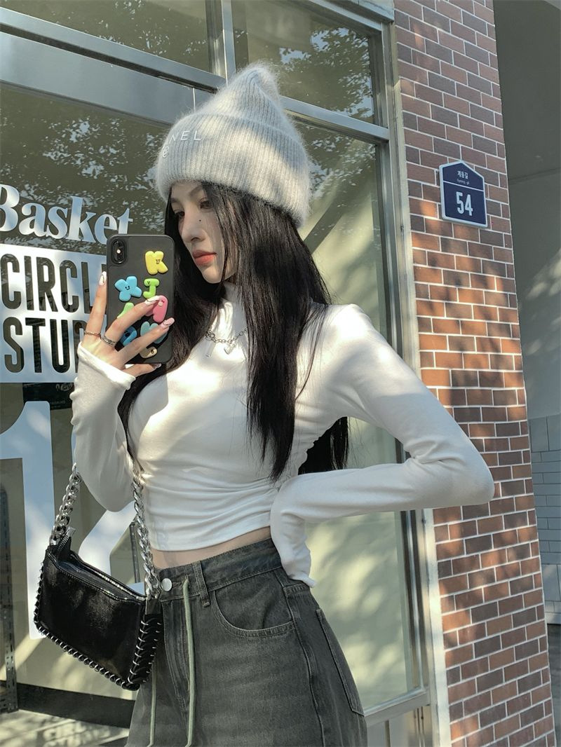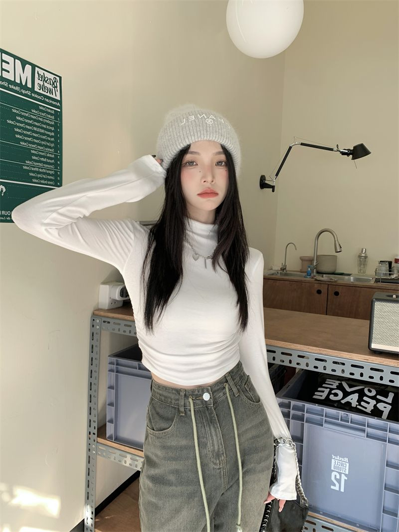데롱 하프 터틀넥 이너웨어 티셔츠 여성용 가을 겨울 슬림핏 주름 디자인 순수한 스타일 긴팔 숏탑 보온 상의스토어 가기