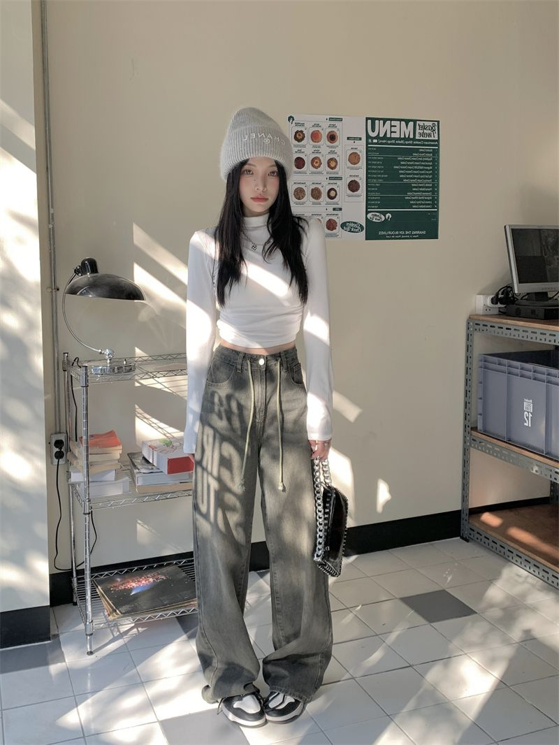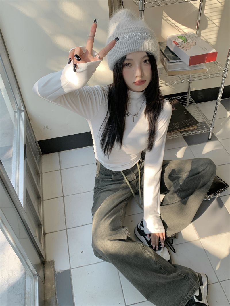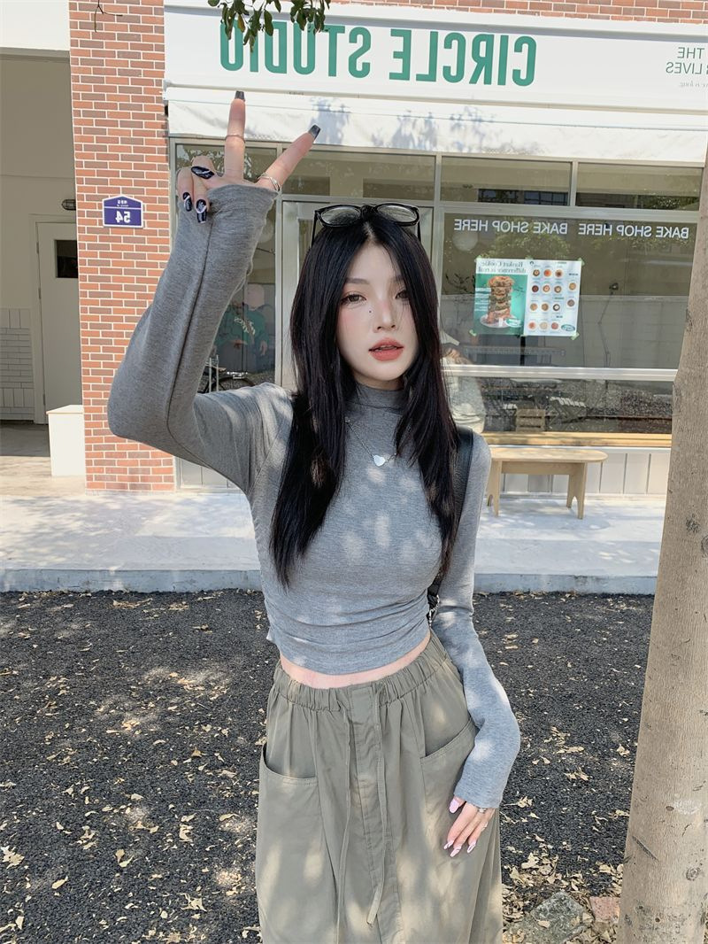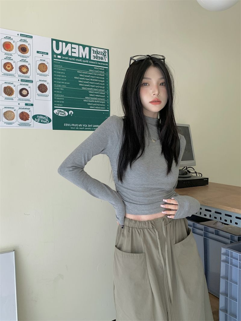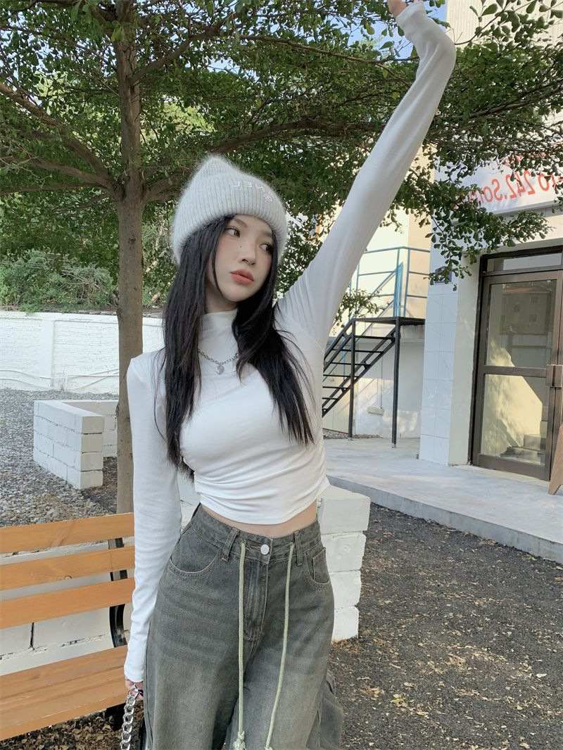 데롱 하프 터틀넥 이너웨어 티셔츠 여성용 가을 겨울 슬림핏 주름 디자인 순수한 스타일 긴팔 숏탑 보온 상의스토어 가기