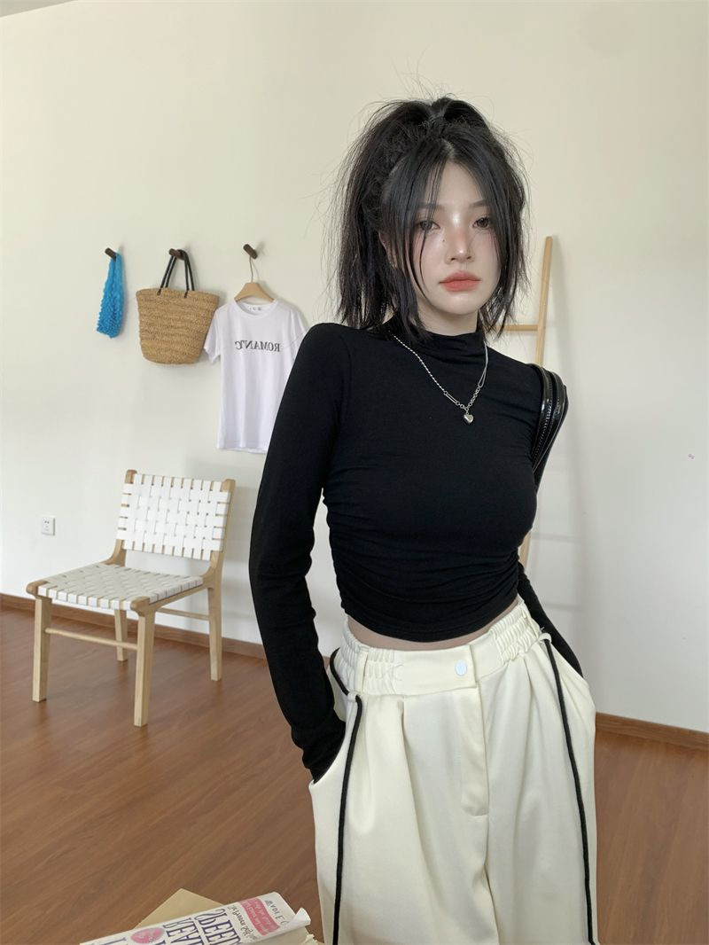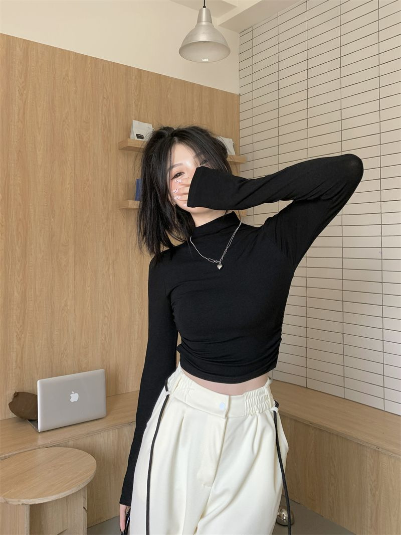 데롱 하프 터틀넥 이너웨어 티셔츠 여성용 가을 겨울 슬림핏 주름 디자인 순수한 스타일 긴팔 숏탑 보온 상의