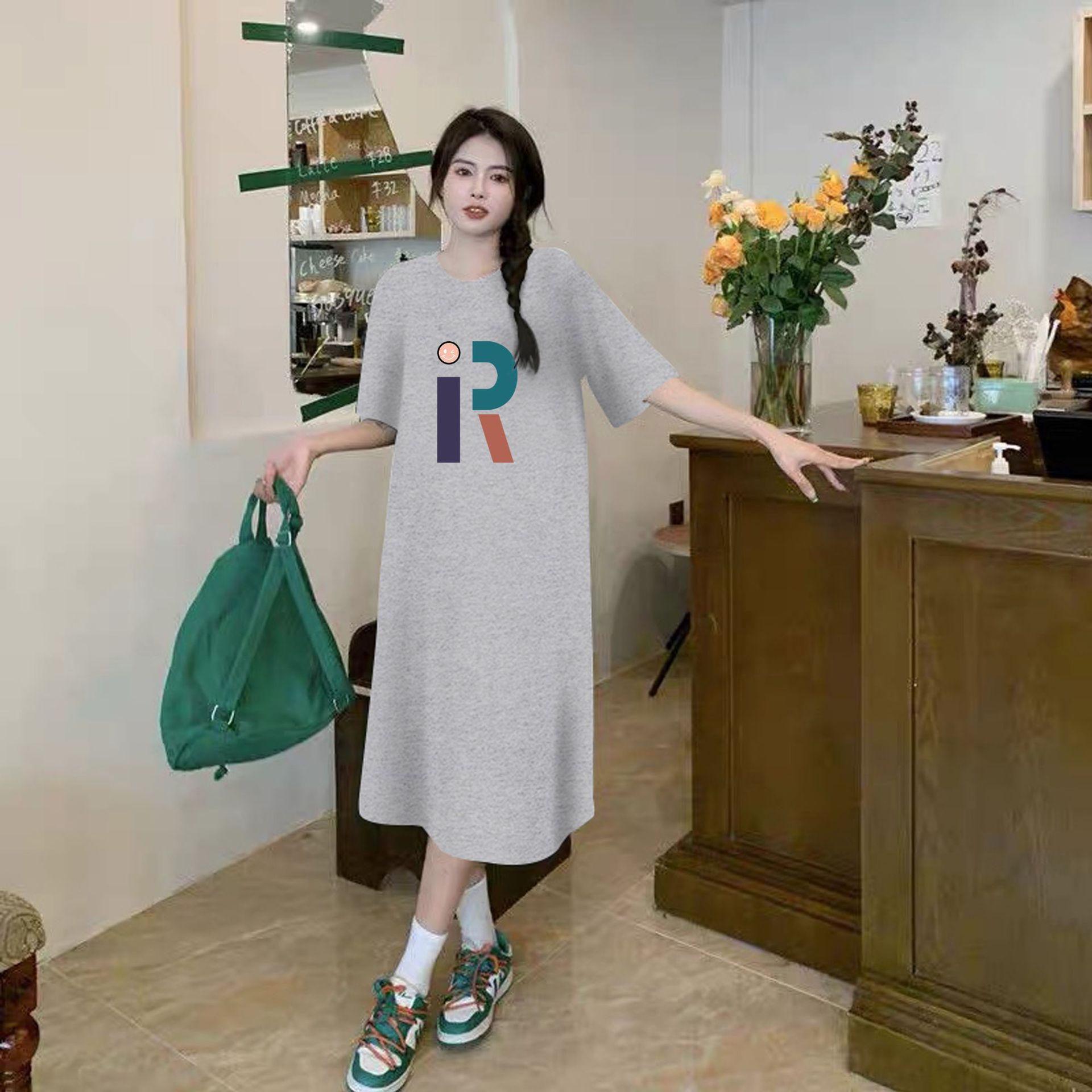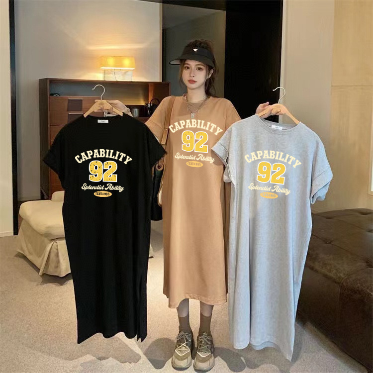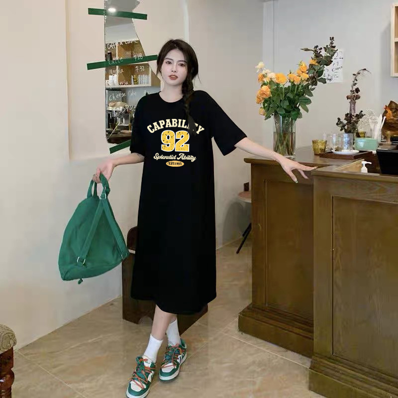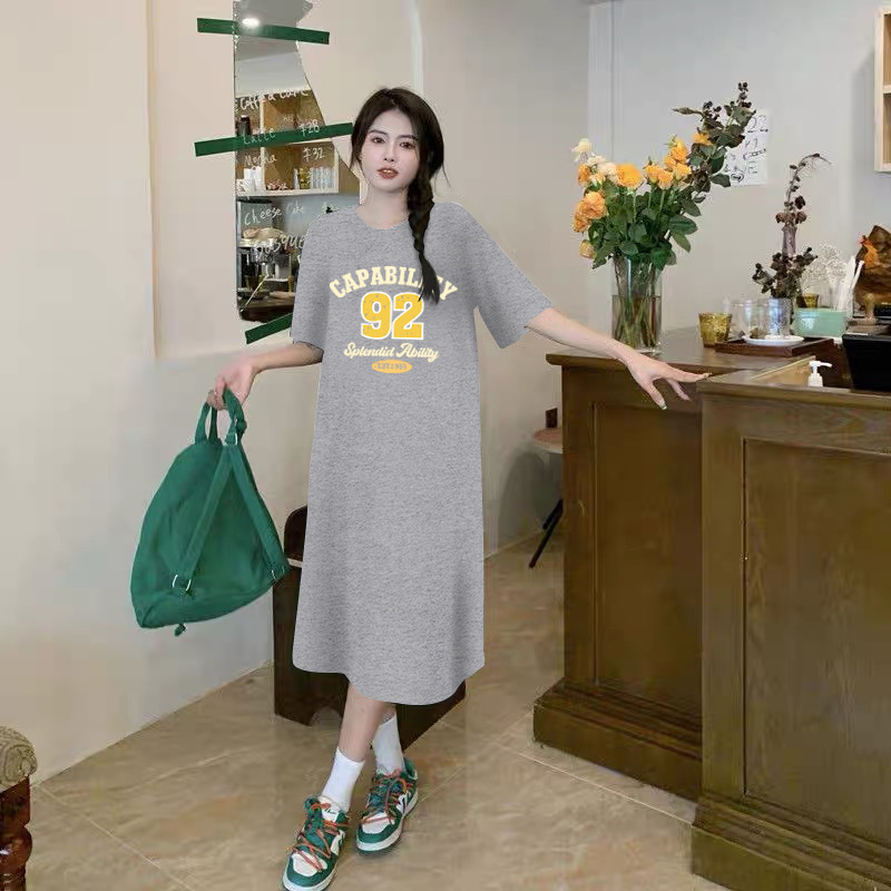 여성을위한 캐주얼 라운드 넥 짧은 소매 티셔츠 원피스 한국 스타일 느슨한 플러스 사이즈 중간 길이 원피스 오버 더 무릎 원피스 여름 패션스토어 가기