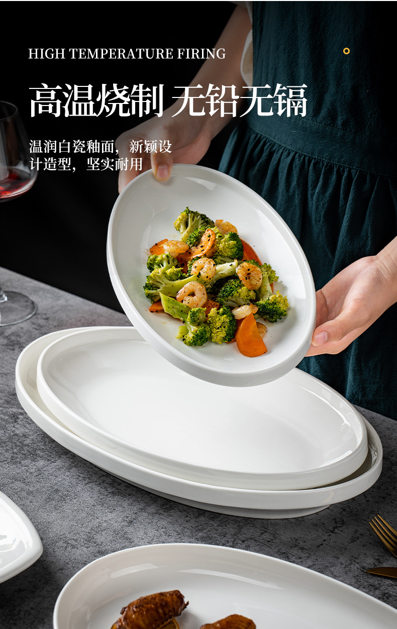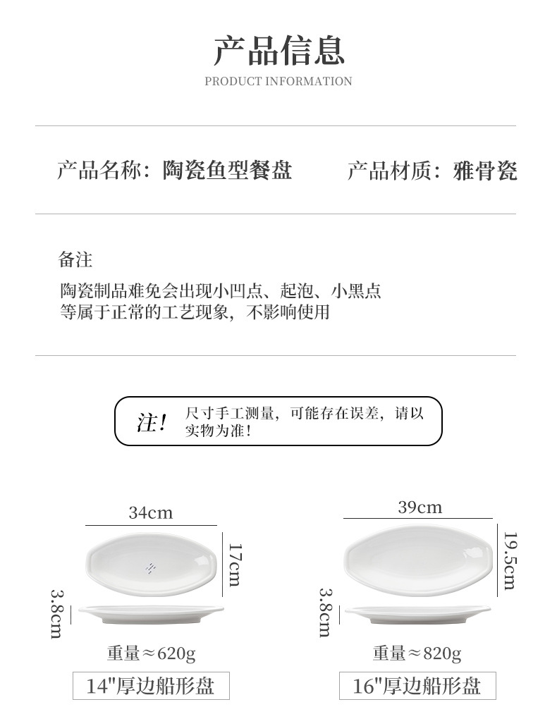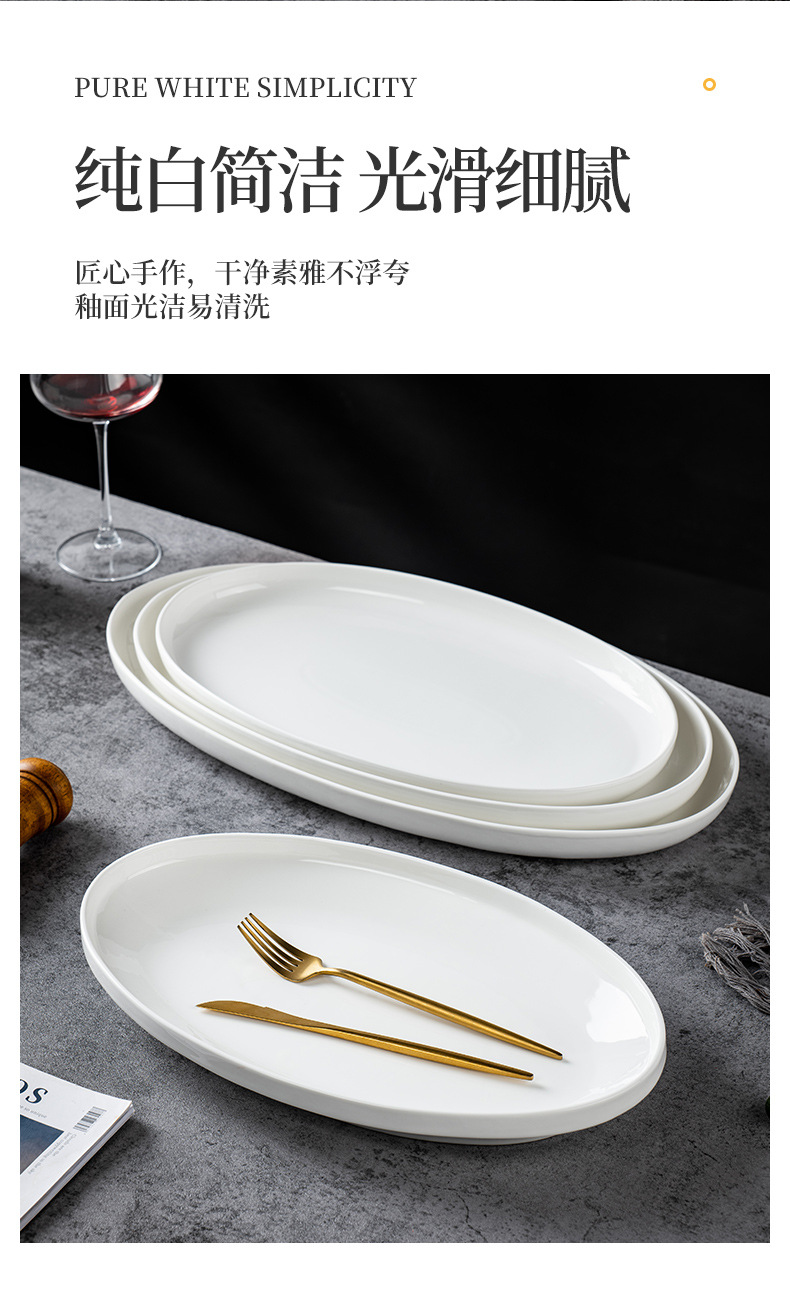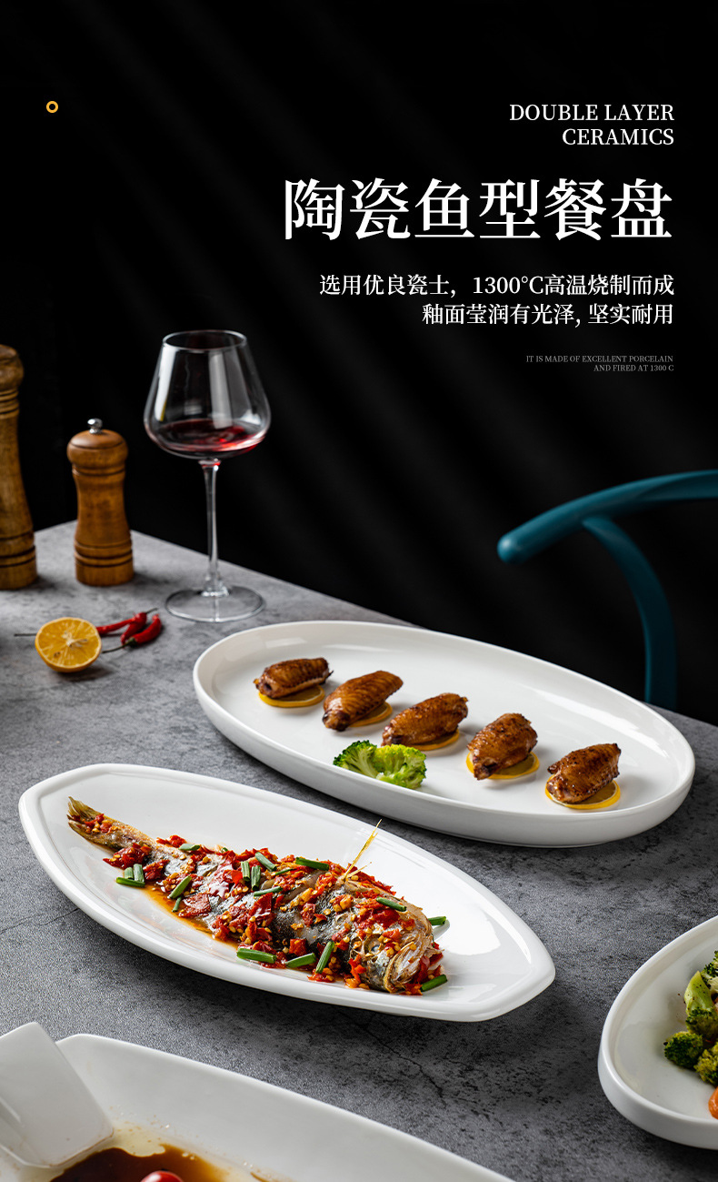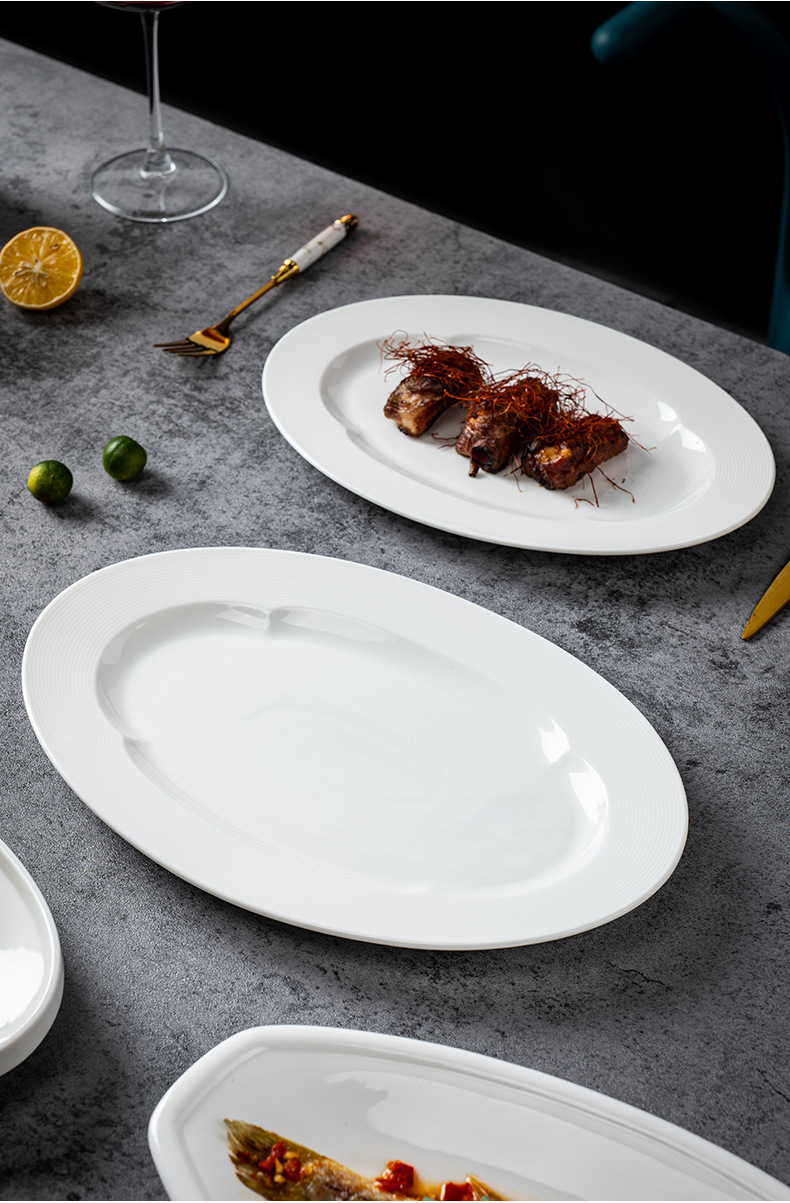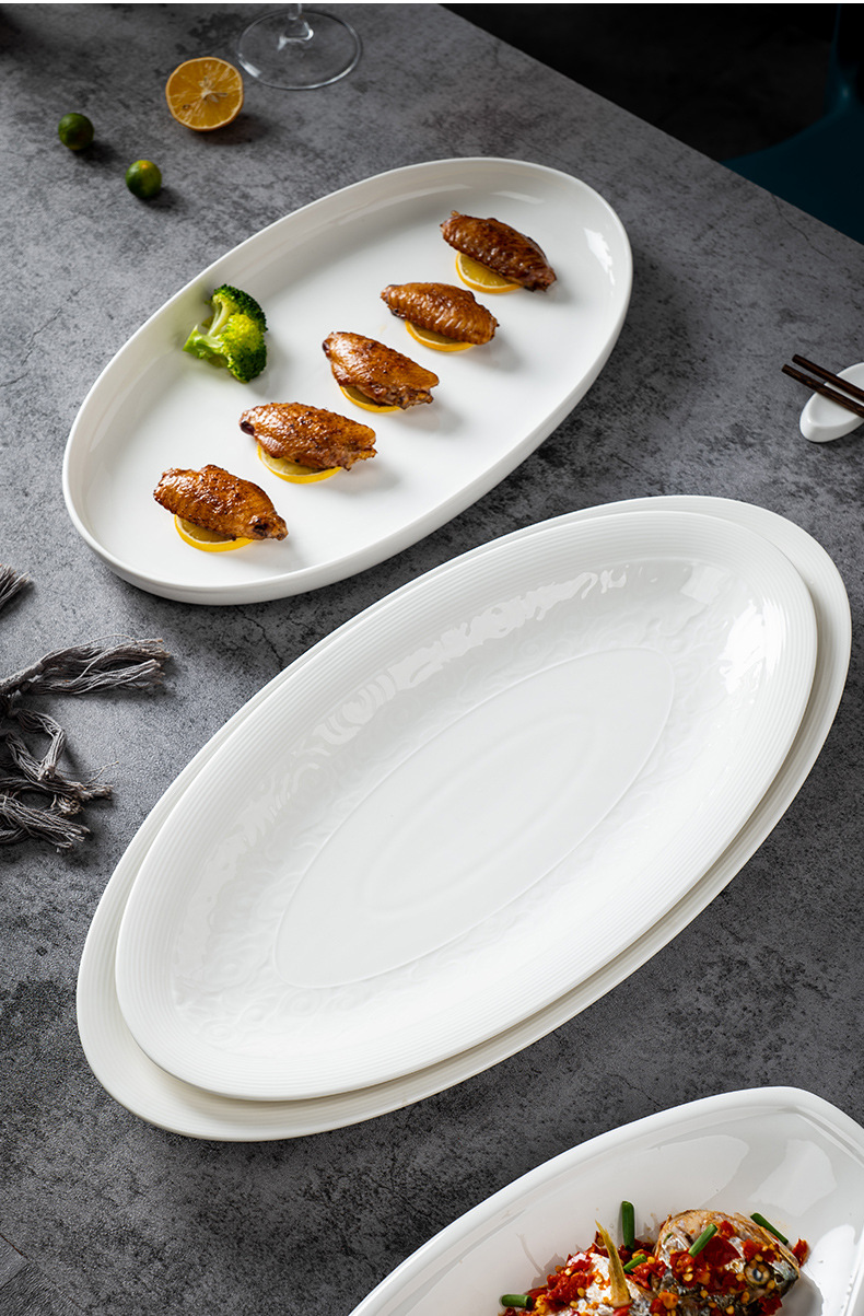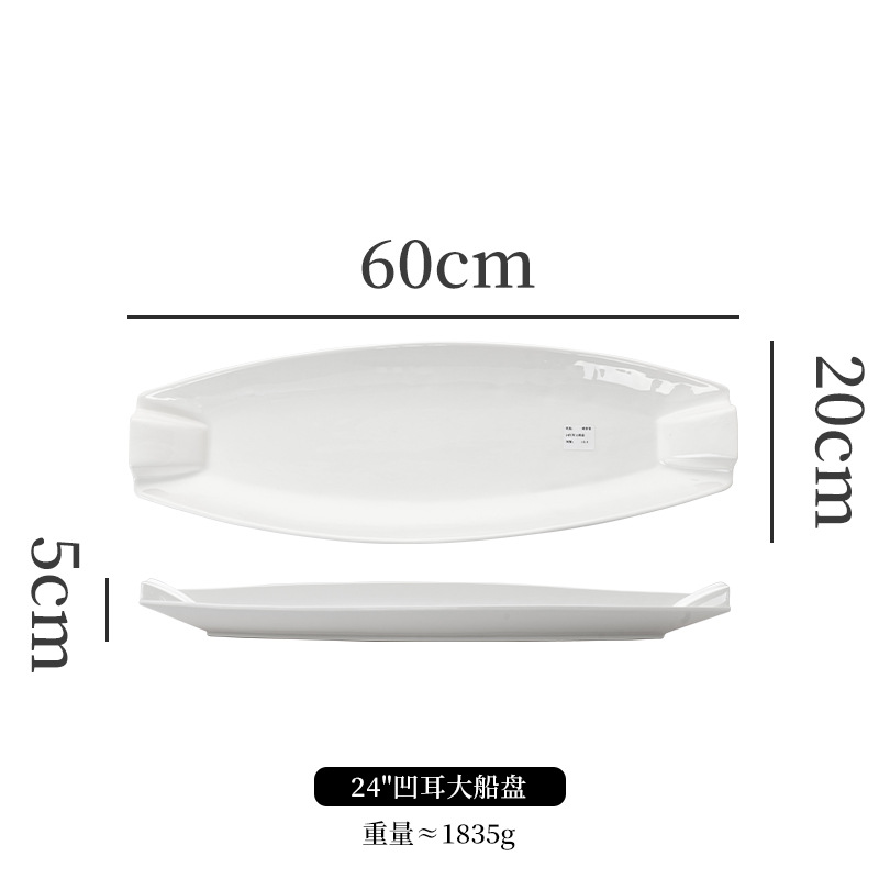 순수한 흰색 세라믹 생선 접시 호텔 큰 긴 접시 레스토랑 클럽 큰 물고기 접시 보트 모양의 접시 태국 레몬 생선 접시