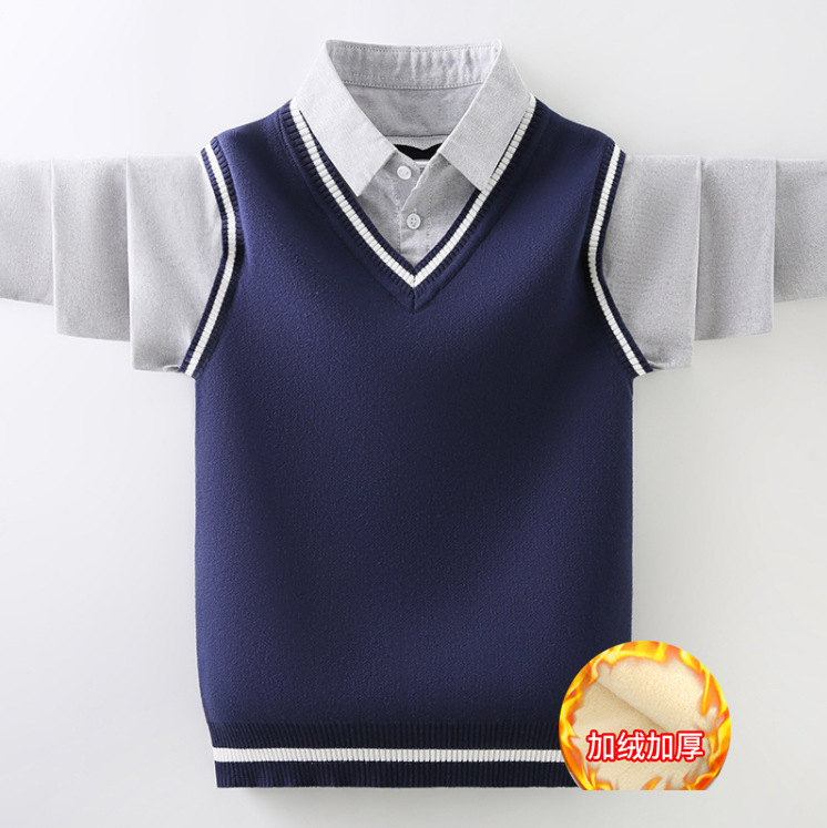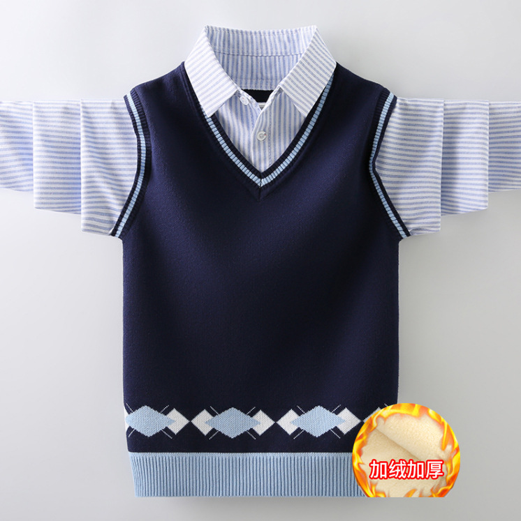 소년 스웨터 순면 2023 새로운 봄, 가을, 겨울 어린이 소년 스웨터 중대형 어린이 셔츠 칼라 가짜 투피스 T