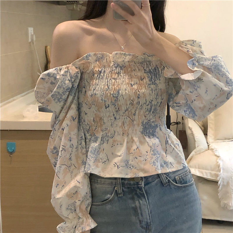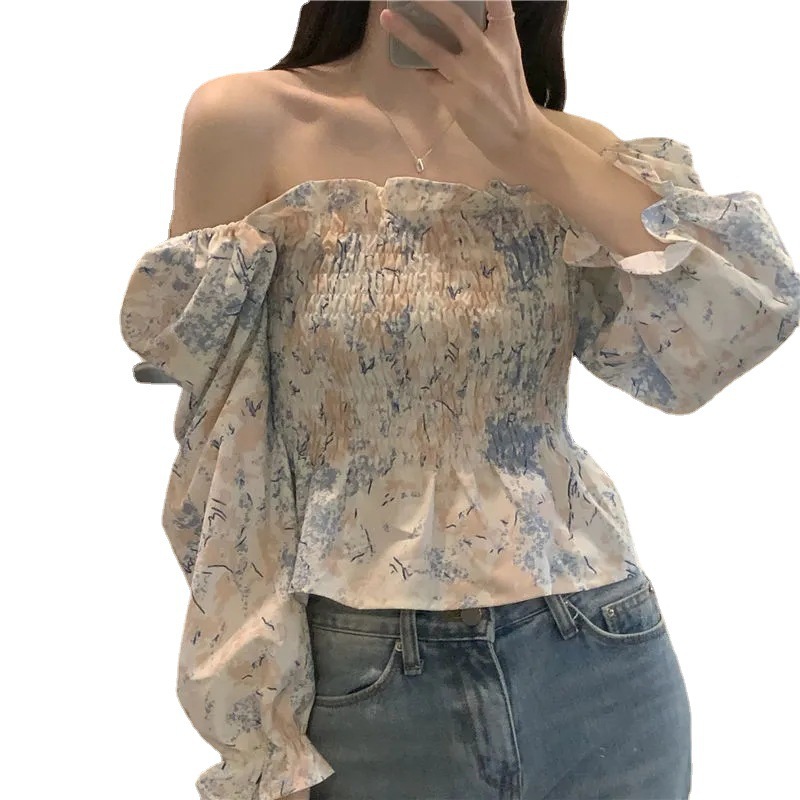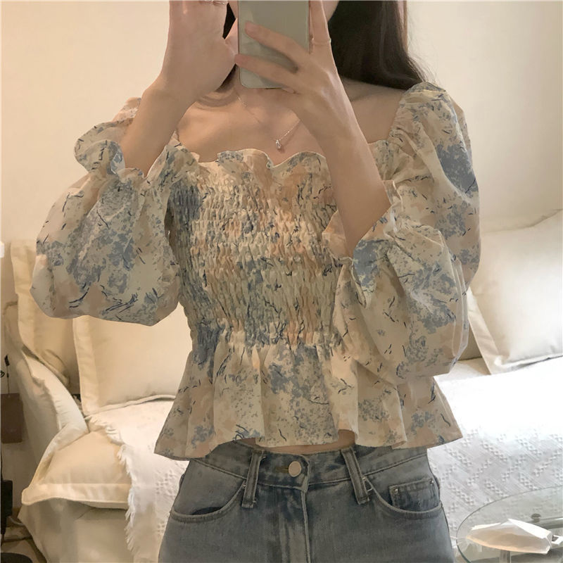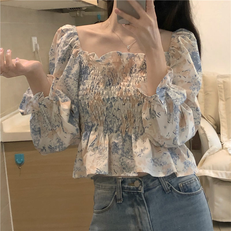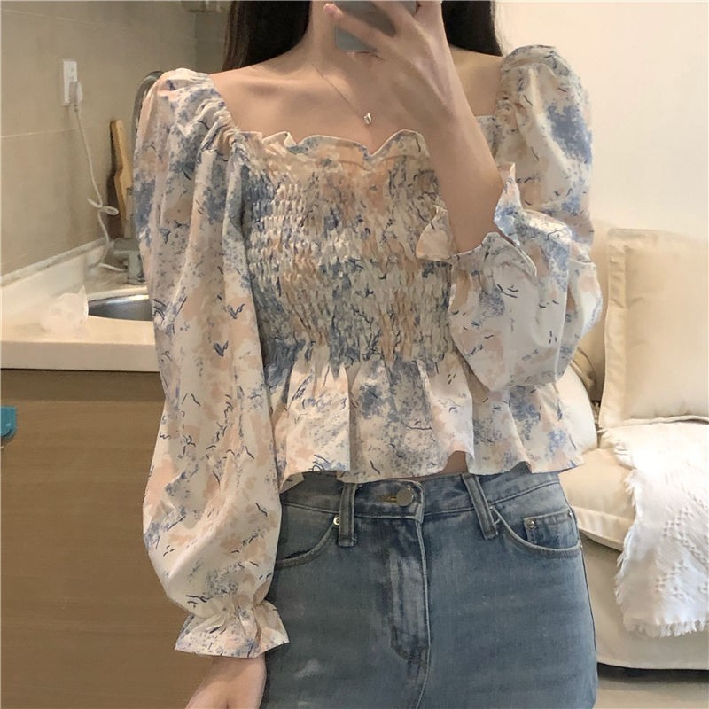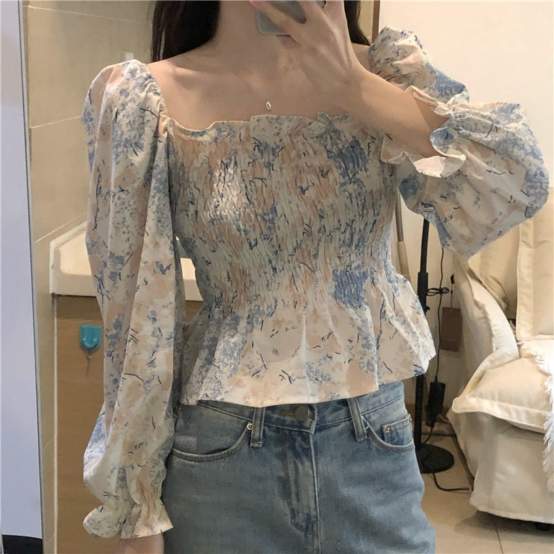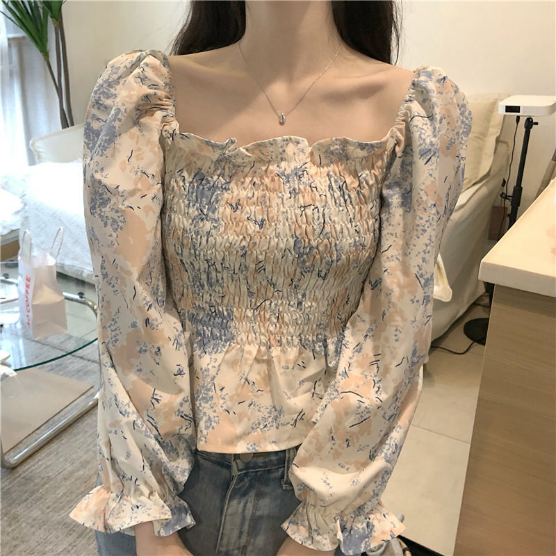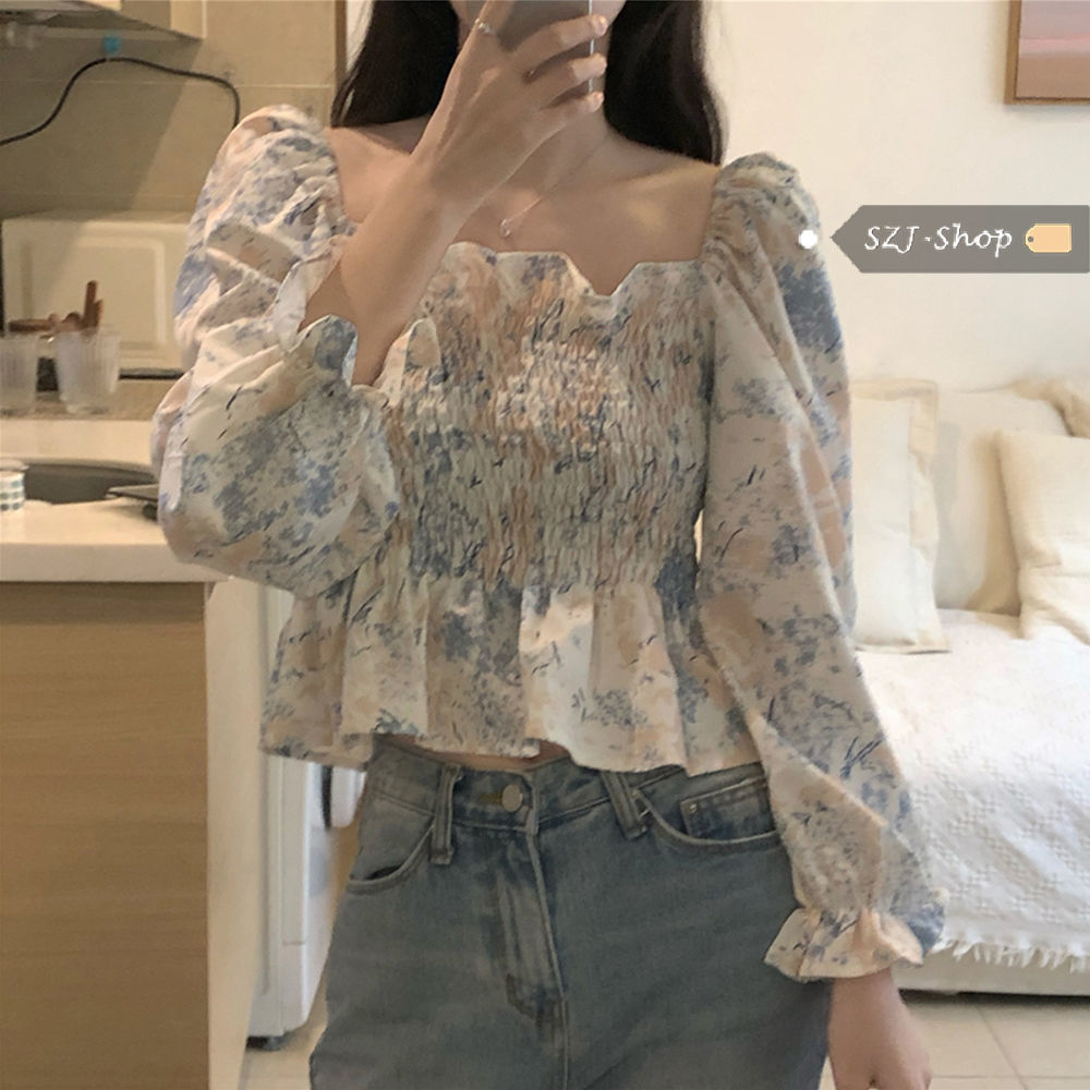 프랑스 스타일 스퀘어 칼라 긴 소매 쉬폰 셔츠 최고 여성 봄과 가을 새로운 스타일의 나무 귀 짧은 슬리밍 플로럴 셔츠스토어 가기