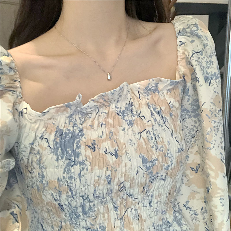 프랑스 스타일 스퀘어 칼라 긴 소매 쉬폰 셔츠 최고 여성 봄과 가을 새로운 스타일의 나무 귀 짧은 슬리밍 플로럴 셔츠