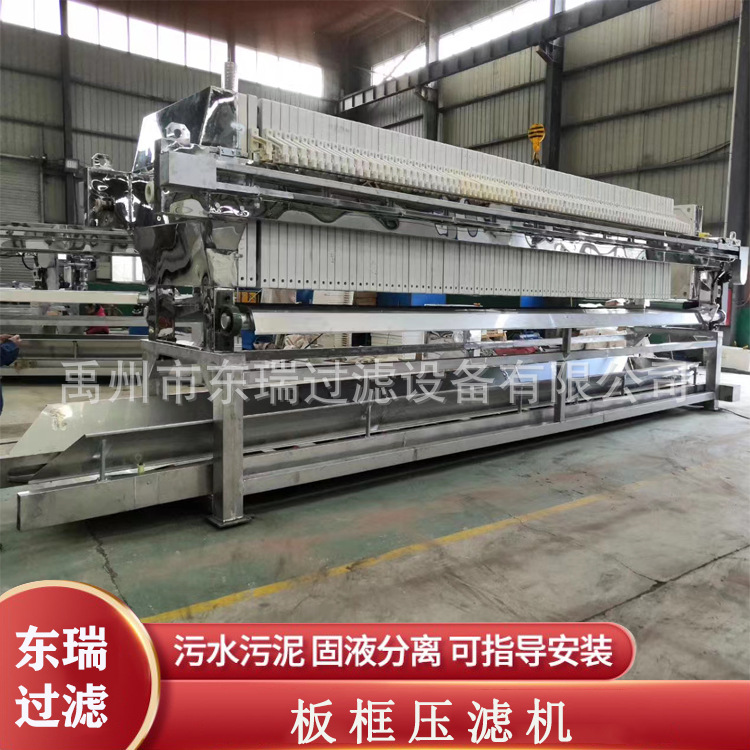 工作原理:工作前将滤布套在滤板上,然后操作压滤机,驱动压紧装置,将压滤机紧紧地压紧滤板。启动进料泵将物料通过进料口输入压滤机,物料通过滤板上的通道进入滤室,在进料泵压力的作用下,溶液透过滤布进入滤板上密布的圆点式滤面。再通过滤板上的通道进入出液口汇集后由出液口流出。而滤饼被截留在滤室中,直至滤饼充满滤室,然后停止进料泵,松开压紧板,再将滤板一块一块的拉往压紧板方向,卸掉滤板中的滤饼,再重新进入下一个工作循环。