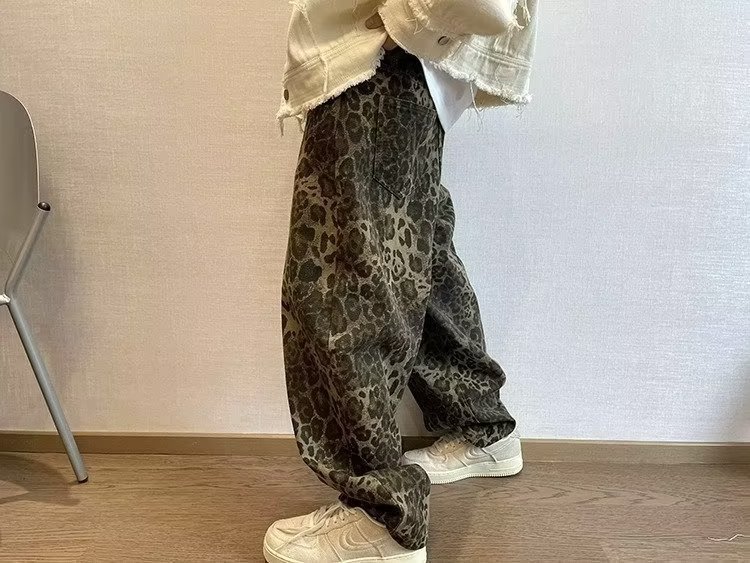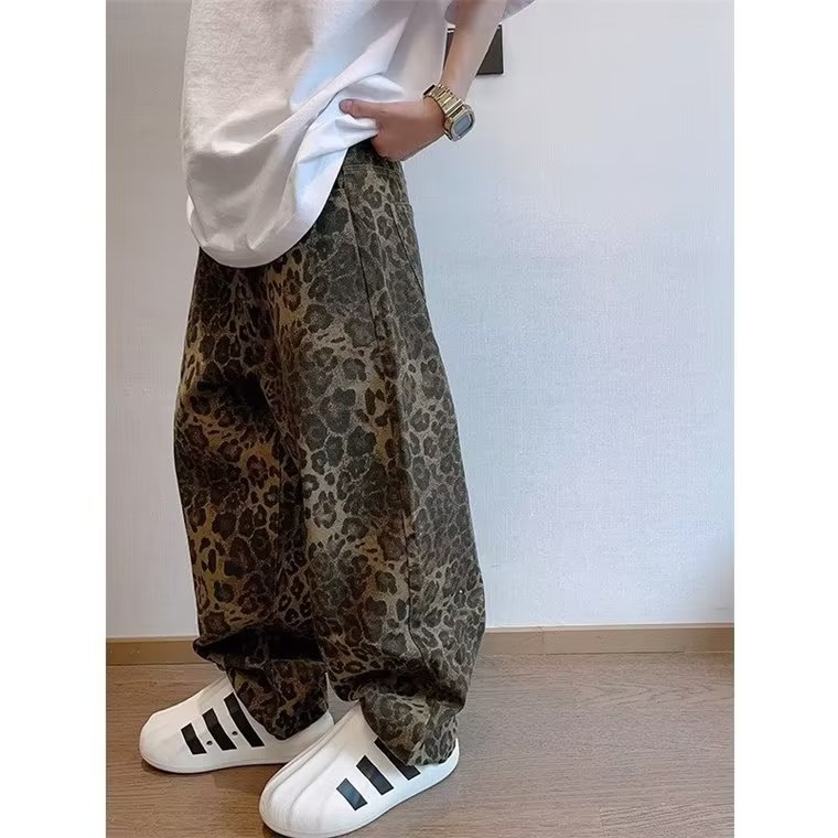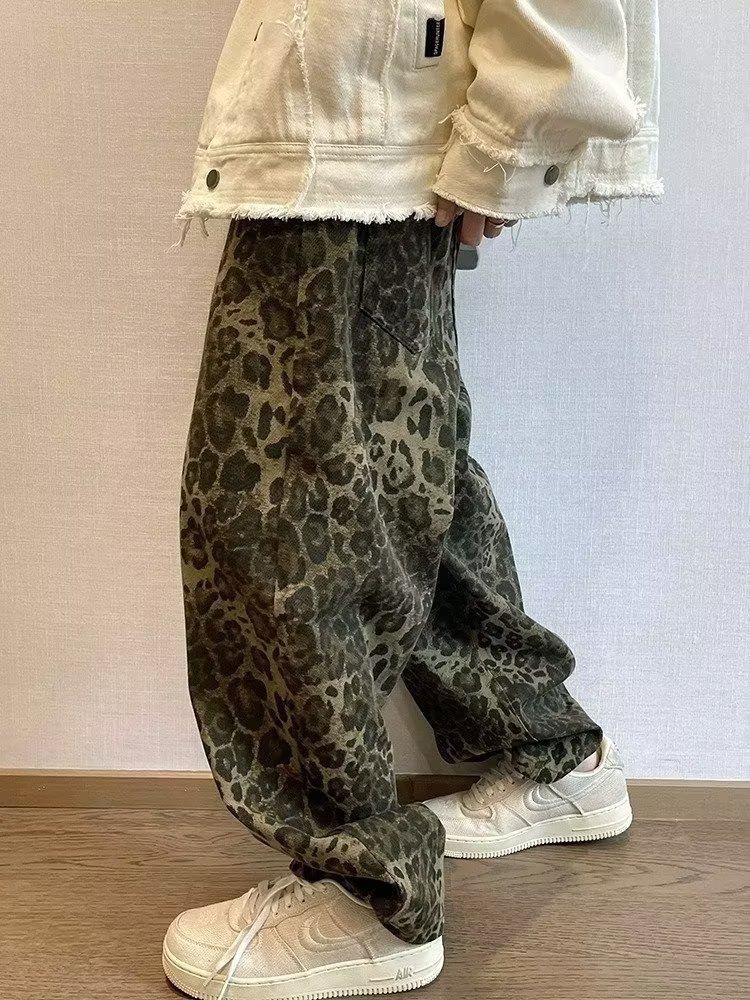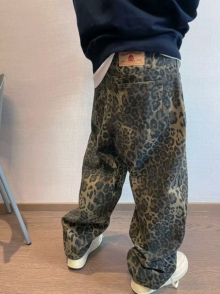 아메리칸 스트리트 청바지 남자 봄과 가을 트렌디 브랜드 틈새 풀린 올매치 핸섬 레오파드 무늬 와이드 레그 스트레이트 바지스토어 가기