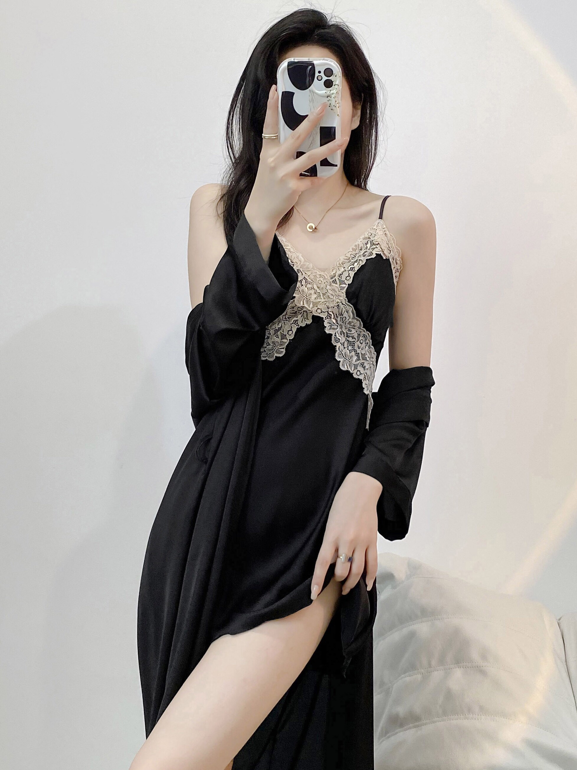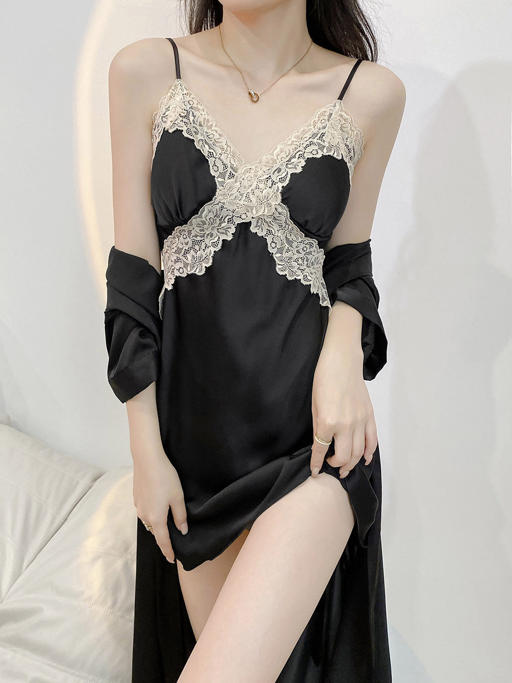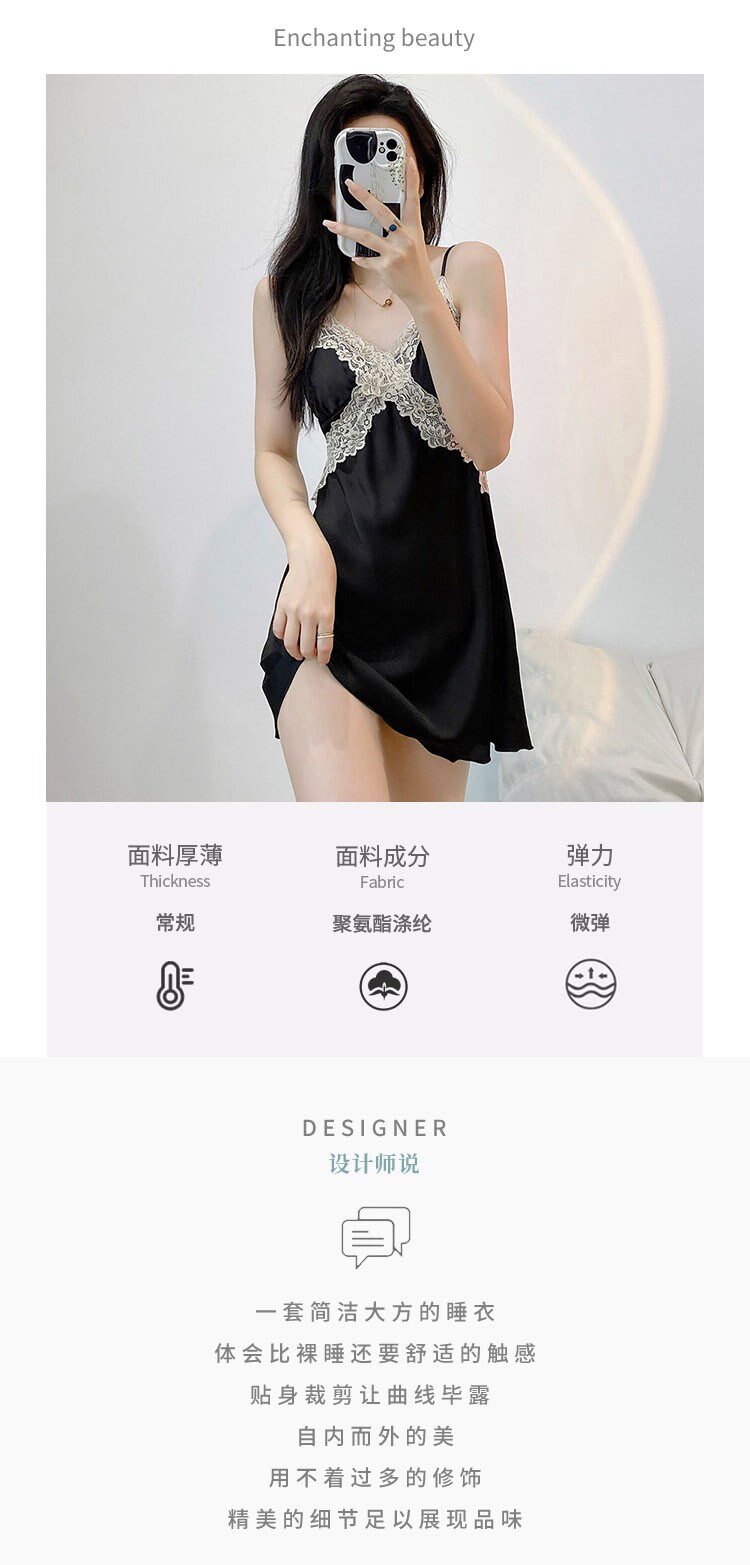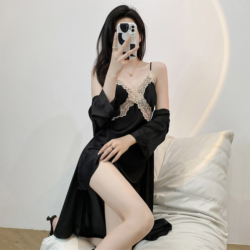 잠옷 여성의 봄과 여름 아이스 실크 긴팔 스트랩 잠옷 세트 가을과 겨울 고급 레이스 매혹적인 홈웨어스토어 가기