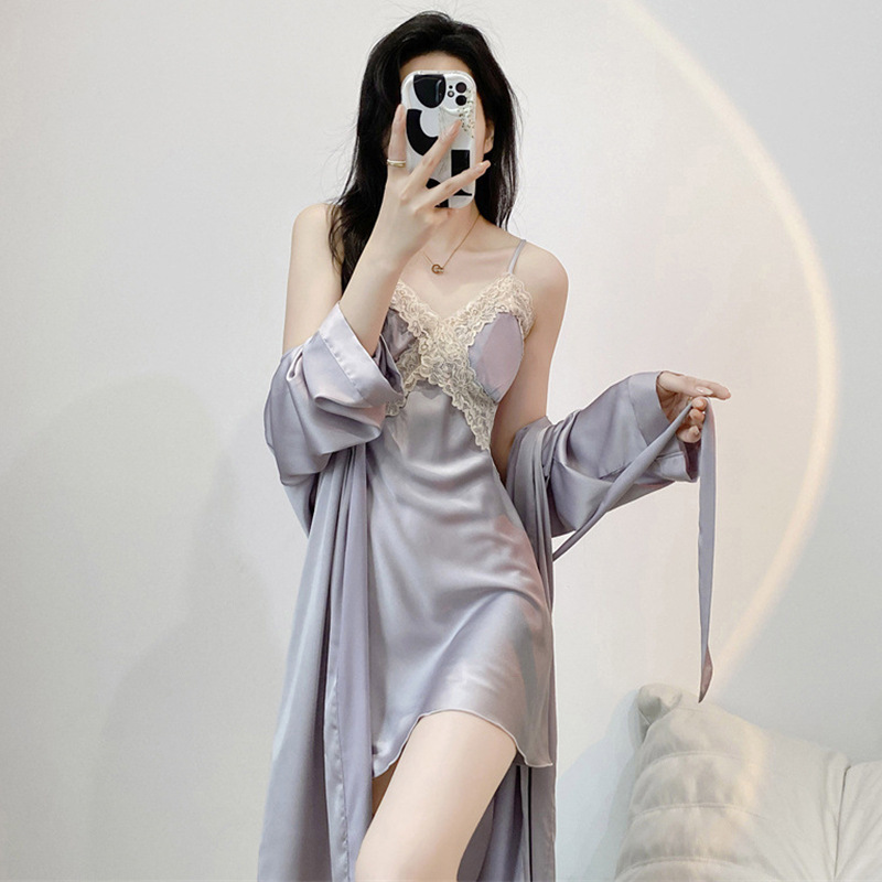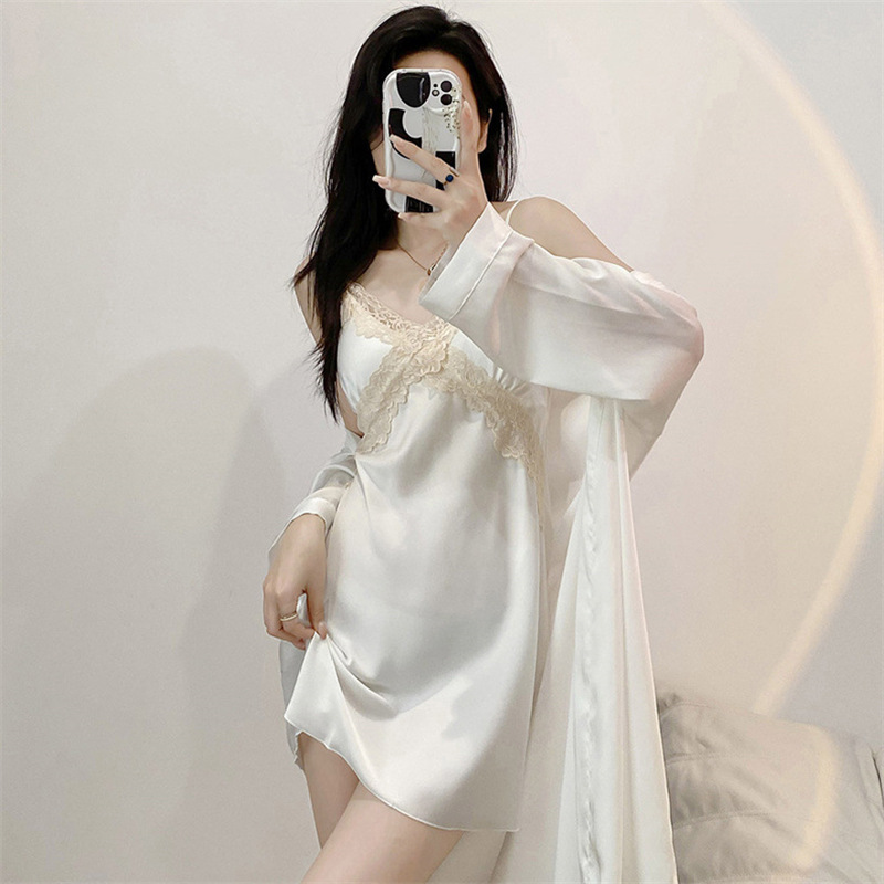 잠옷 여성의 봄과 여름 아이스 실크 긴팔 스트랩 잠옷 세트 가을과 겨울 고급 레이스 매혹적인 홈웨어
