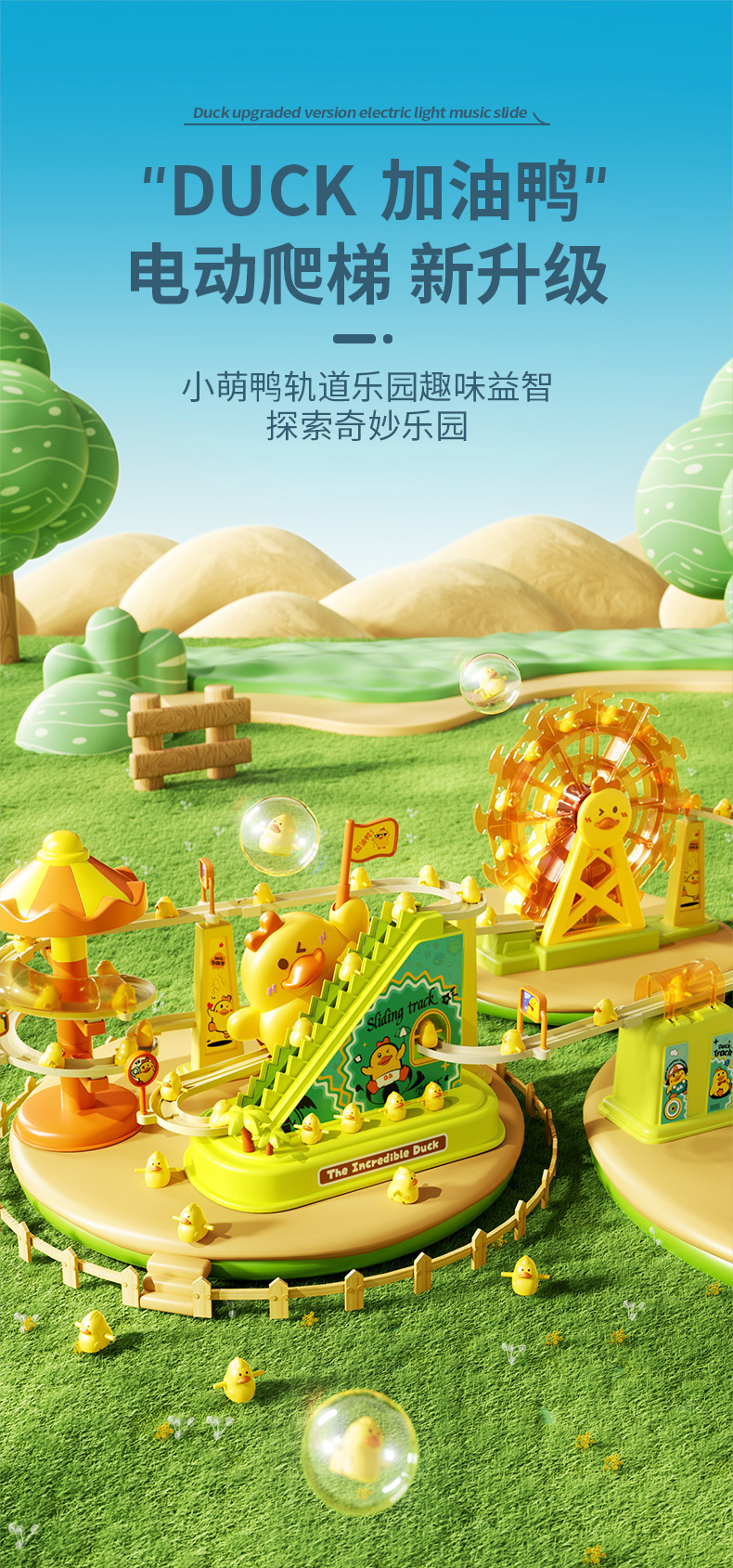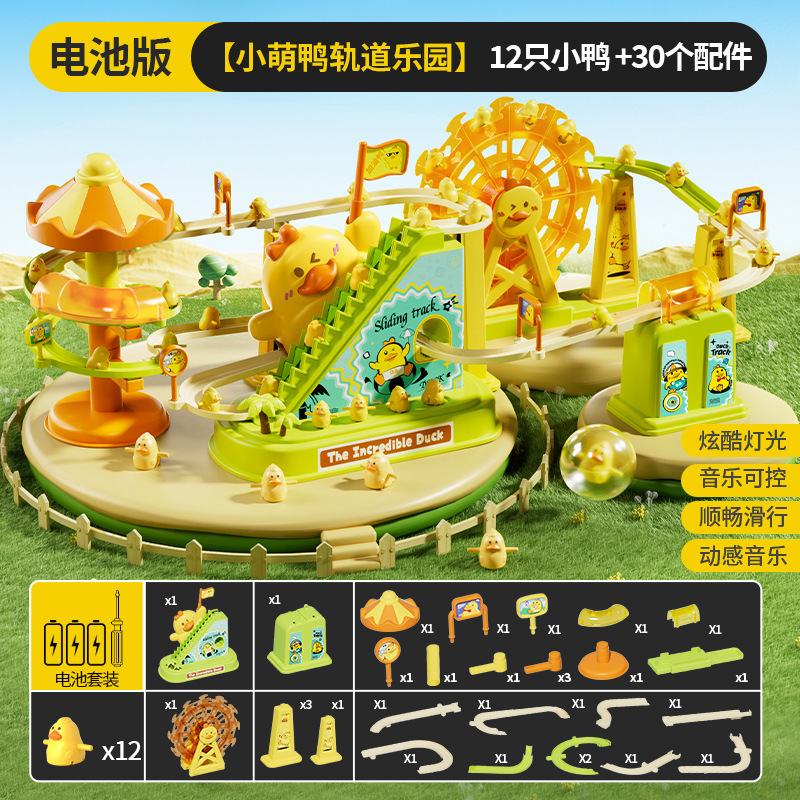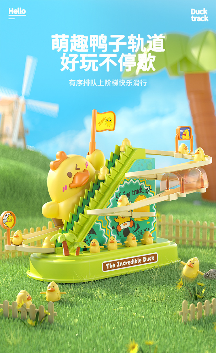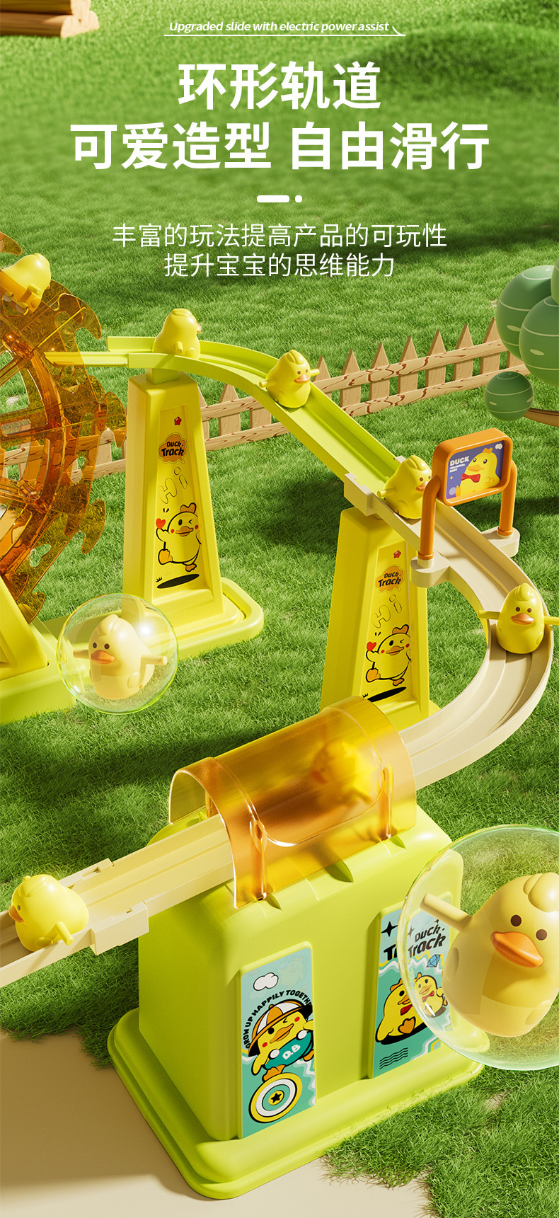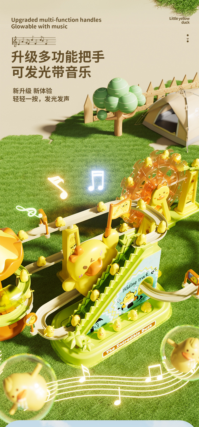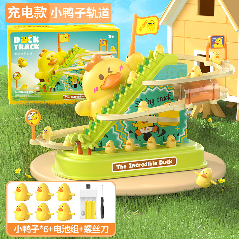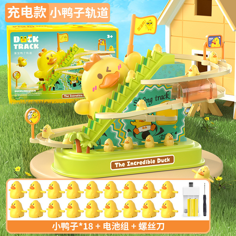 급유 오리 어린이 교육 트랙 장난감 회전 슬라이드 전기 노란색 오리 등반 계단 음악 컬러 박스 도매스토어 가기
