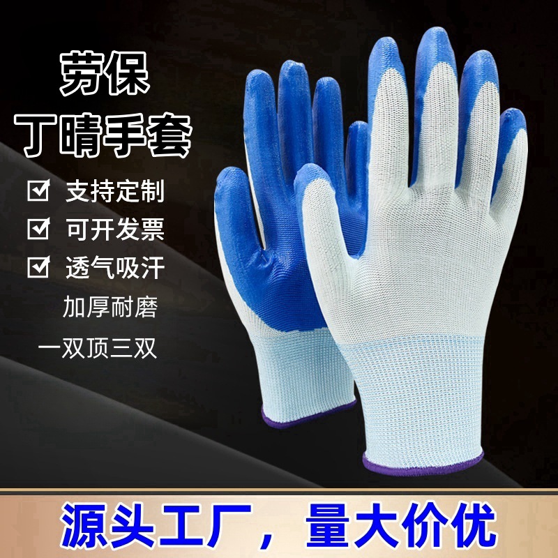 공장 직접 보호 니트릴 장갑 담근 정원 내마모성 고무 흰색 라인 블루 니트릴 매달려 고무 작업 장갑스토어 가기