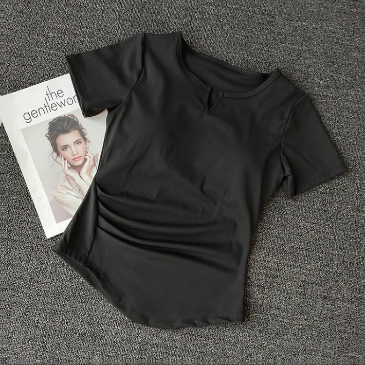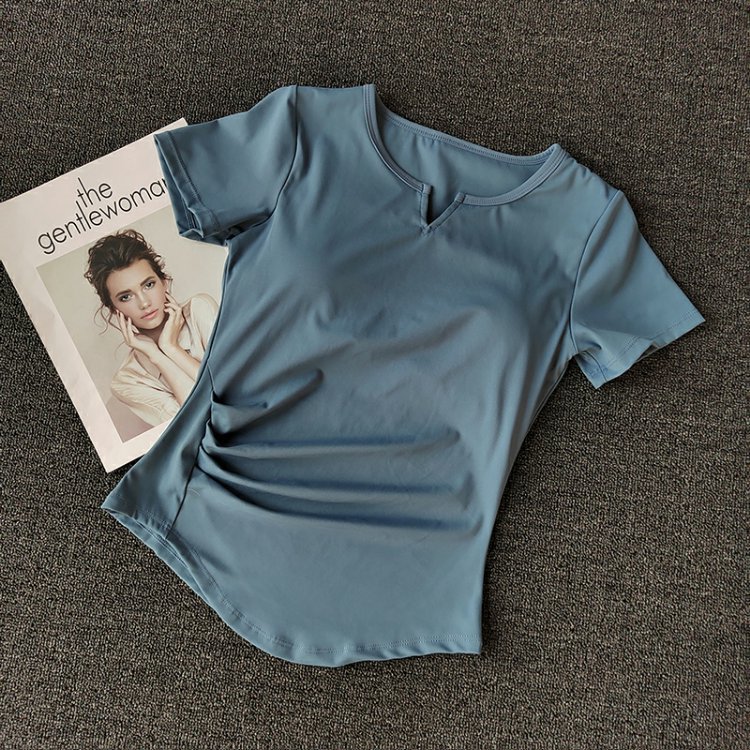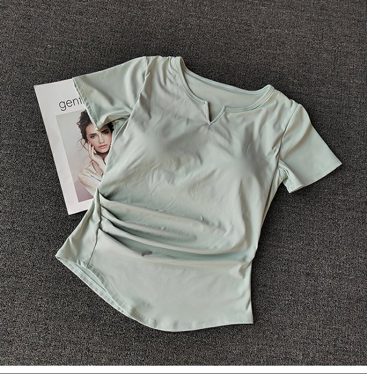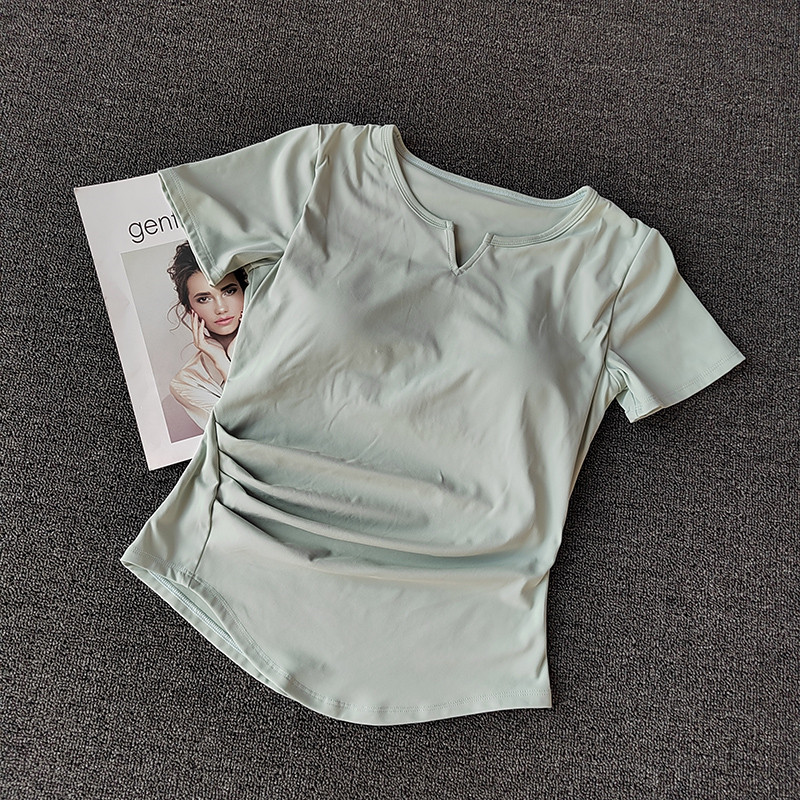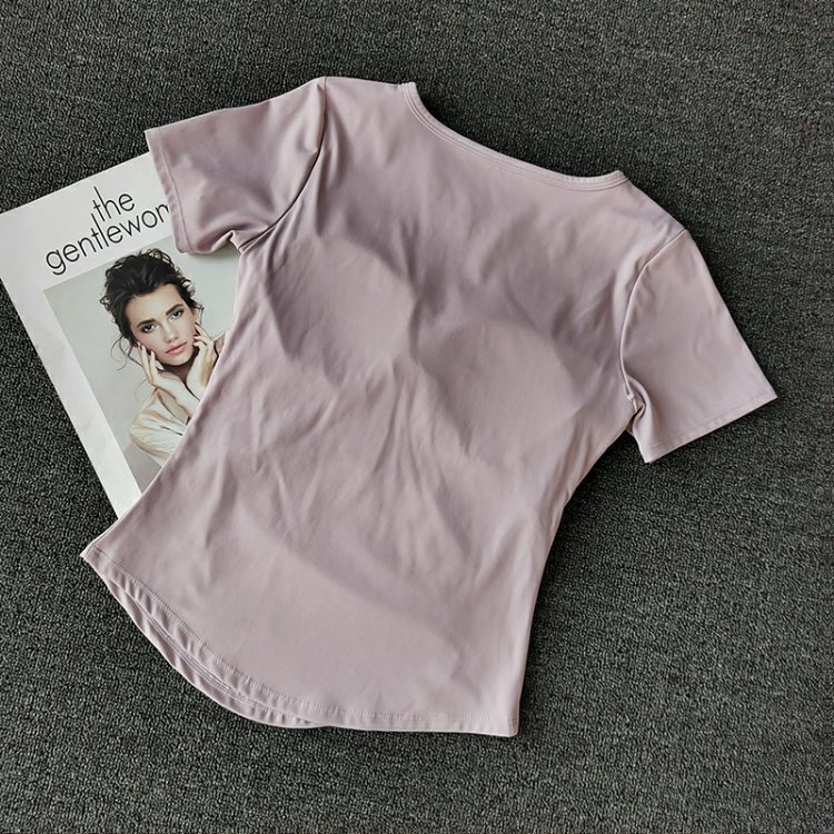디자인 센스 짧은 소매 가슴 패드 유럽과 미국 스포츠 티셔츠 여성 러닝 피트니스 탄성 외부 착용 슬리밍 탑 요가 옷스토어 가기