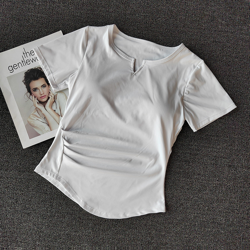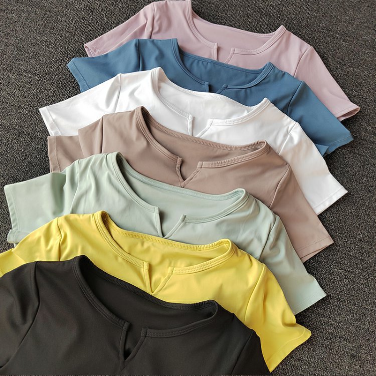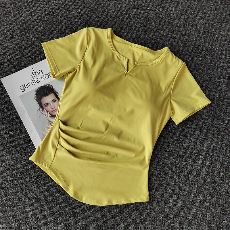 디자인 센스 짧은 소매 가슴 패드 유럽과 미국 스포츠 티셔츠 여성 러닝 피트니스 탄성 외부 착용 슬리밍 탑 요가 옷